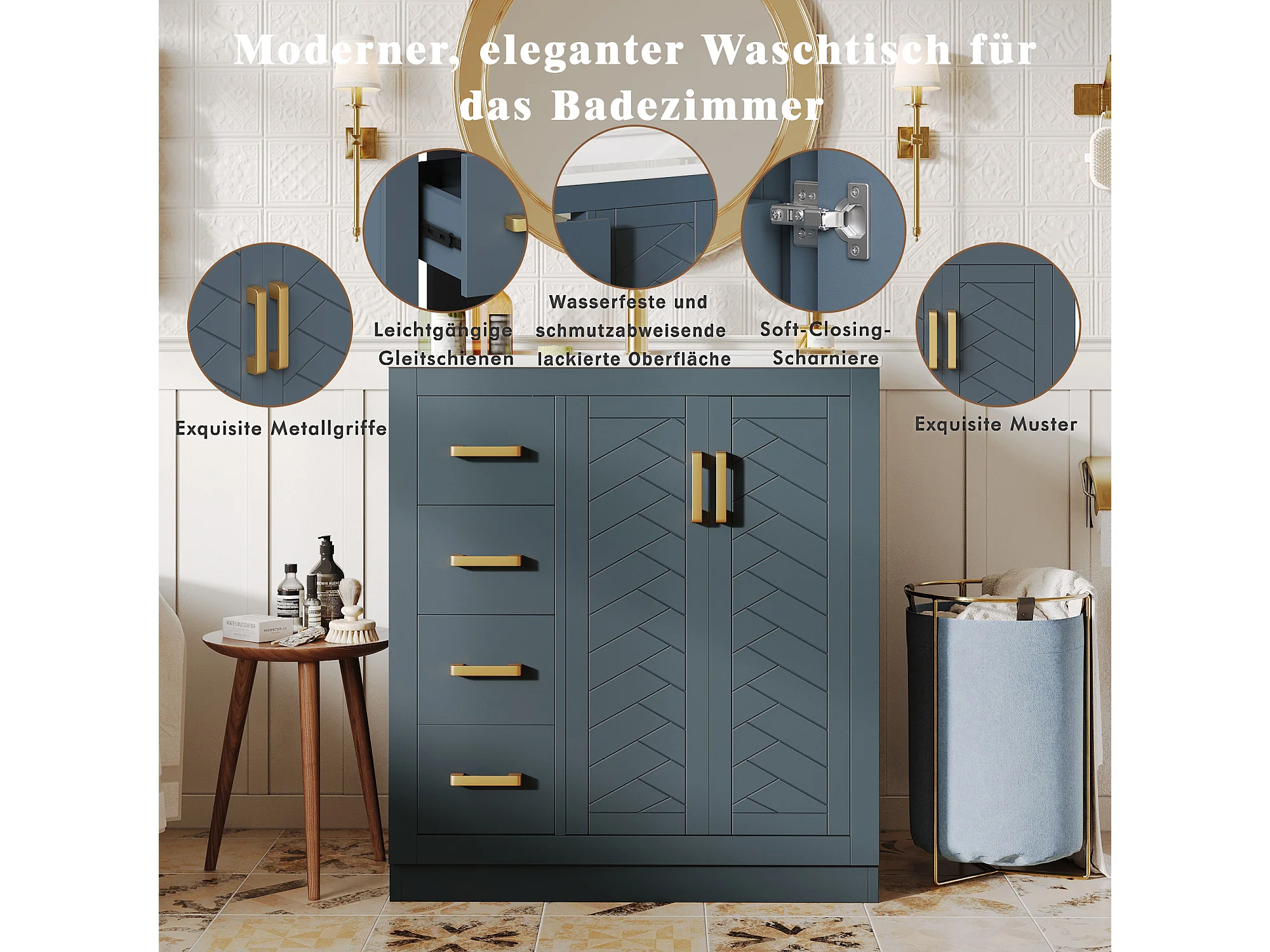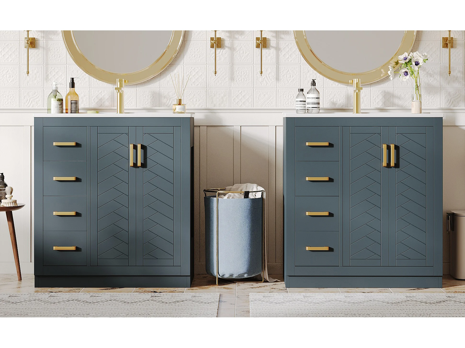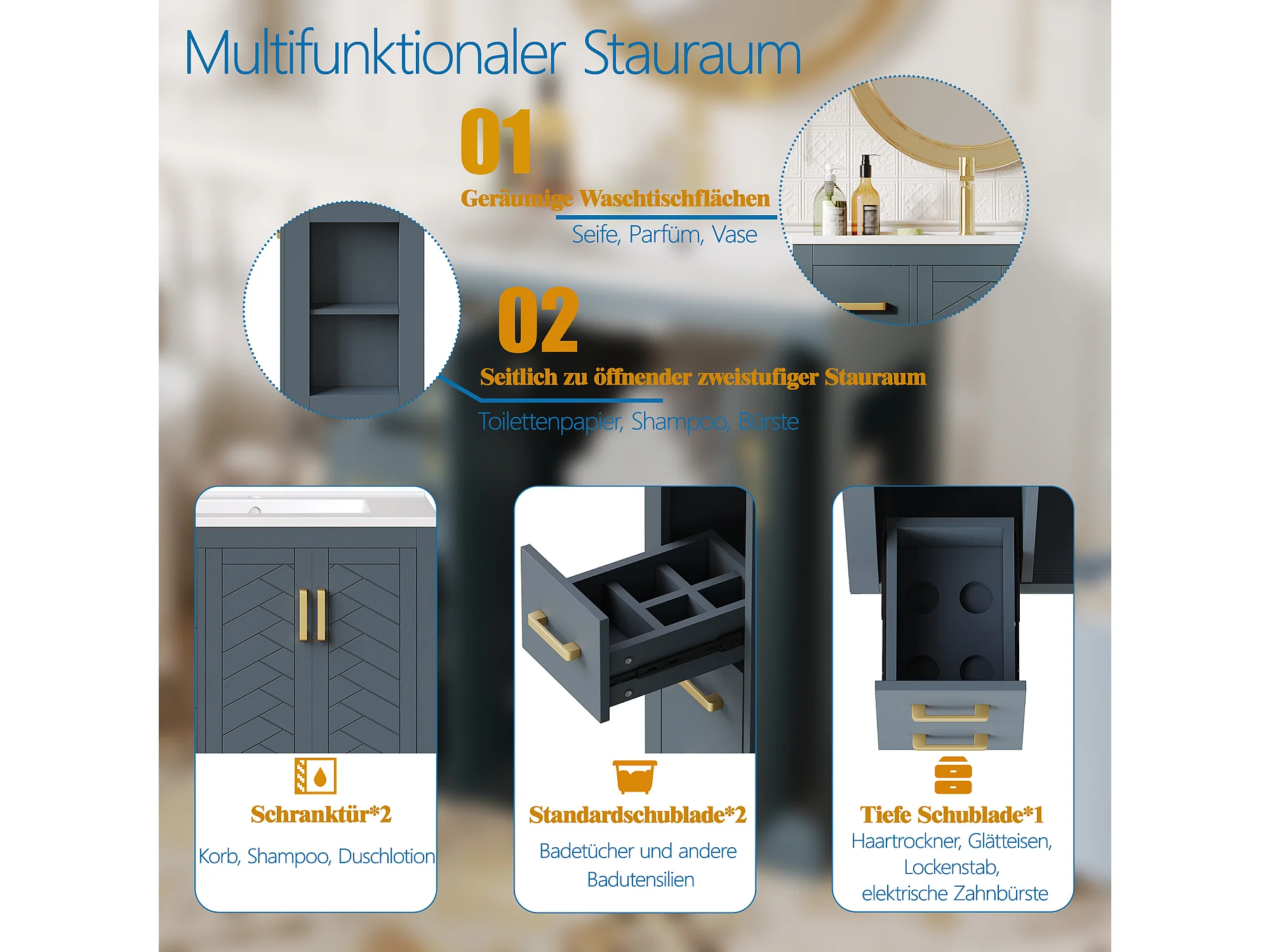 2 ceramiczne szafki łazienkowe pod umywalkę - 76,5 x 46,5 x 84,5 cm - z 3 szufladami + półką boczną + 2 drzwiami - MDF - niebieskie