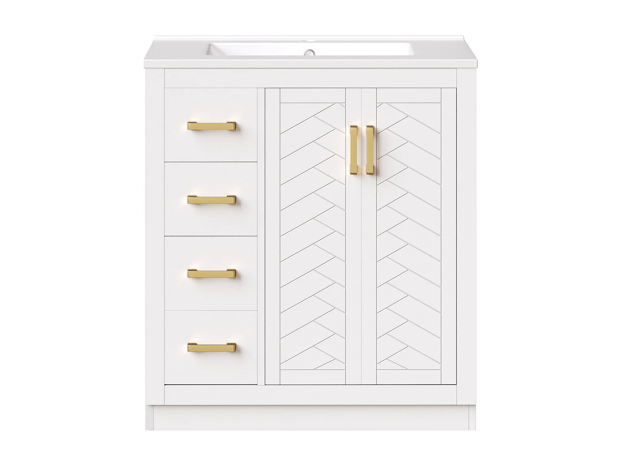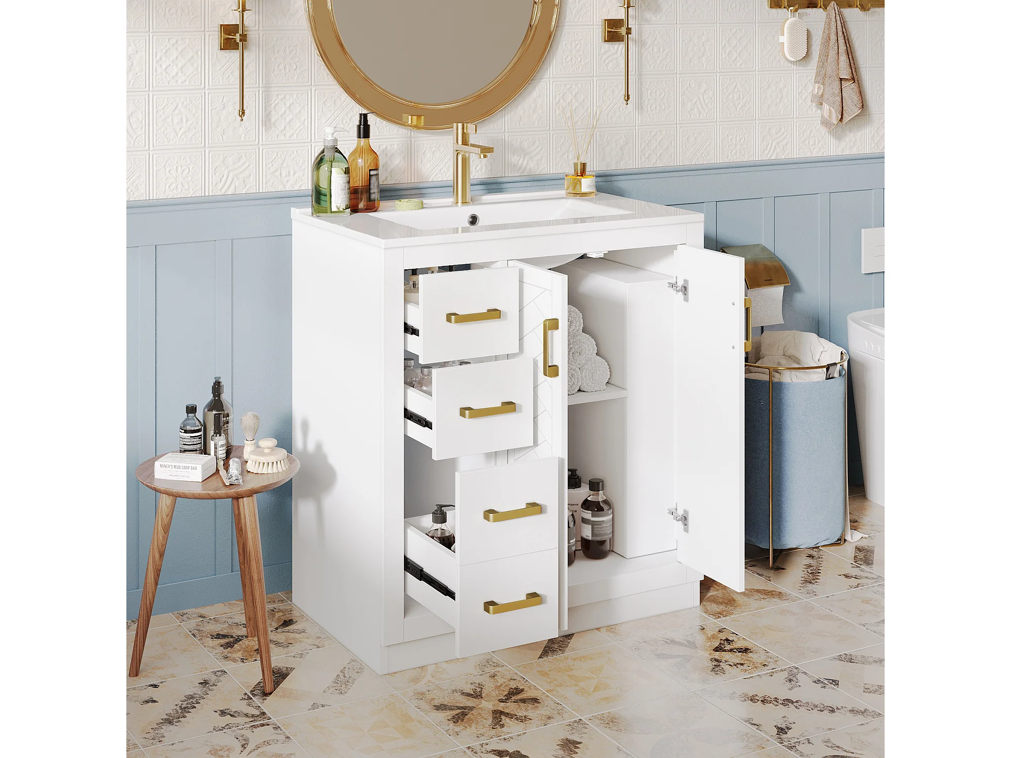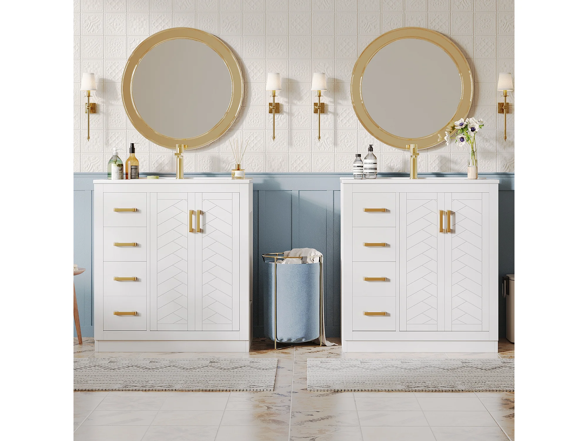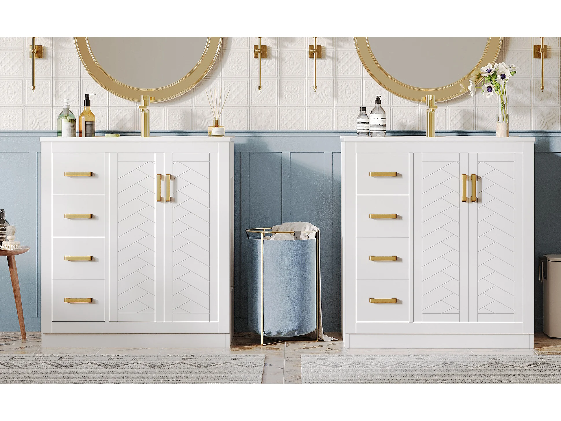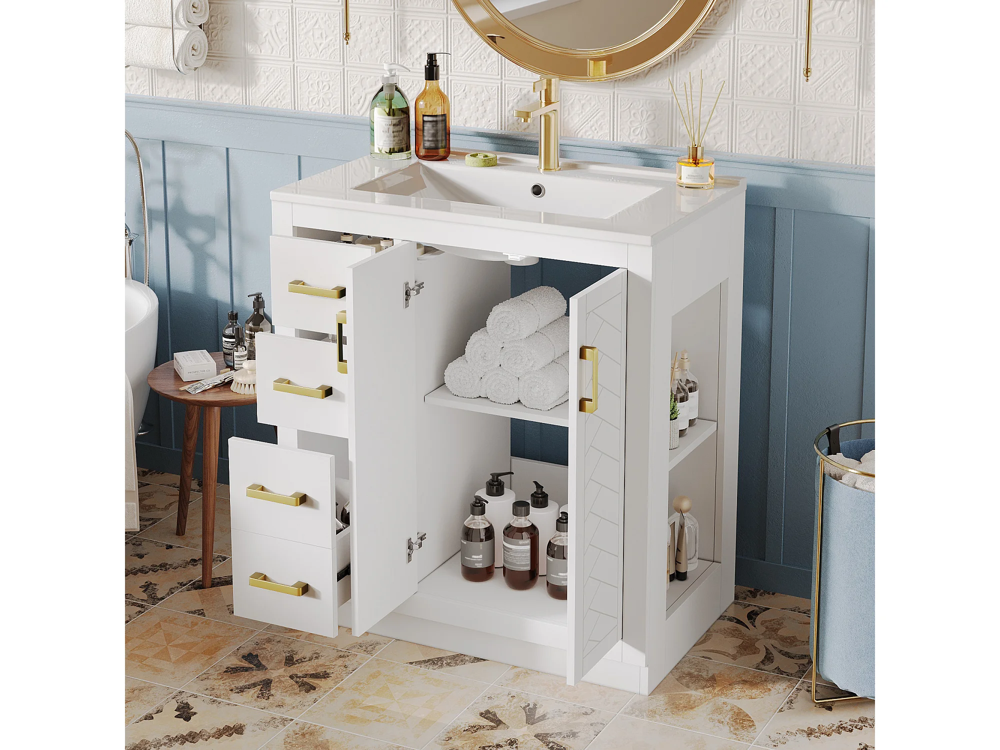 2 szafki łazienkowe z ceramiki - 76,5 x 46,5 x 84,5 cm - z 3 szufladami + półką boczną + 2 drzwiami - MDF - białe