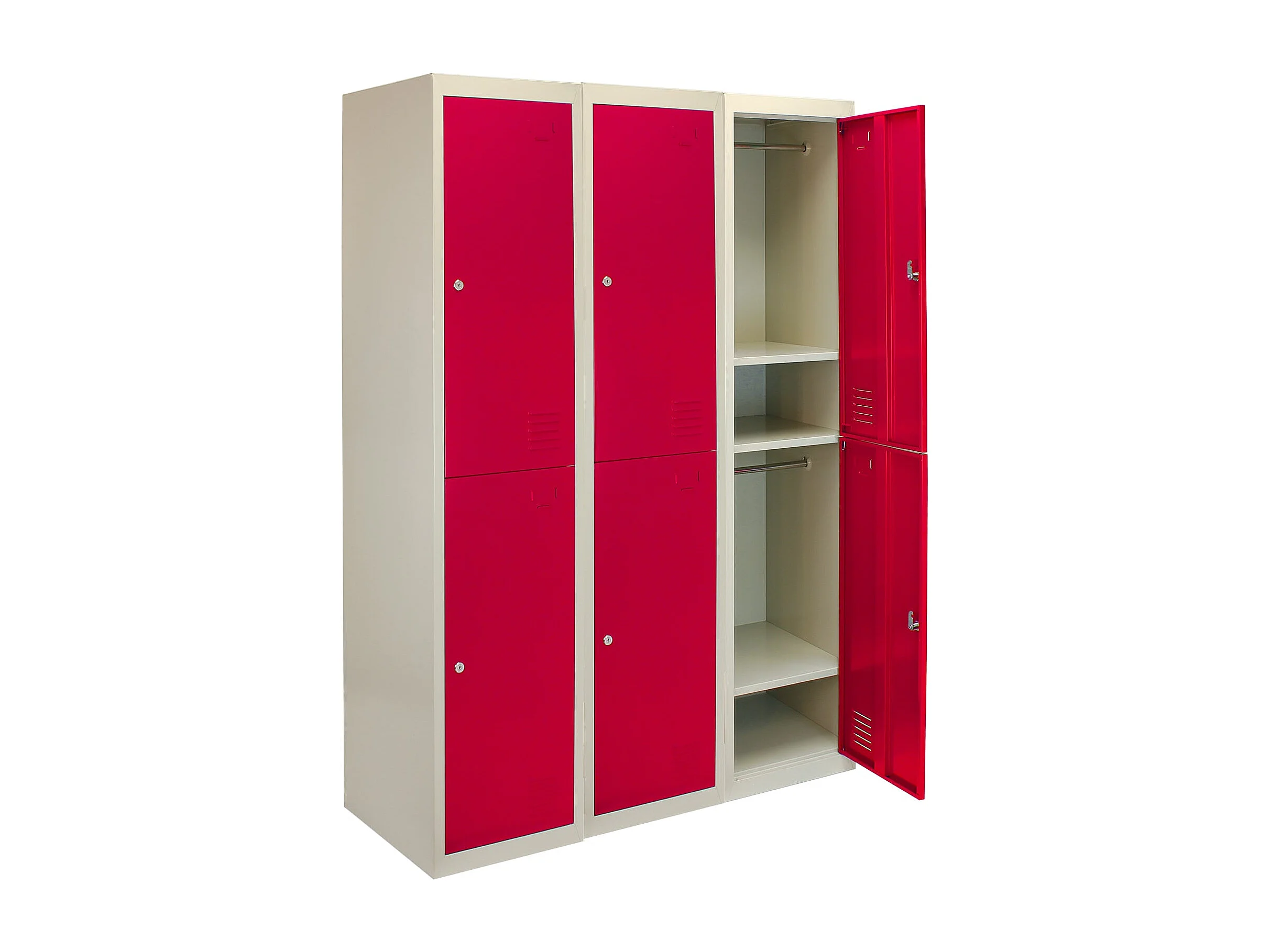 Metalowe szafki magazynowe – sześciodrzwiowe, pakowane na płasko, czerwone