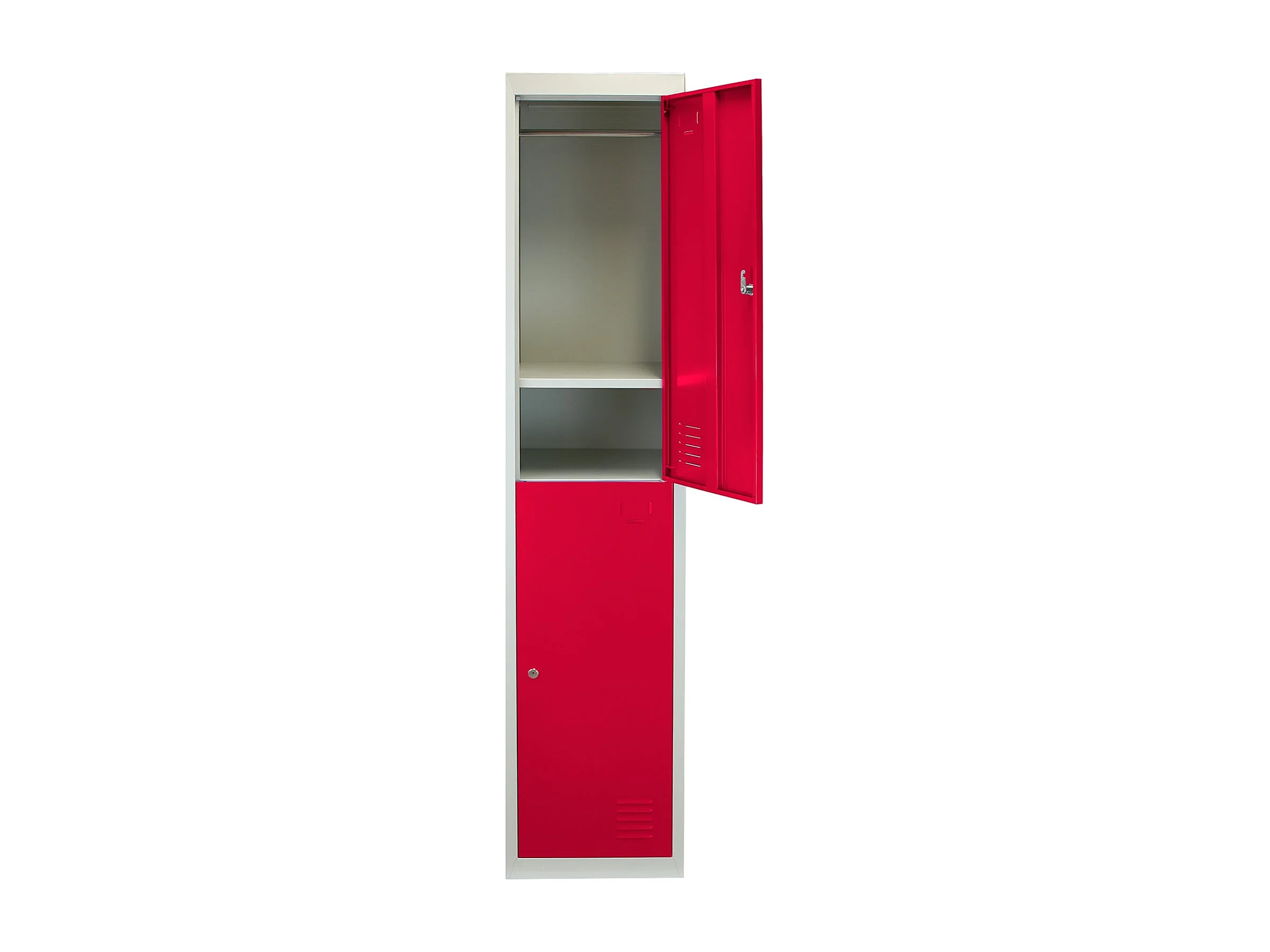Metalowe szafki magazynowe – dwudrzwiowe, pakowane na płasko, czerwone