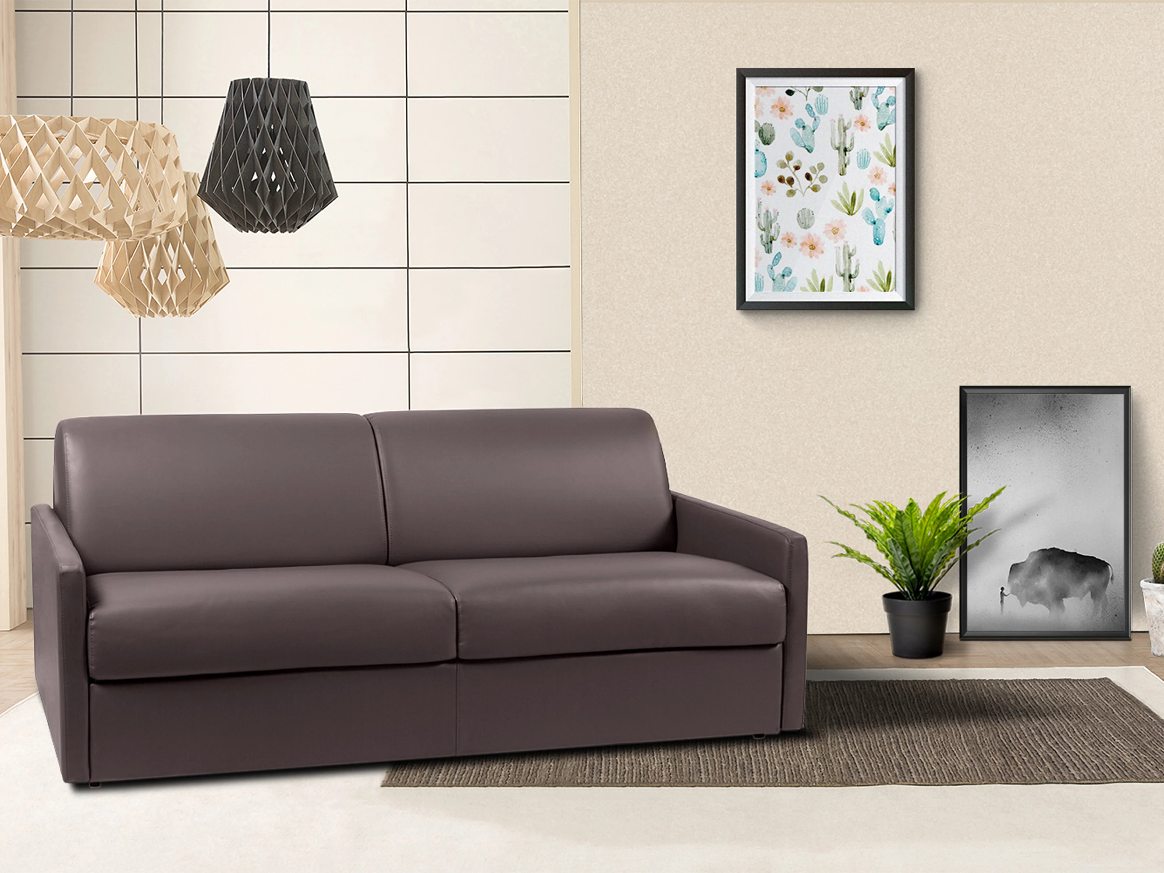 Kanapa 4-osobowa z ekspresowym mechanizmem rozkładania z ekoskóry CALIFE - Kolor: brązowy - Wymiary miejsca do spania: 160 cm - Materac 18 cm