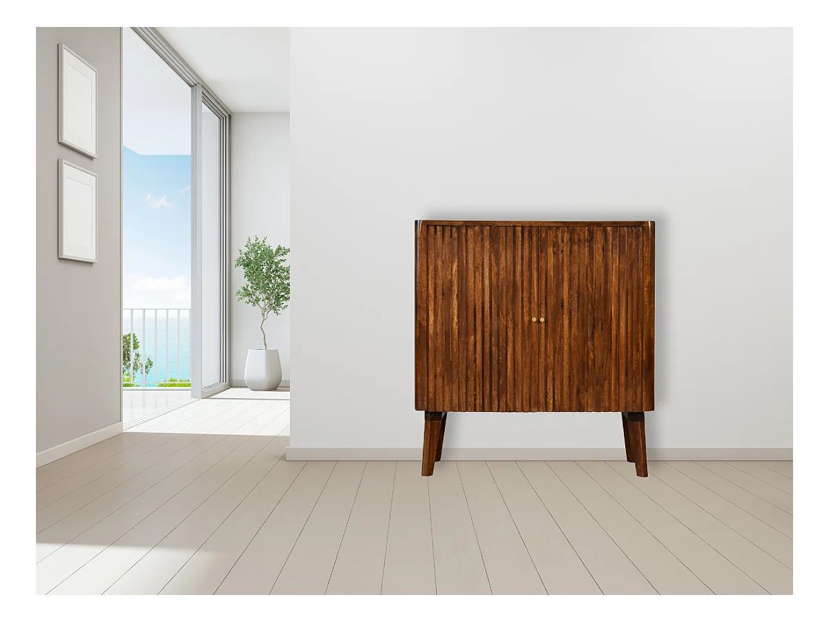 Stojak na butelki wykonany z drewna mango z centralnym lustrem