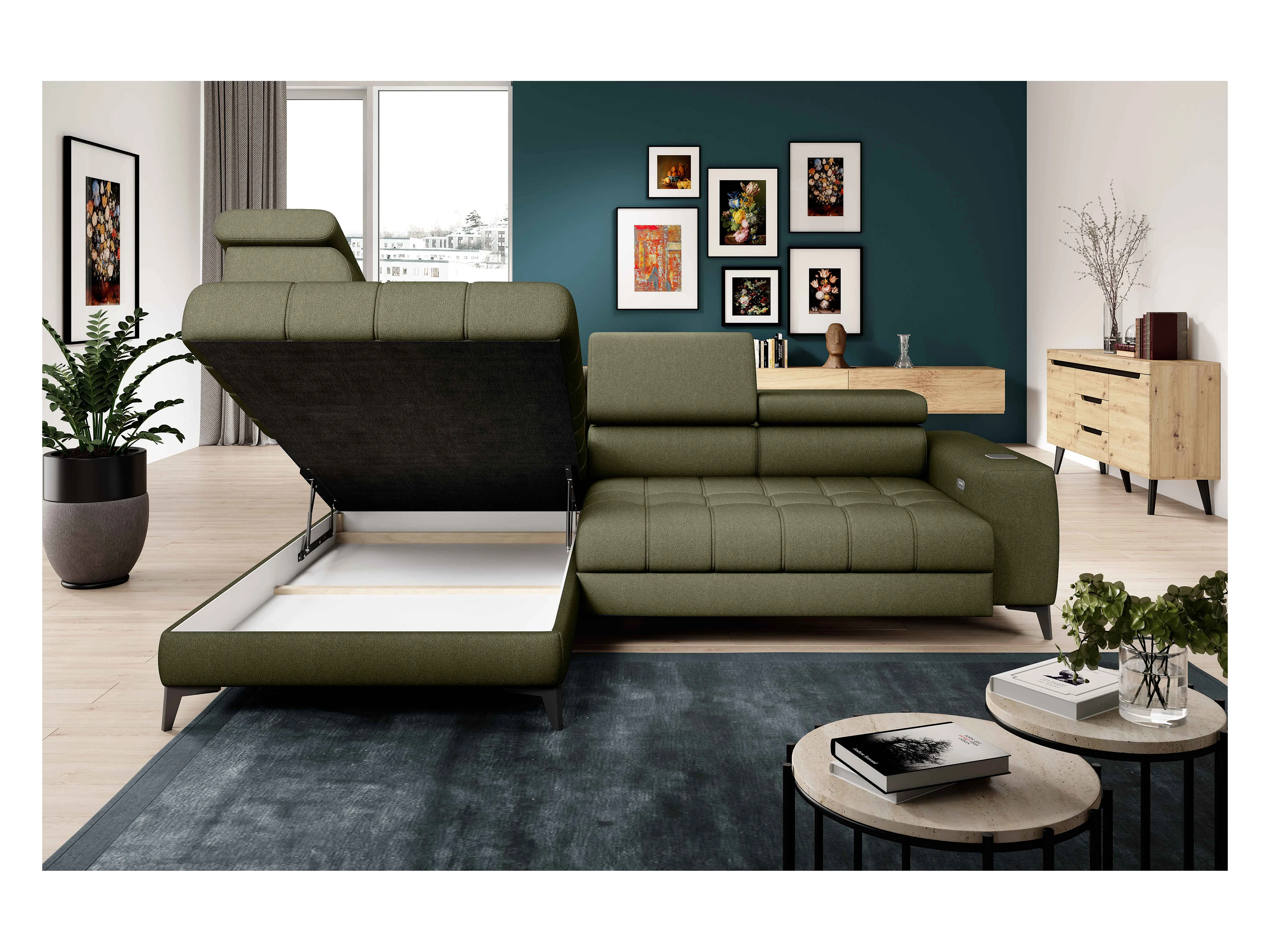 Narożnik Tollo Oliwkowy Salvador-Tkanina Lewa 302x217x105 cm, Sofa L z funkcją spania, pojemnik 120x85x17 cm, elektryczna regulacja