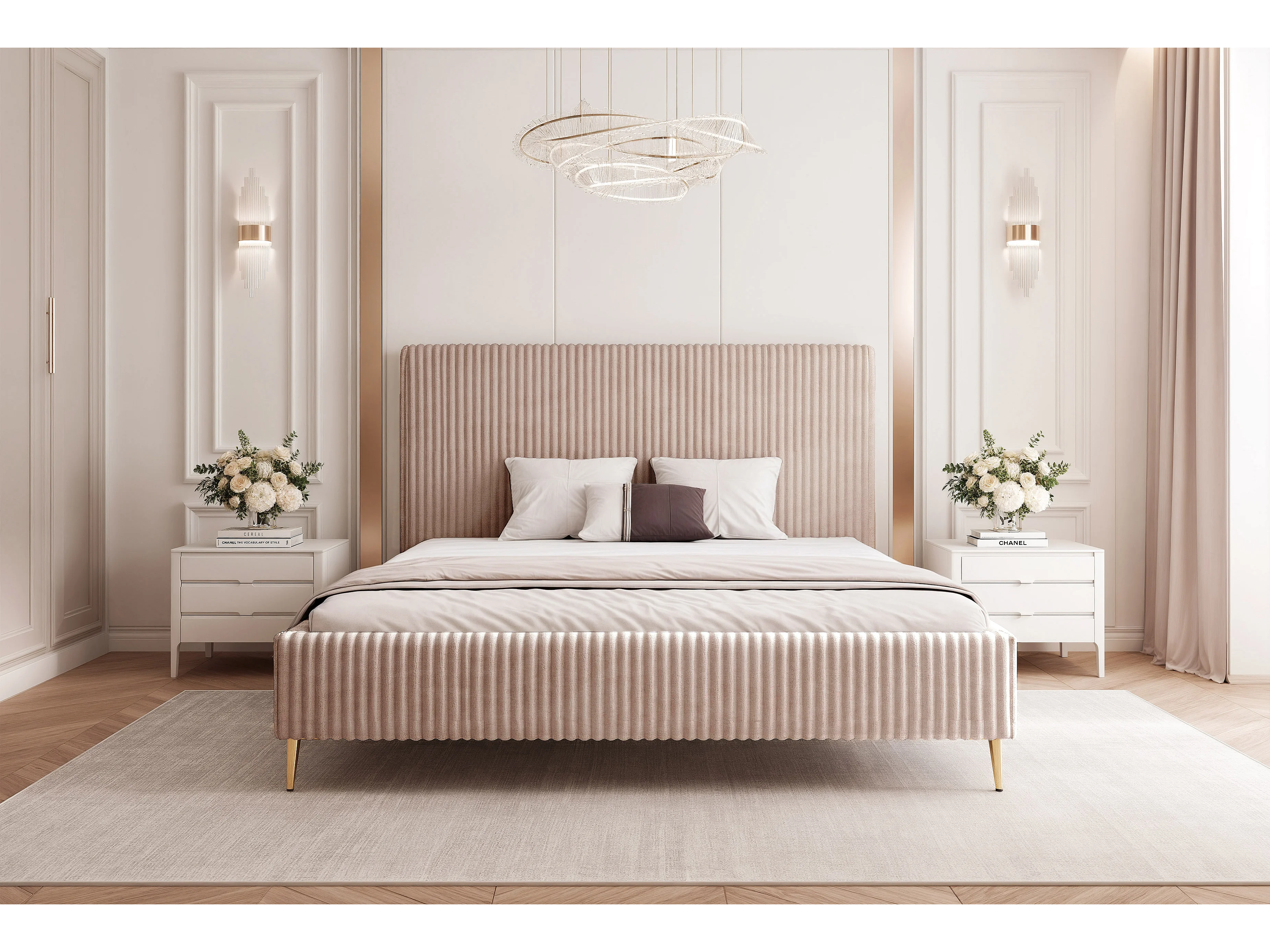 BESILIO Łóżko do sypialni 160x200 Vienna II - Łóżko z pojemnikiem, łóżko slim, wysokie złote nogi, stelaż listwowy - Tkanina miękki sztuks - Beżowy