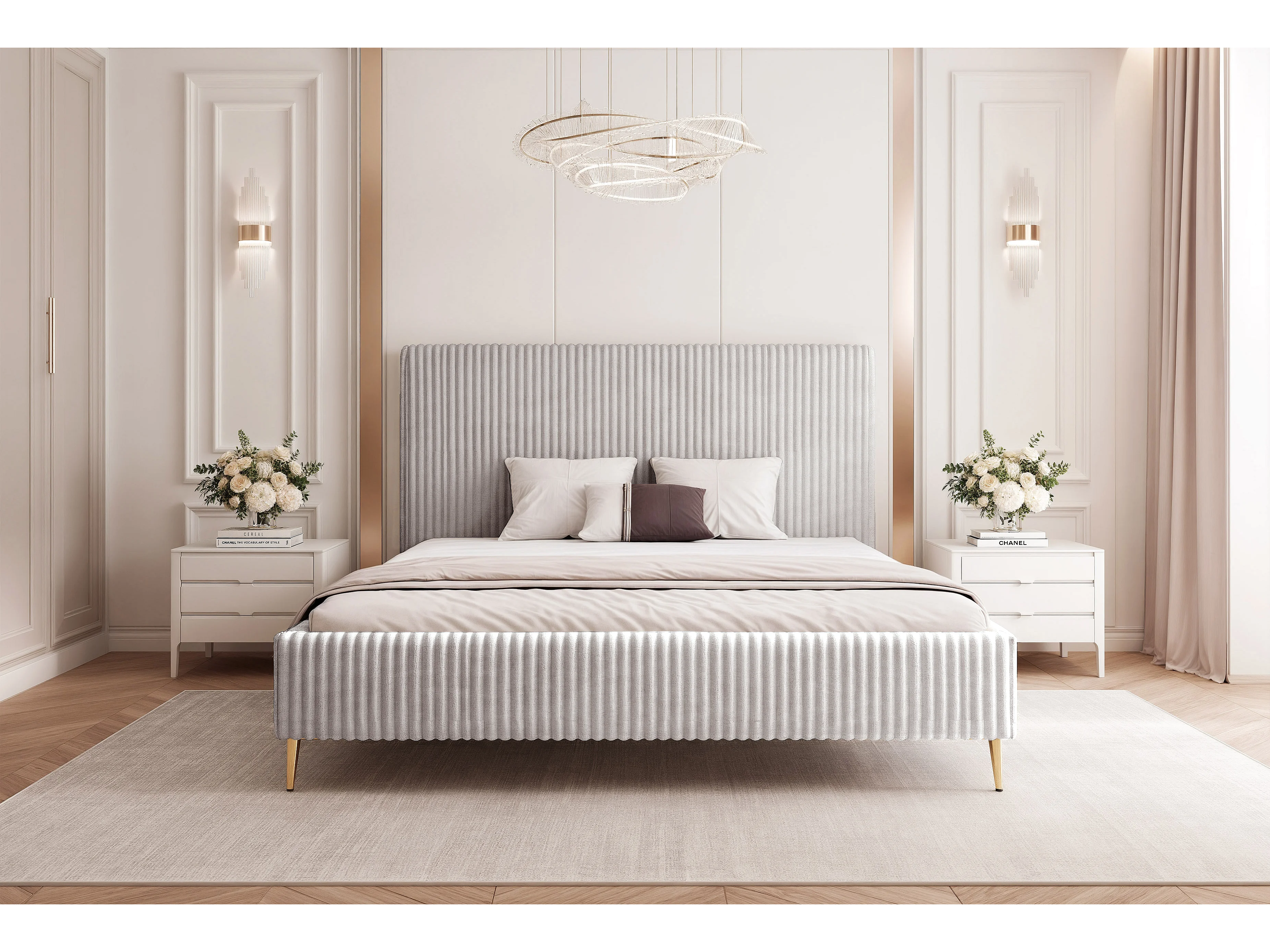 BESILIO Łóżko do sypialni 160x200 Vienna II - Łóżko z pojemnikiem, łóżko slim, wysokie złote nogi, stelaż listwowy - Tkanina miękki sztuks - Jasnoszary