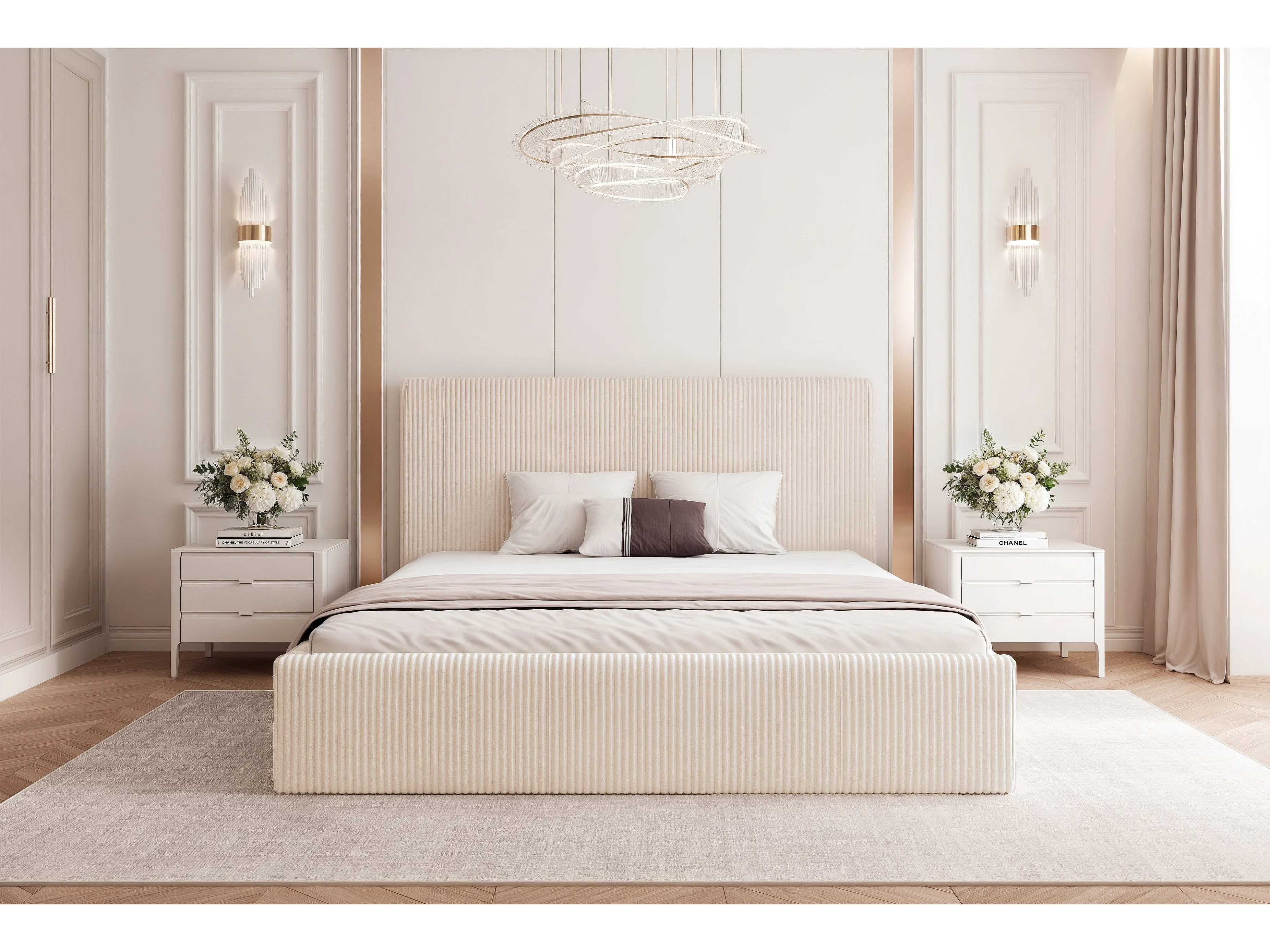 BESILIO Łóżko tapicerowane Boucle 160x200 Velora II - stelaż listwowy, wezgłowie, pojemnik, łóżko slim, wysokie złote nogi - Kremowy