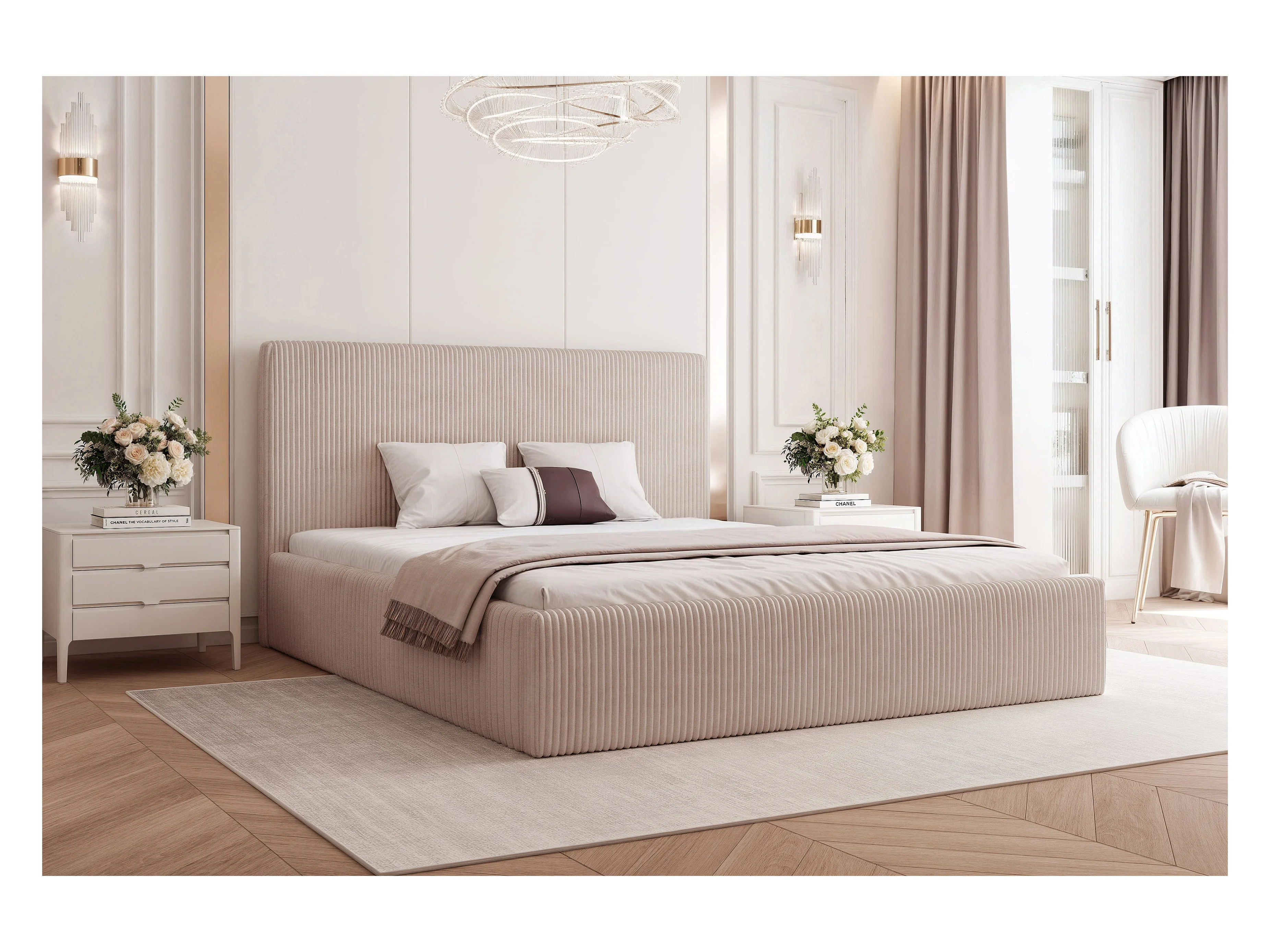 BESILIO Łóżko do sypialni 180x200 Vienna - Łóżko z pojemnikiem, łóżko slim, stelaż listwowy - Tkanina sztuks - Beżowy