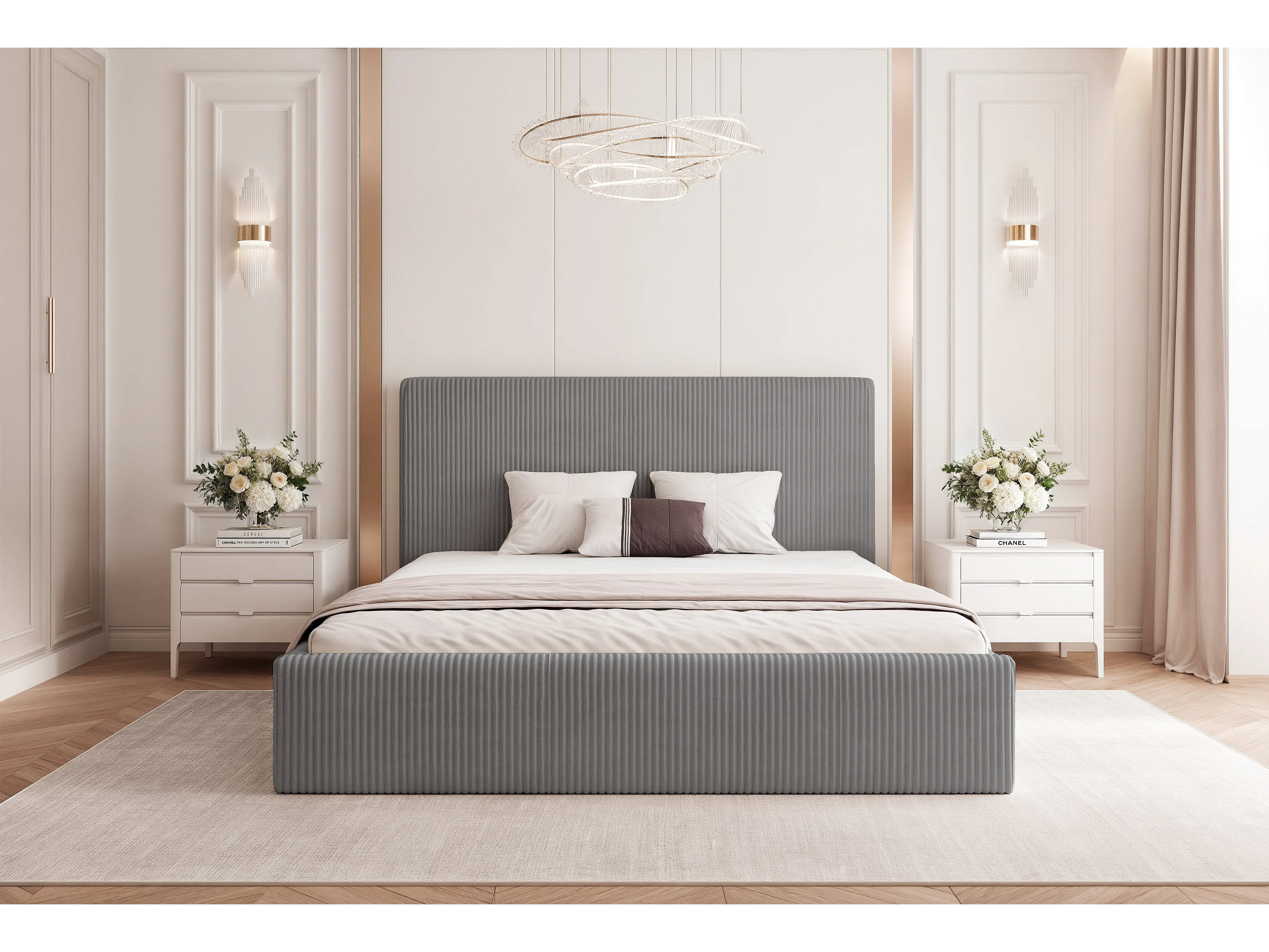 BESILIO Łóżko tapicerowane Boucle 180x200 Velora II - stelaż listwowy, wezgłowie, pojemnik, łóżko slim, wysokie złote nogi - Jasnoszary
