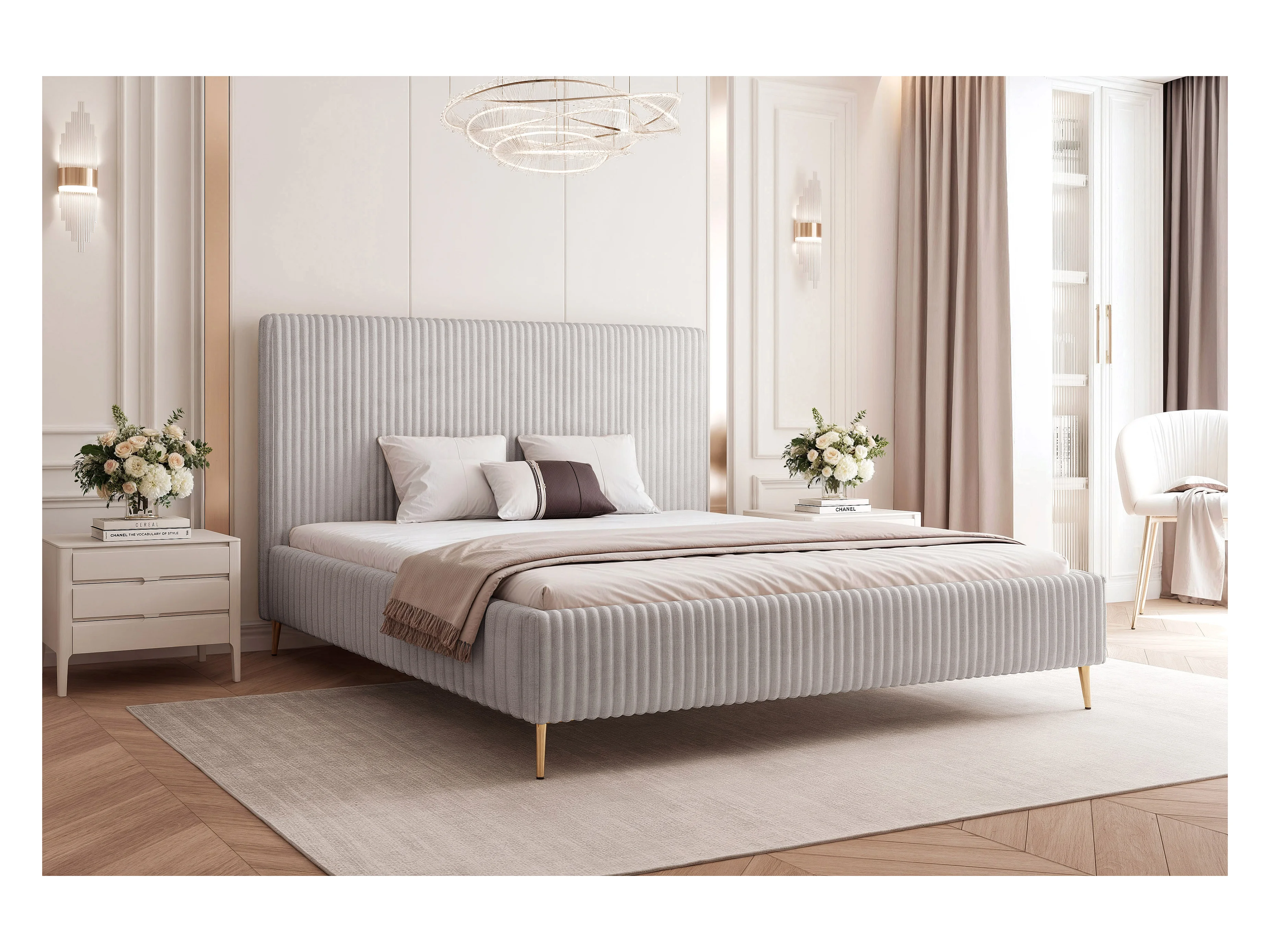 BESILIO Łóżko do sypialni 200x200 Vienna II - Łóżko z pojemnikiem, łóżko slim, wysokie złote nogi, stelaż listwowy - Tkanina miękki sztuks - Jasnoszary