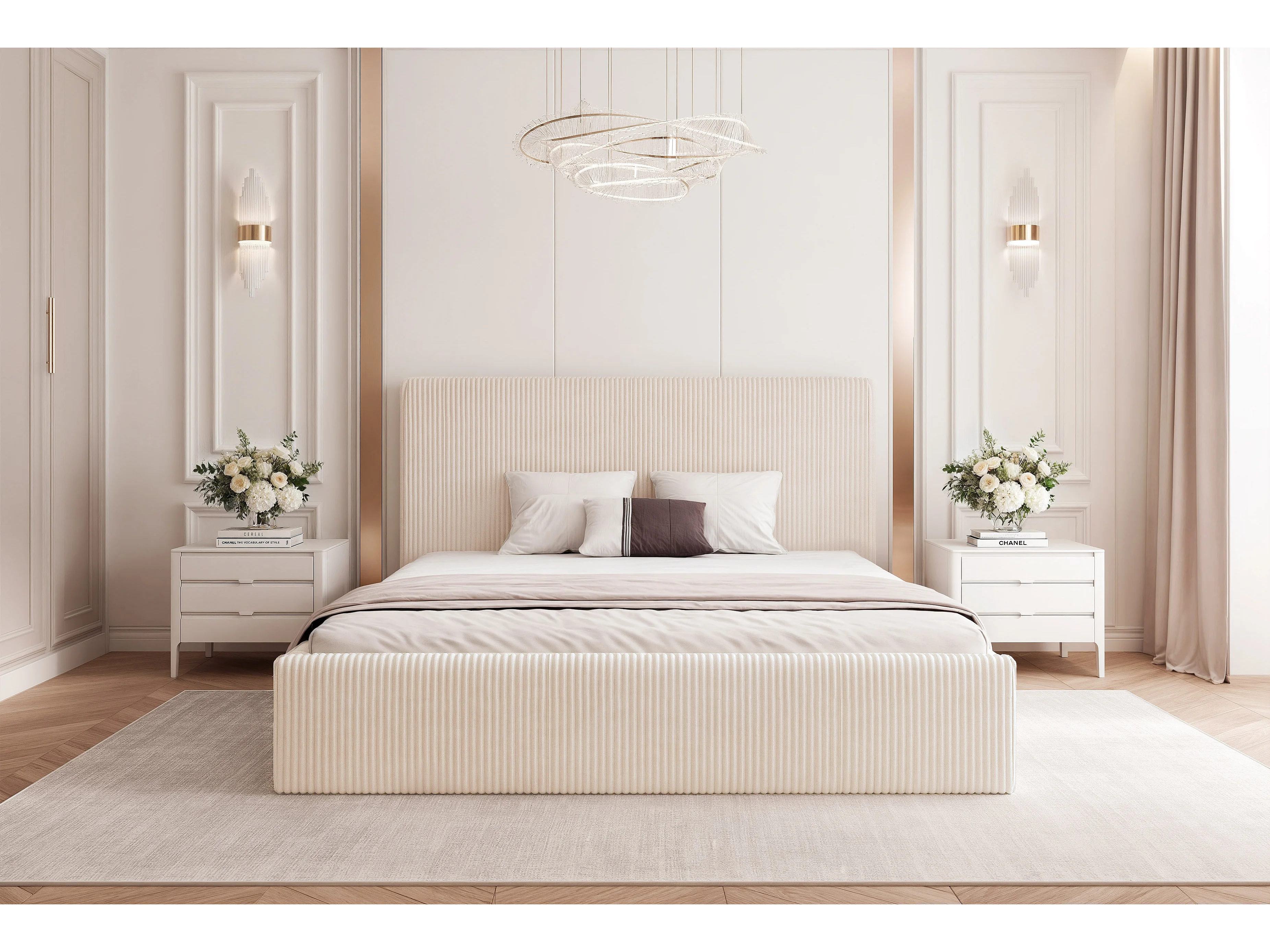 BESILIO Podwójne łóżko 200x200 Tina - Łóżko slim do sypialni ze stelażem i pojemnikiem na pościel- Tkanina welurowa- Beżowy