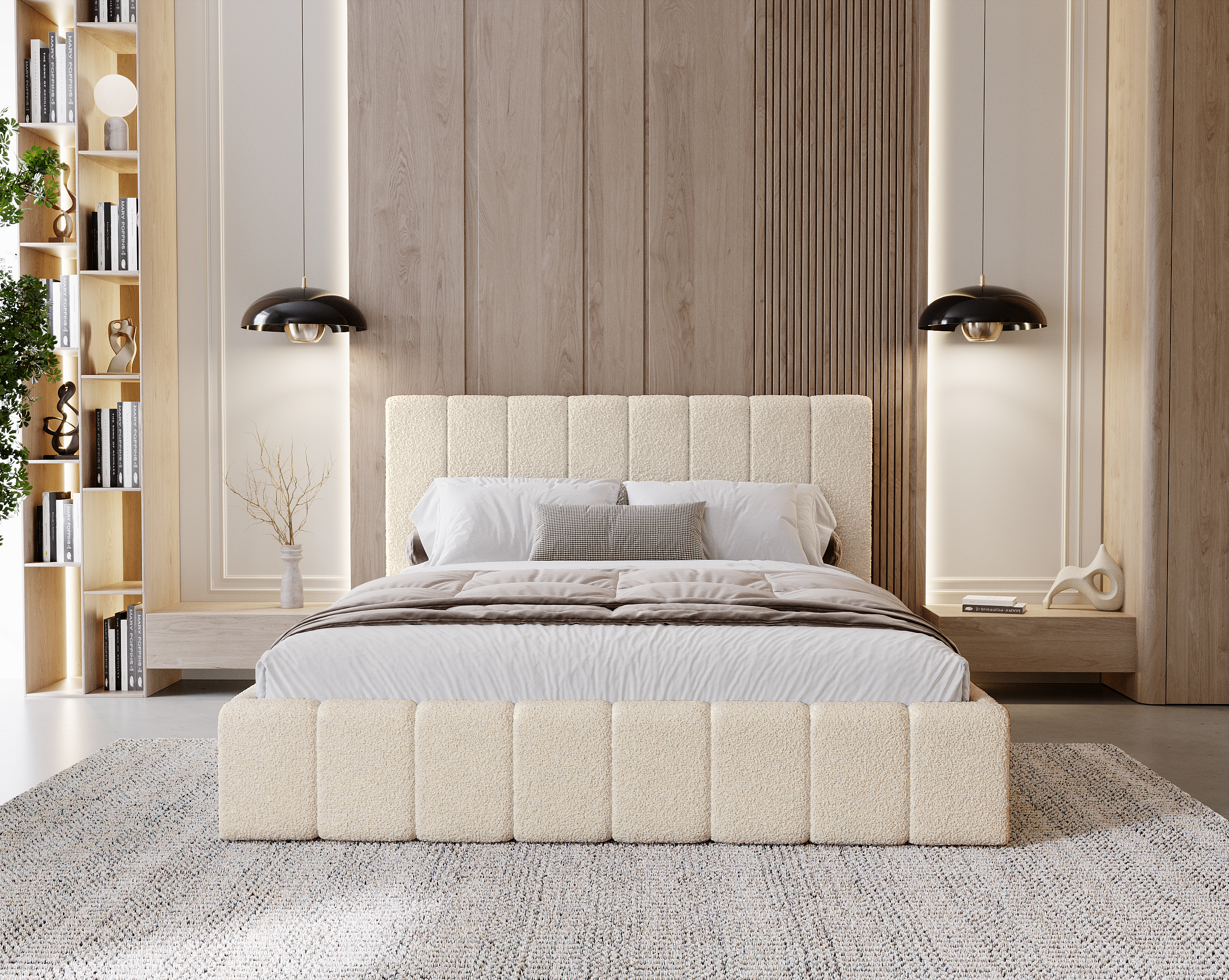 BESILIO Łóżko tapicerowane Boucle 140x200 Lexy - stelaż listwowy, wezgłowie, pojemnik, łóżko slim - Kremowy