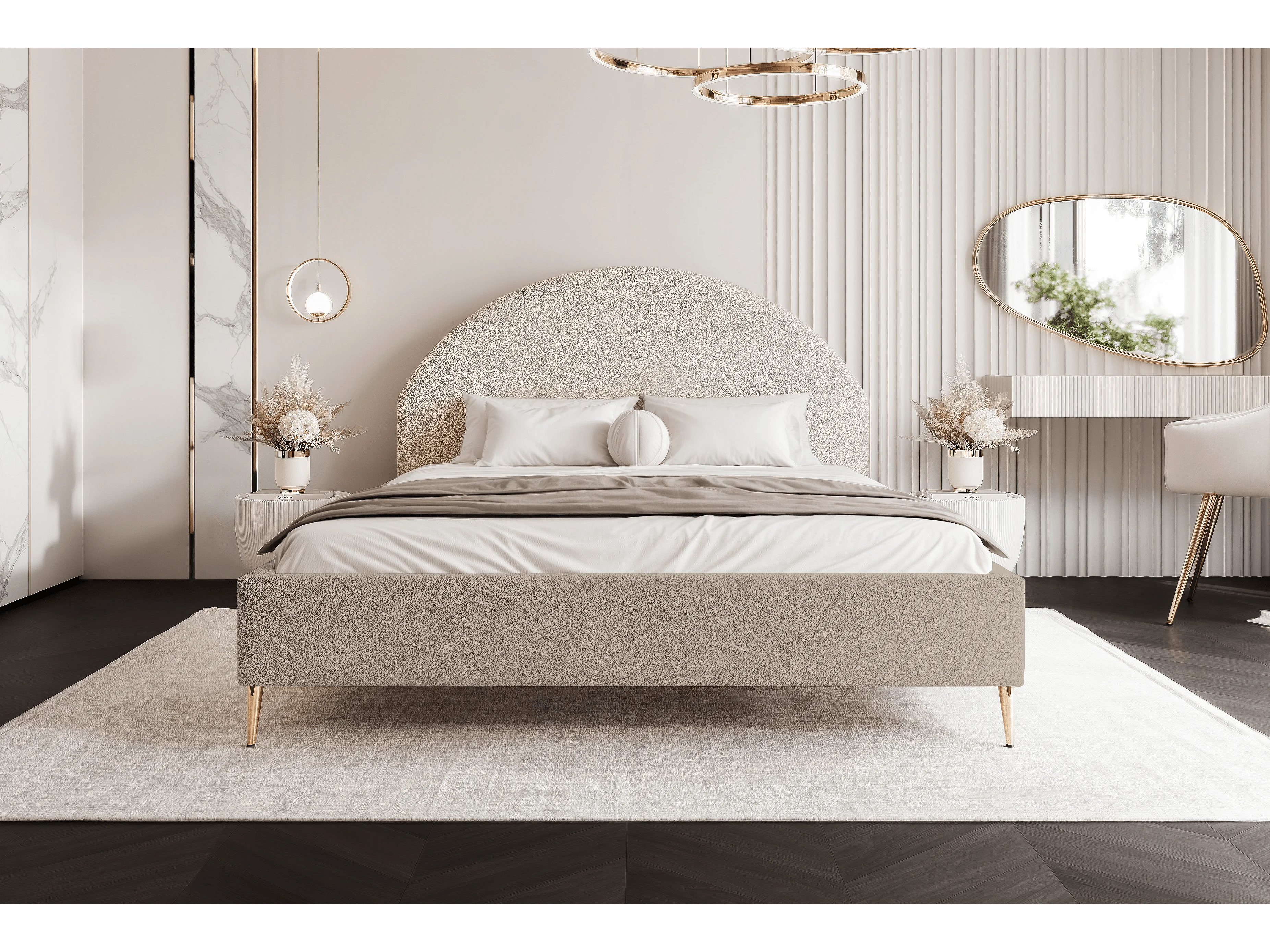 BESILIO Łóżko tapicerowane Boucle 160x200 Velora II - stelaż listwowy, wezgłowie, pojemnik, łóżko slim, wysokie złote nogi - Beżowy