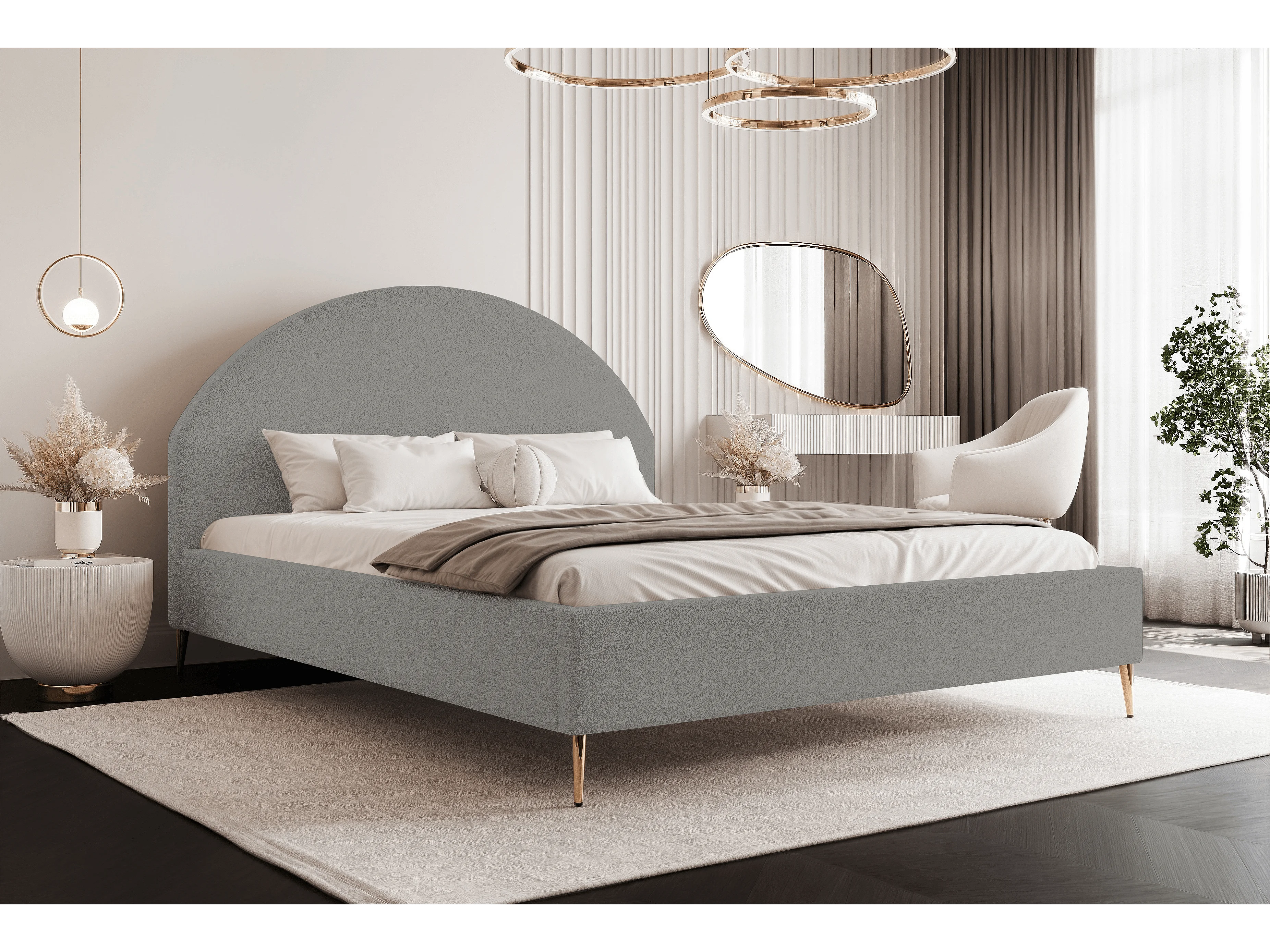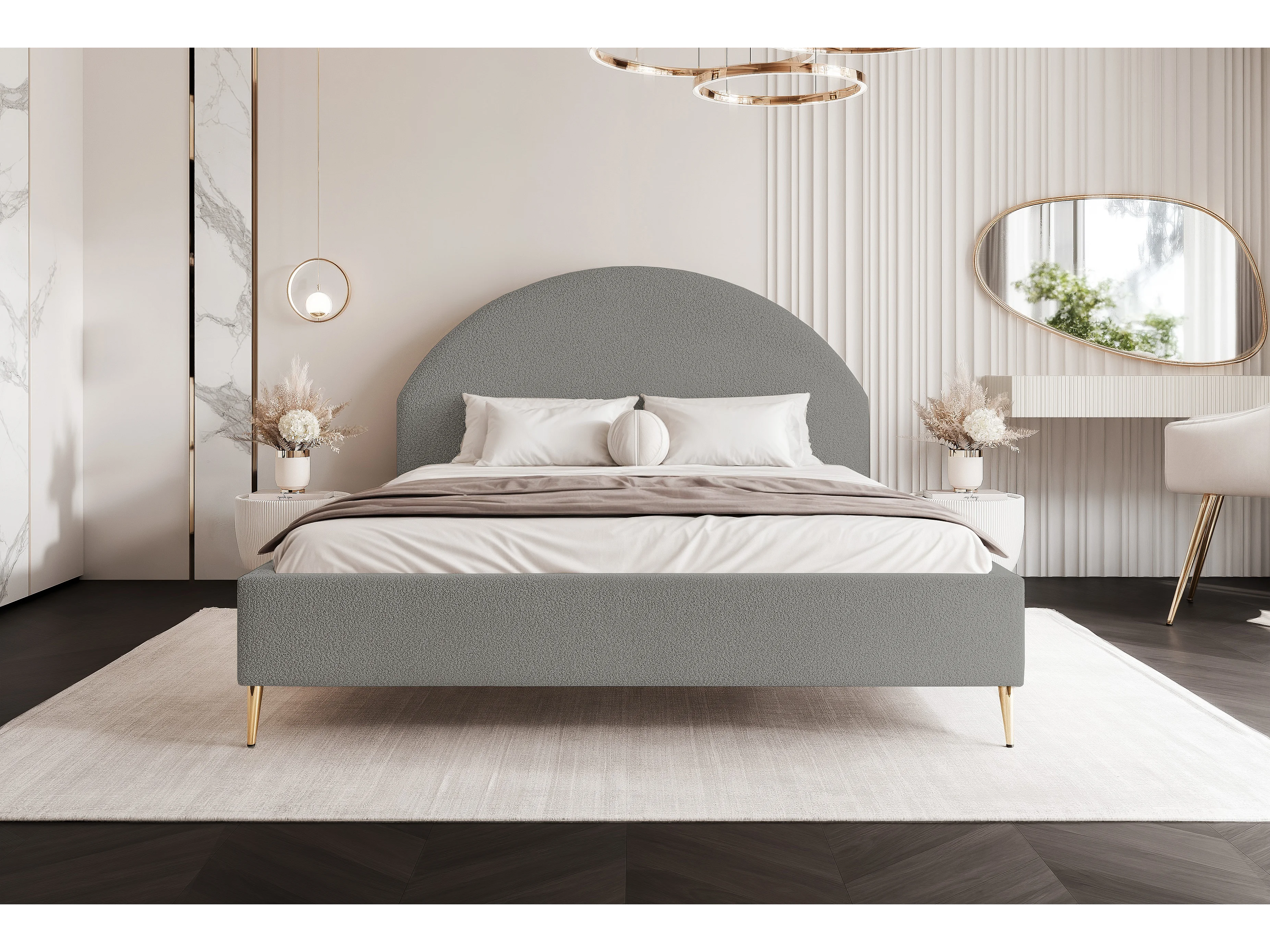 BESILIO Łóżko tapicerowane Boucle 160x200 Velora II - stelaż listwowy, wezgłowie, pojemnik, łóżko slim, wysokie złote nogi - Jasnoszary