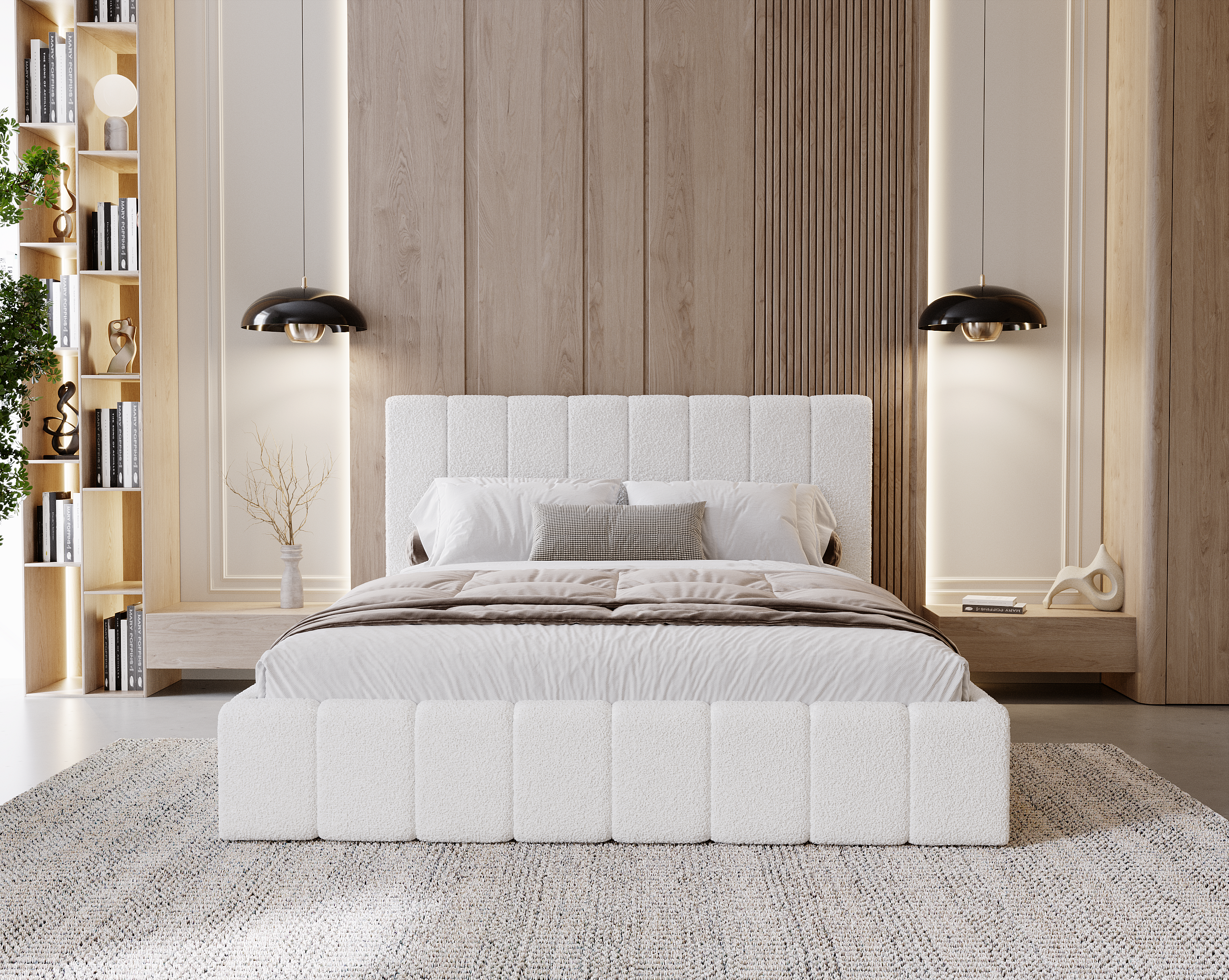 BESILIO Łóżko tapicerowane Boucle 200x200 Lexy - stelaż listwowy, wezgłowie, pojemnik, łóżko slim - Biały