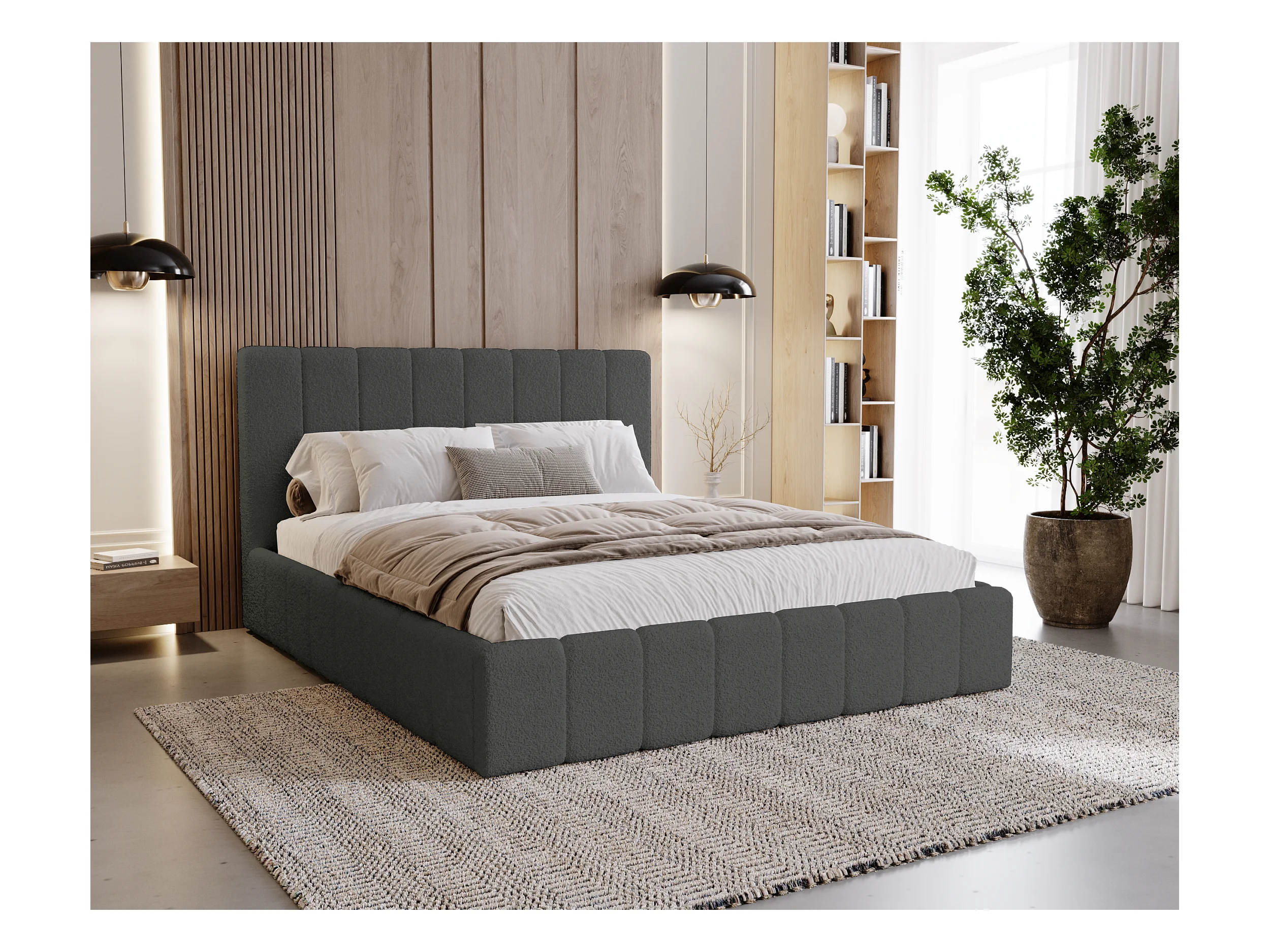 BESILIO Łóżko tapicerowane Boucle 200x200 Velora - stelaż listwowy, wezgłowie, pojemnik, łóżko slim - Szary