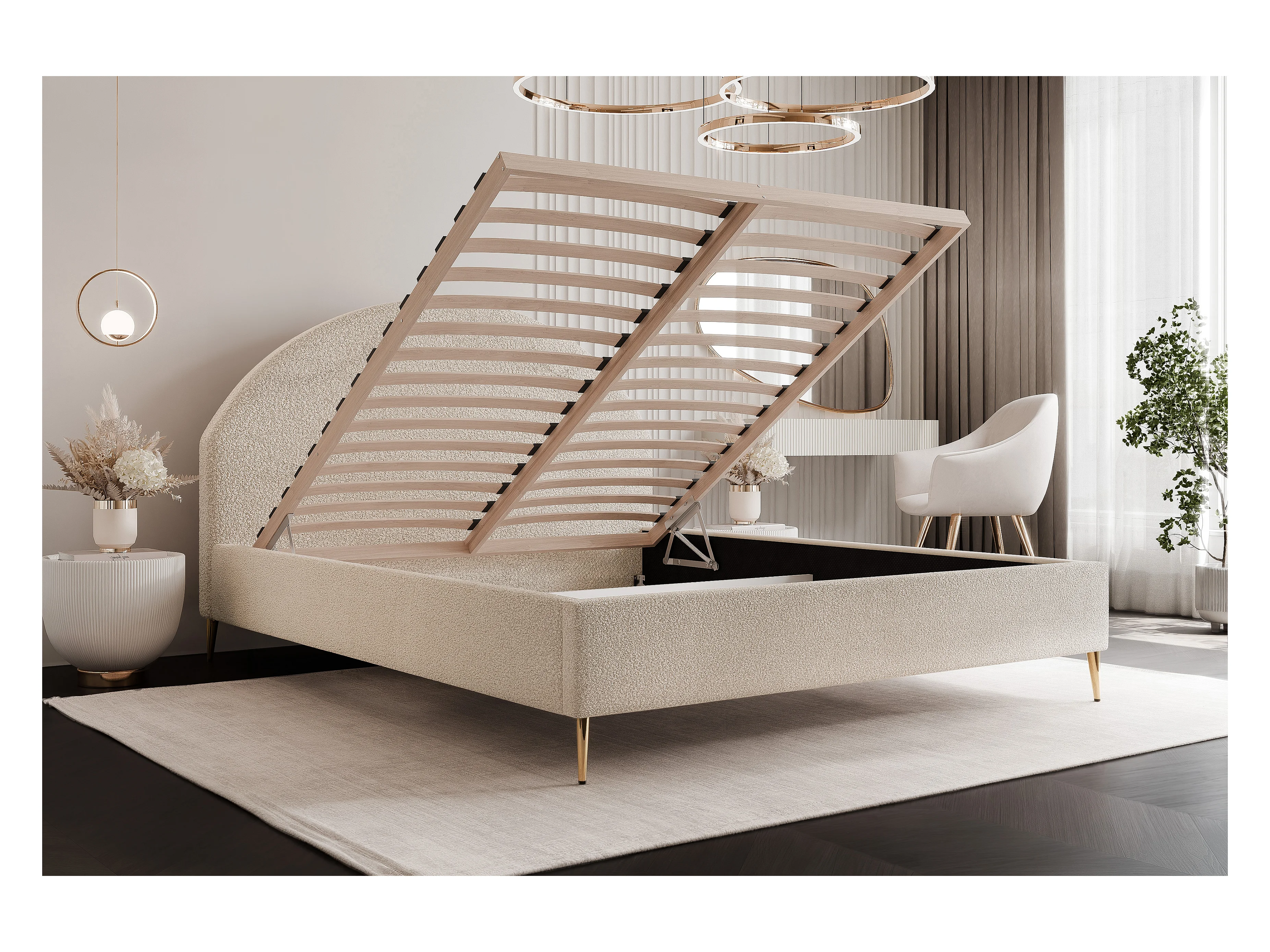 BESILIO Łóżko tapicerowane Boucle 200x200 Velora II - stelaż listwowy, wezgłowie, pojemnik, łóżko slim, wysokie złote nogi - Beżowy