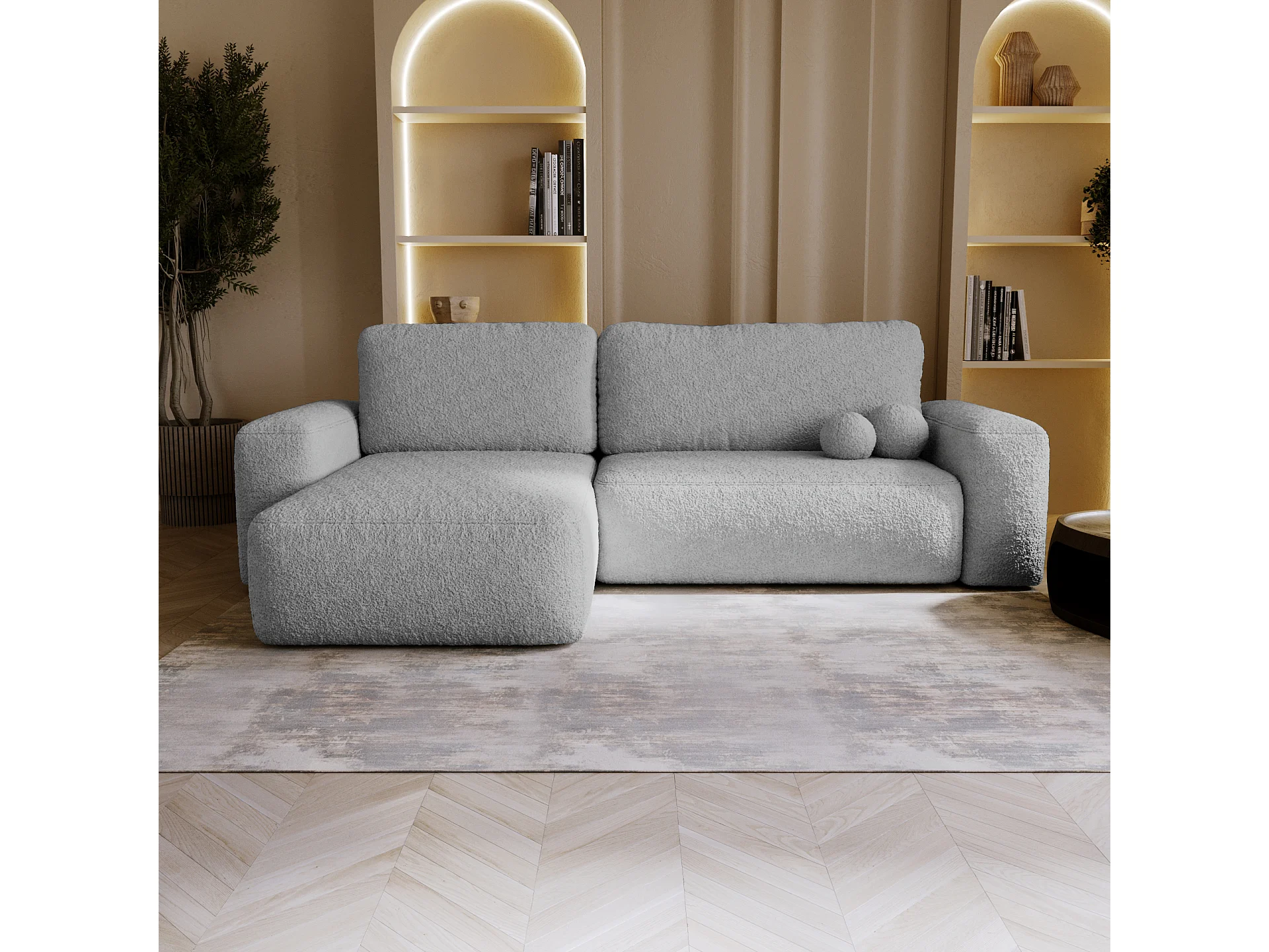 BESILIO Narożnik lewostronny rozkładany Ornello L- okrągłe poduszki, z funkcją spania, szezlong w boucle - Jasnoszary
