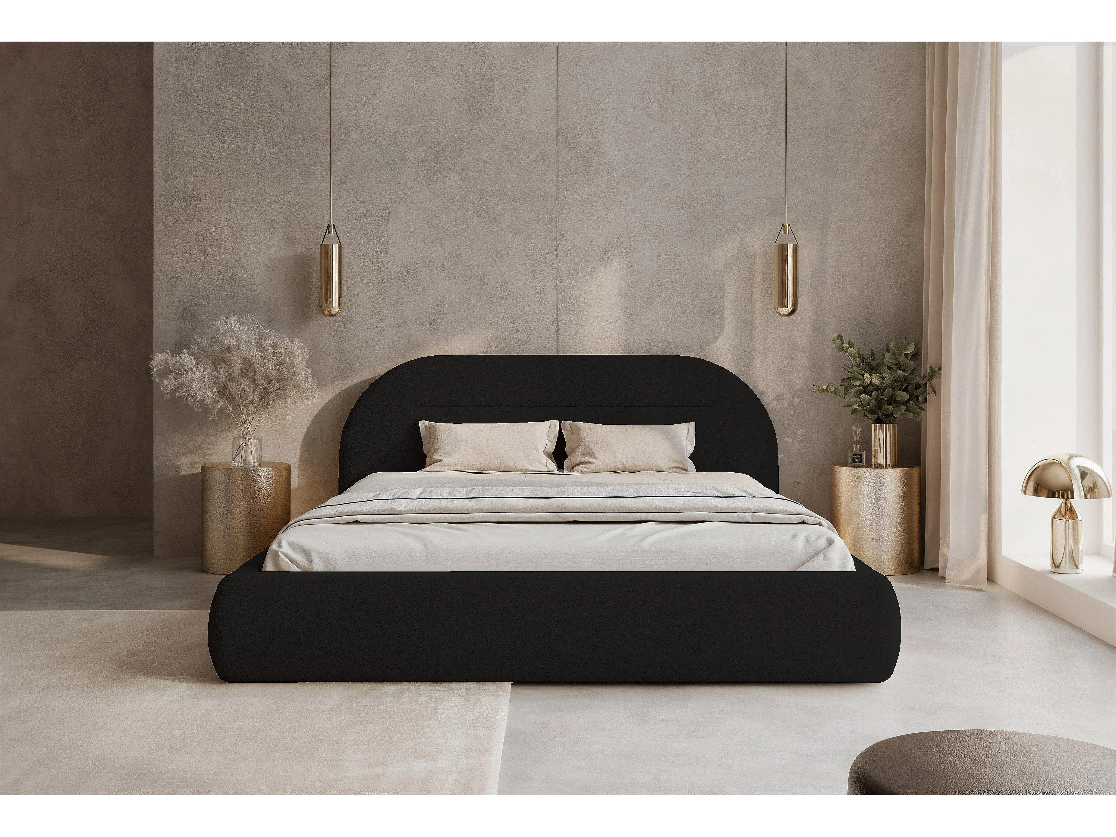 BESILIO Nowoczesne łóżko z pojemnikiem 140x200 Apolline - łóżko zaokrąglone wezgłowie, miękka tkanina pluszowa- Czarny