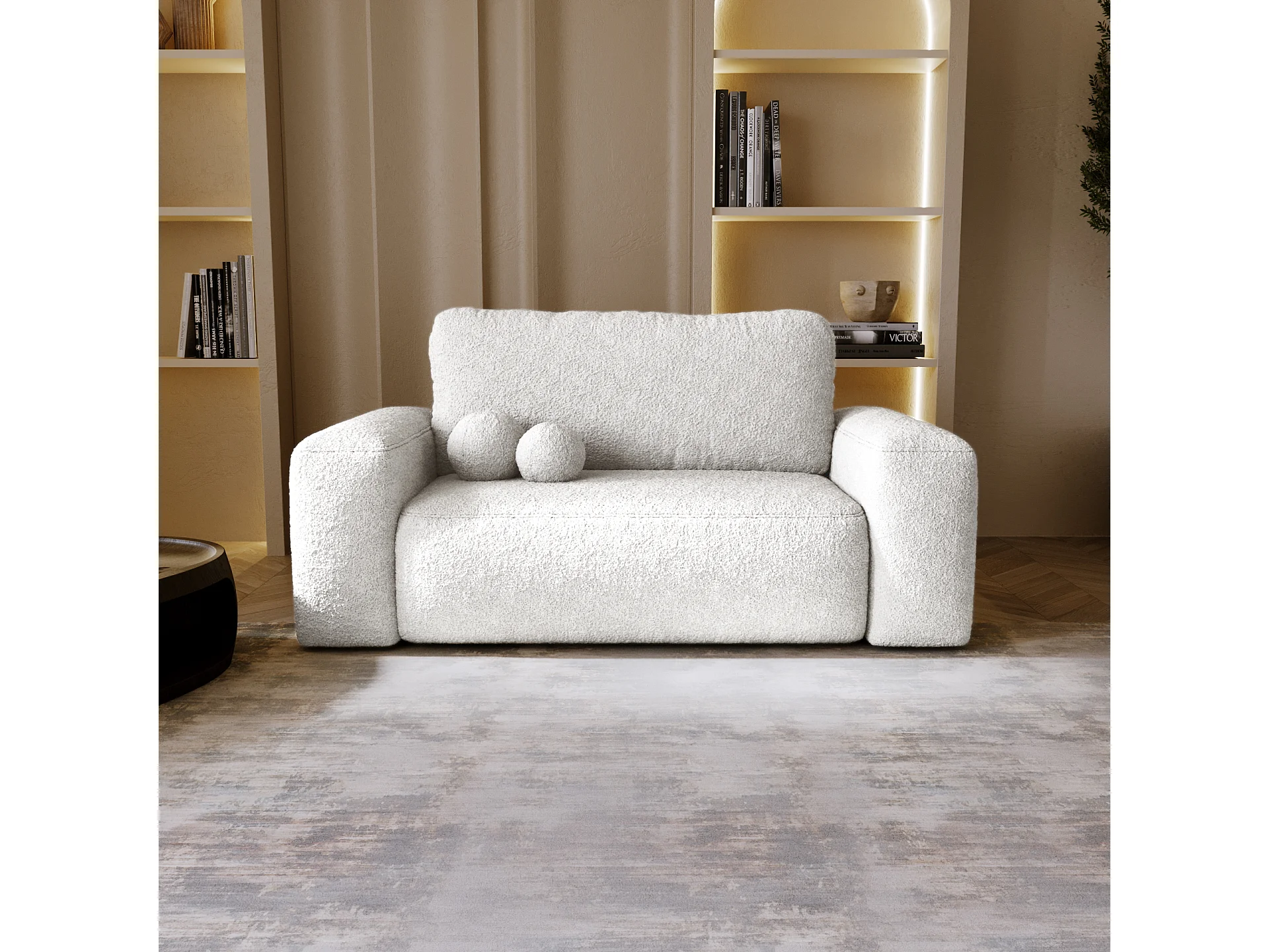 BESILIO Sofa rozkładana tapicerowana Ornello- okrągłe poduszki, sofa dwuosobowa, z funkcją spania, kanapa wolnostojąca, boucle - Biały
