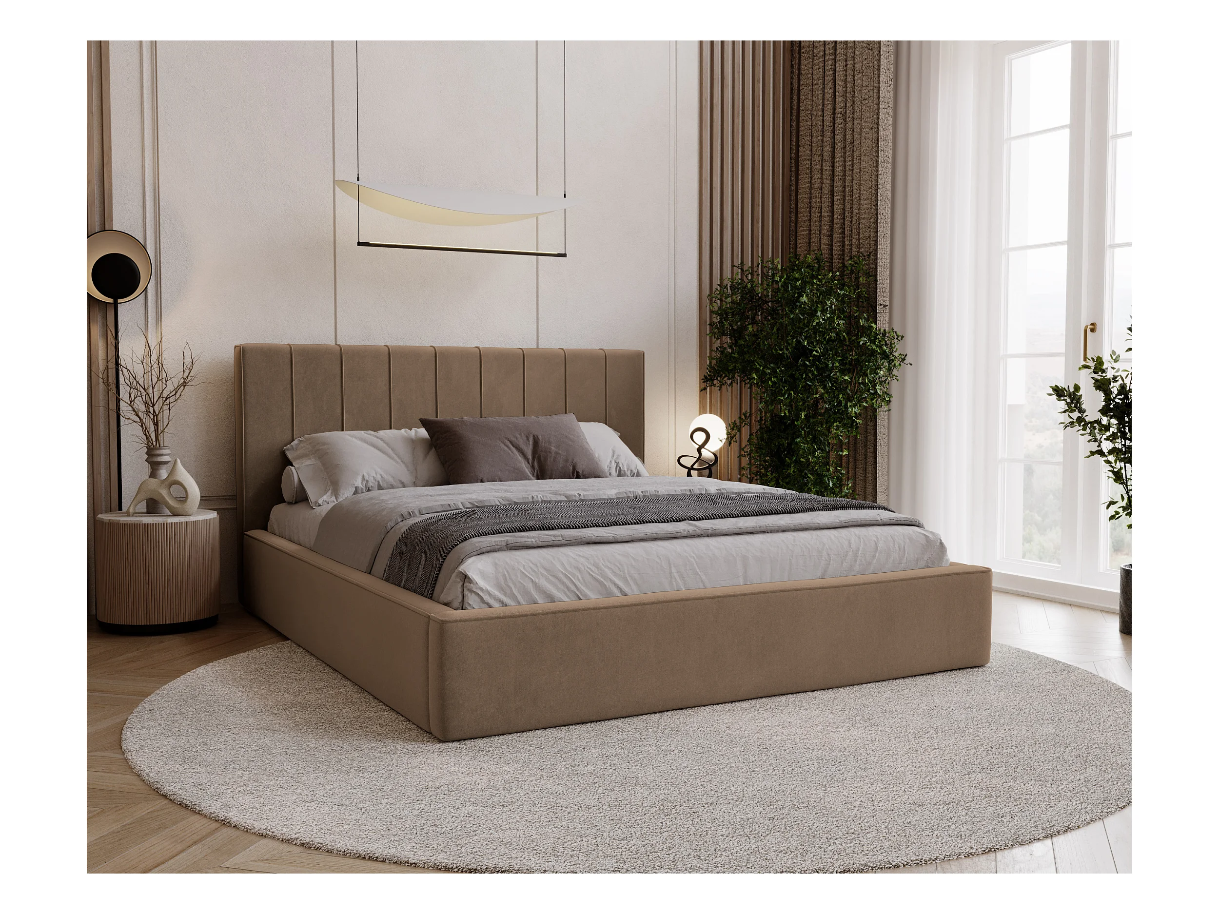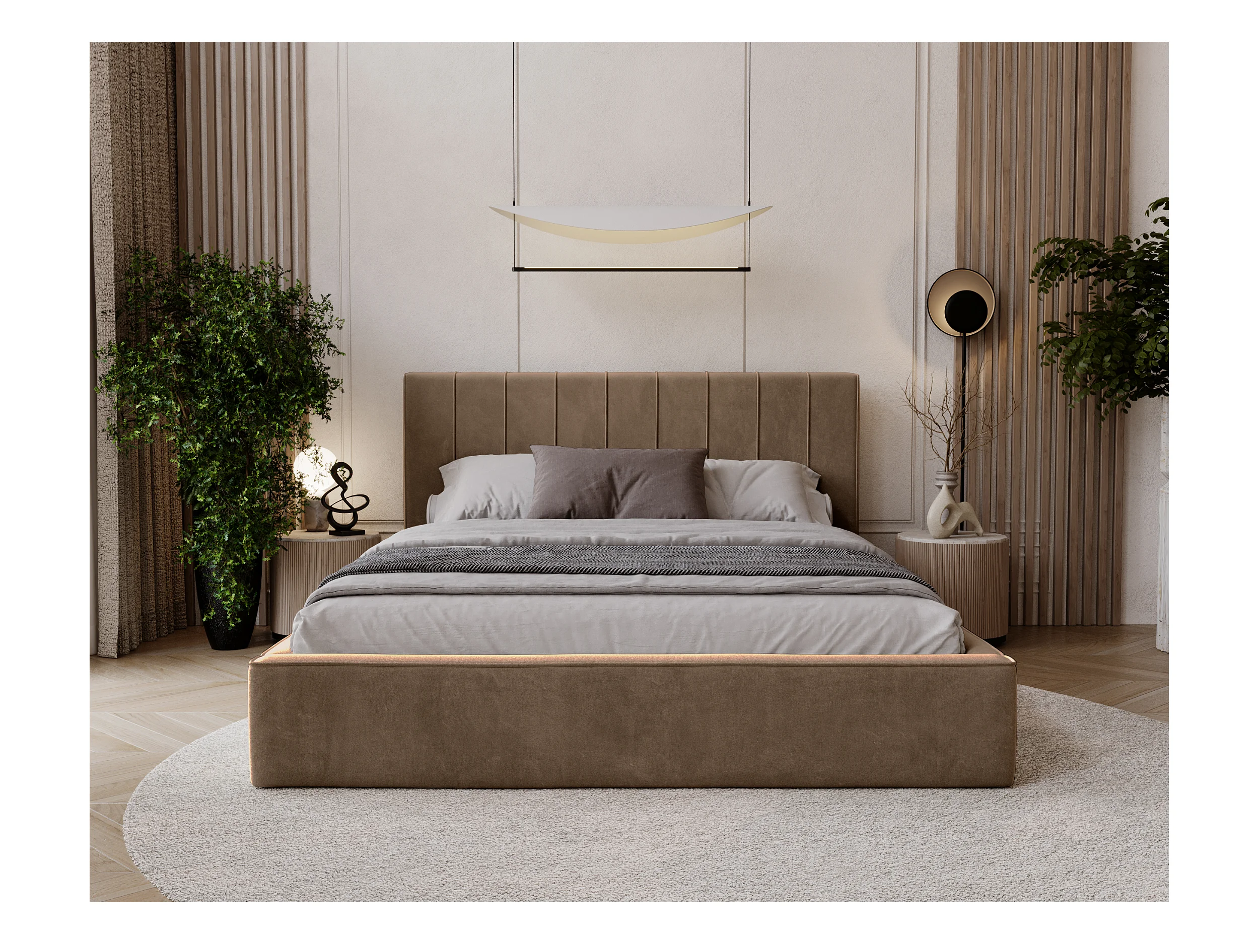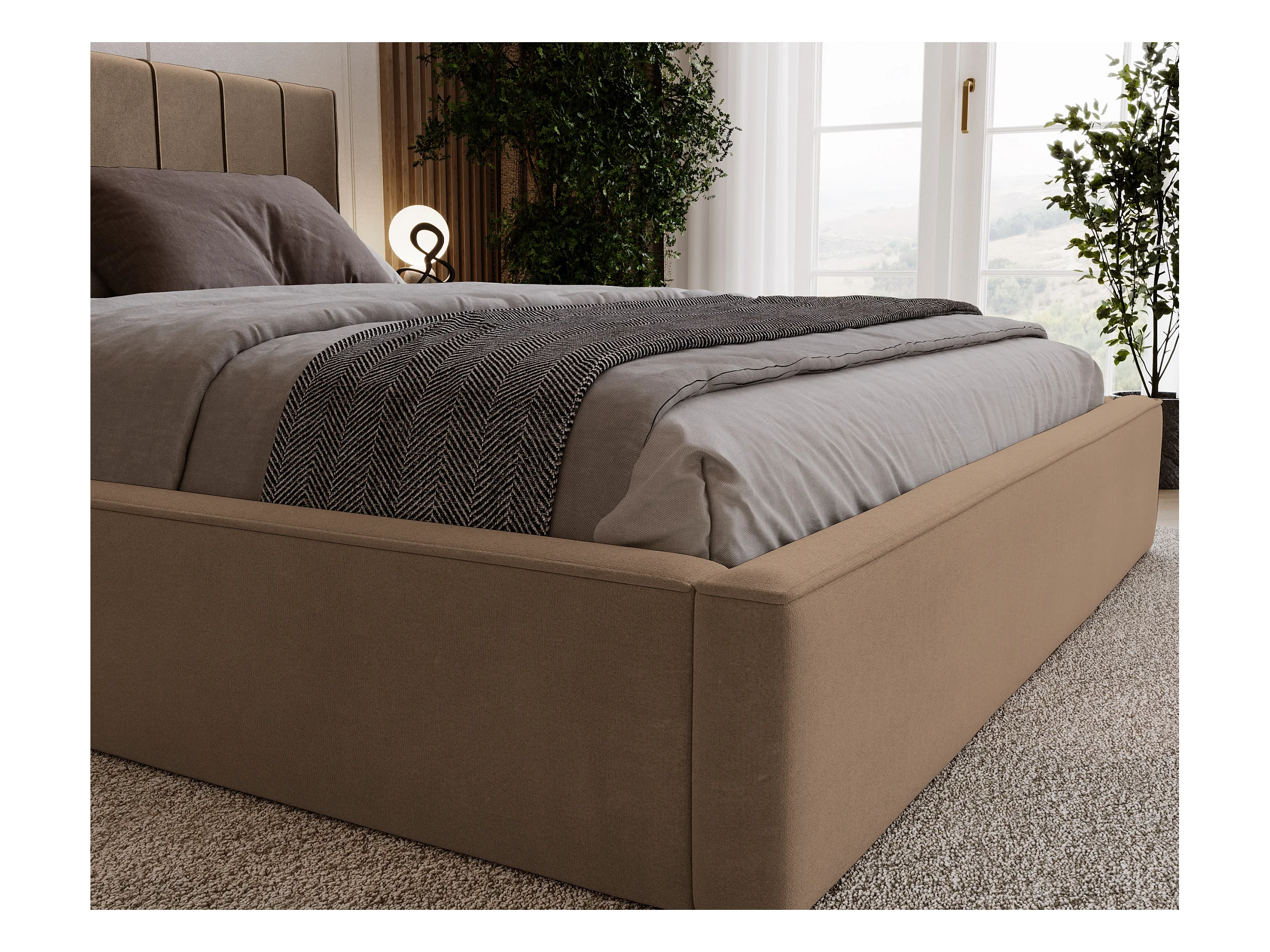 BESILIO Stylowe łóżko tapicerowane 120x200 Persea - stelaż metalowy, pojemnik na pościel, ozdobna lamówka - Brązowy