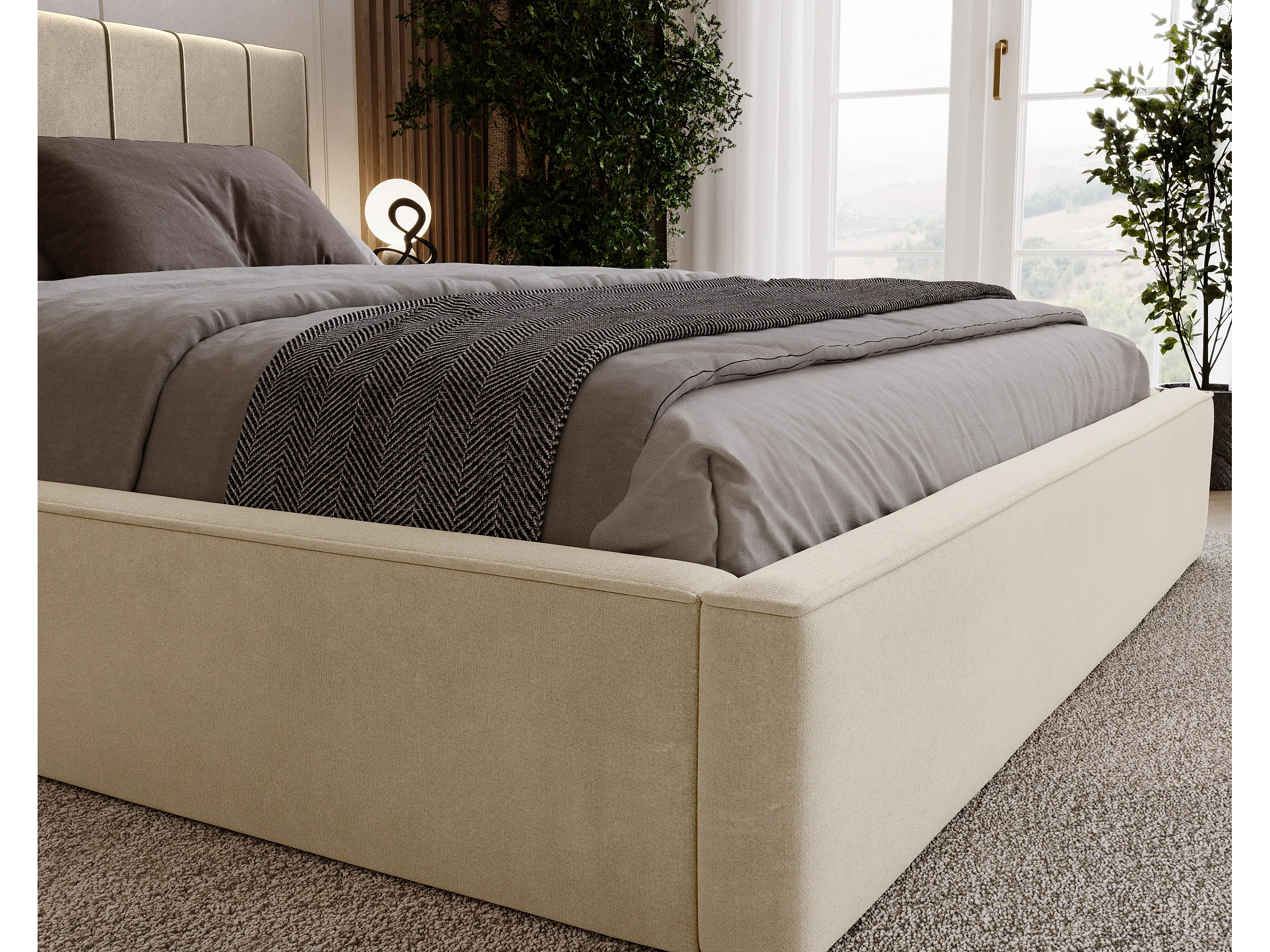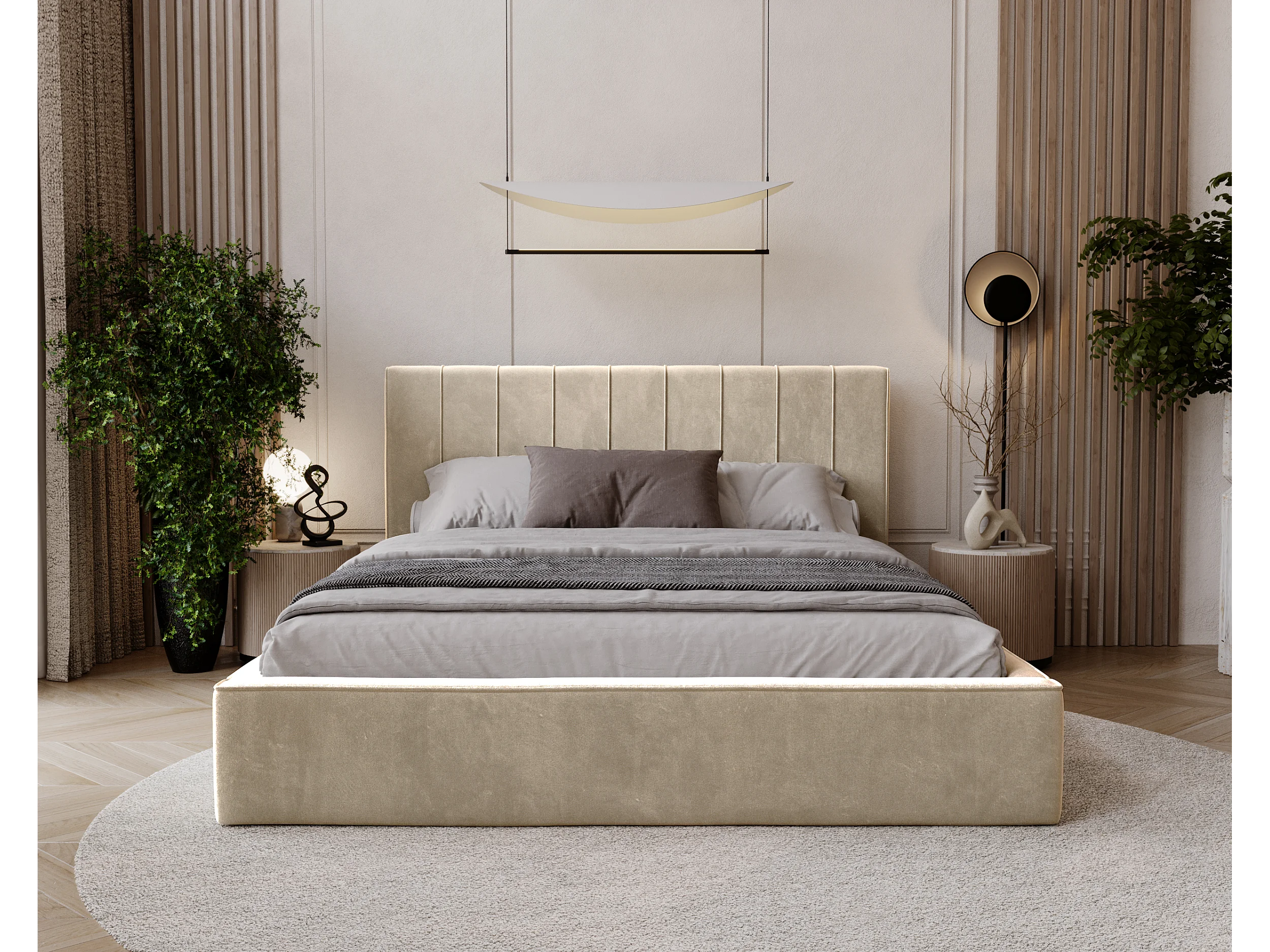 BESILIO Podwójne łóżko 120x200 Tina - Łóżko slim do sypialni ze stelażem i pojemnikiem na pościel- Tkanina welurowa- Beżowy