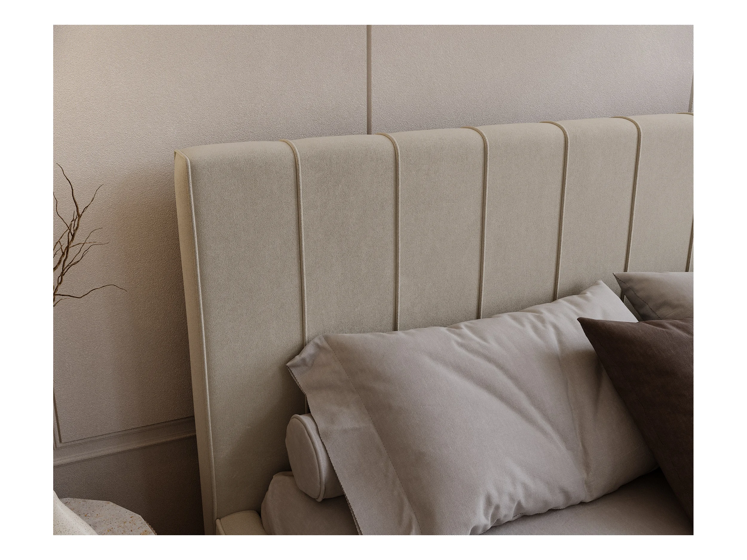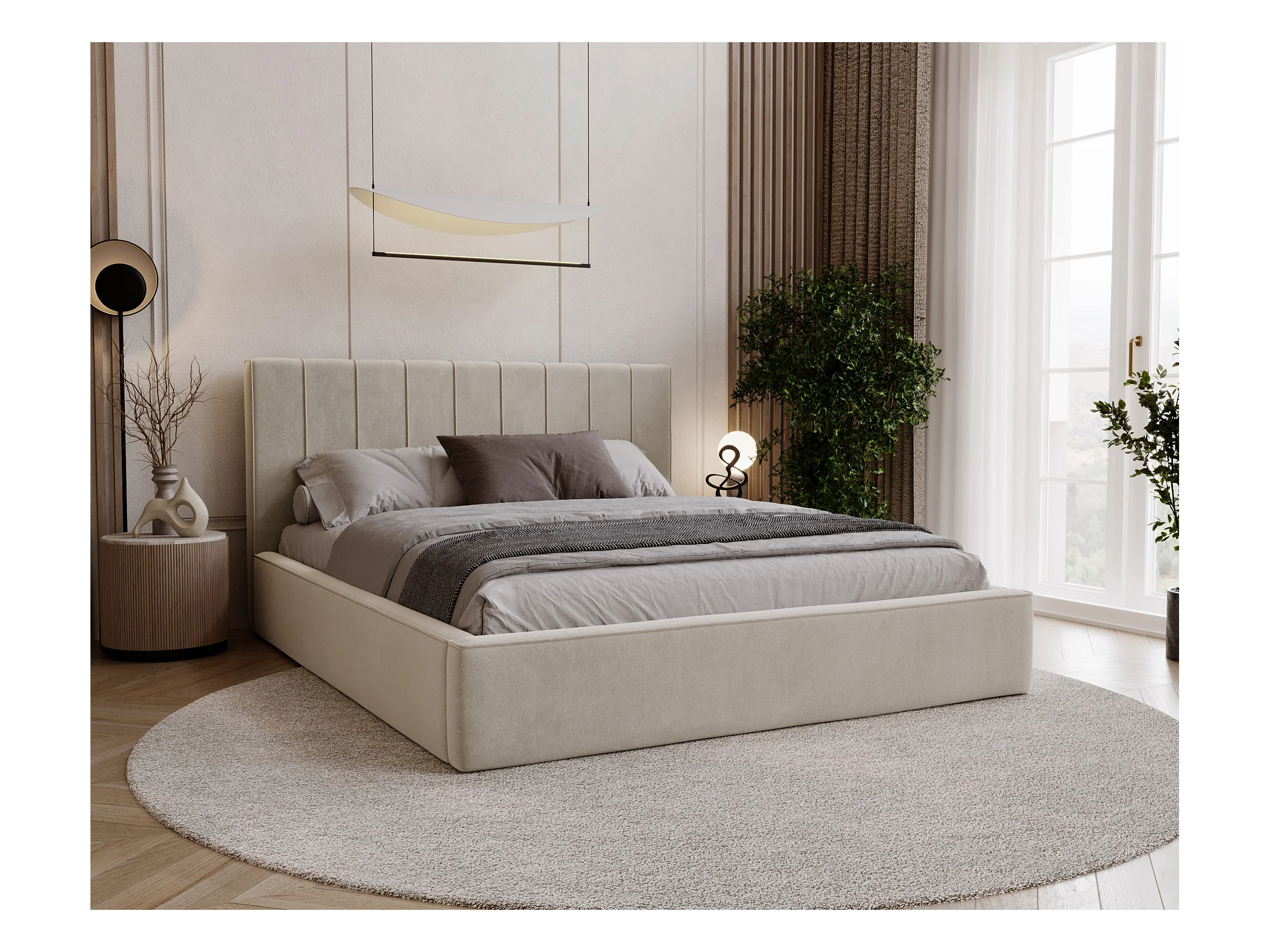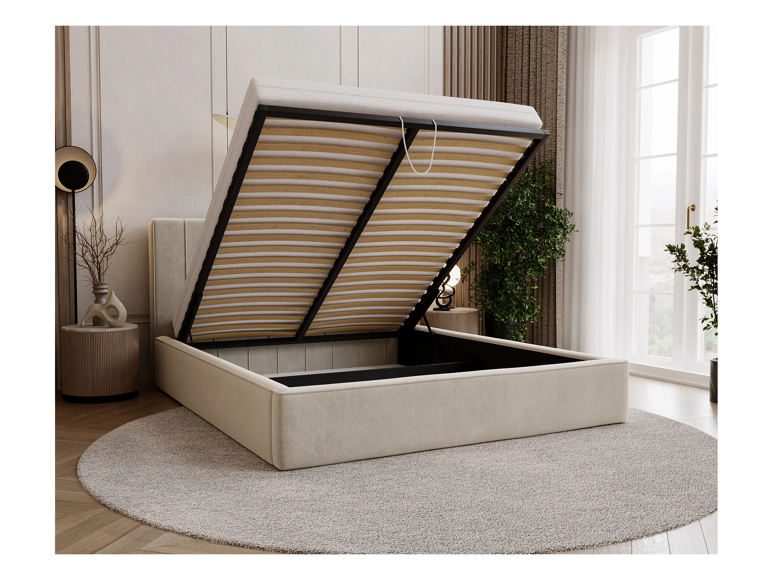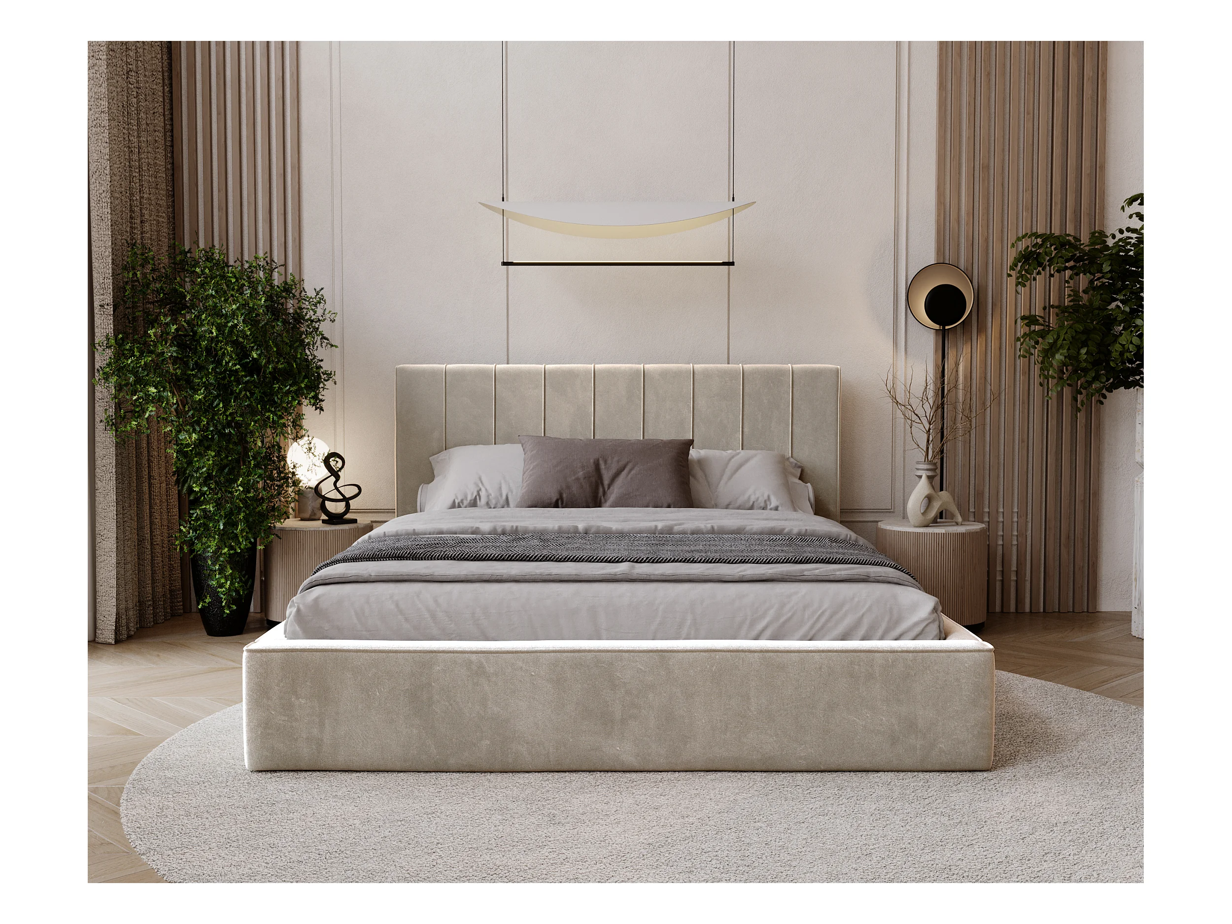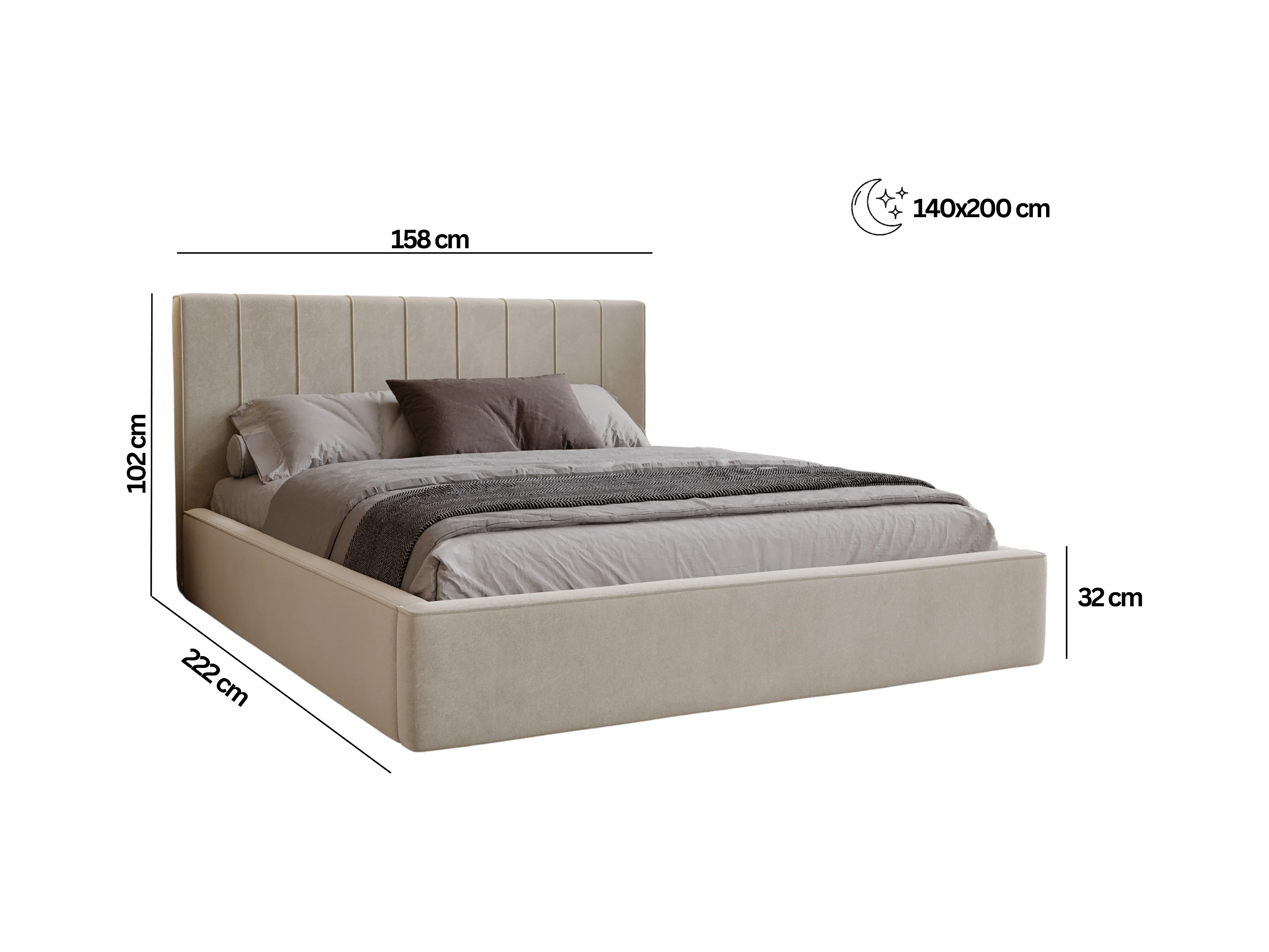 BESILIO Stylowe łóżko tapicerowane 140x200 Persea - stelaż metalowy, pojemnik na pościel, ozdobna lamówka - Beżowy