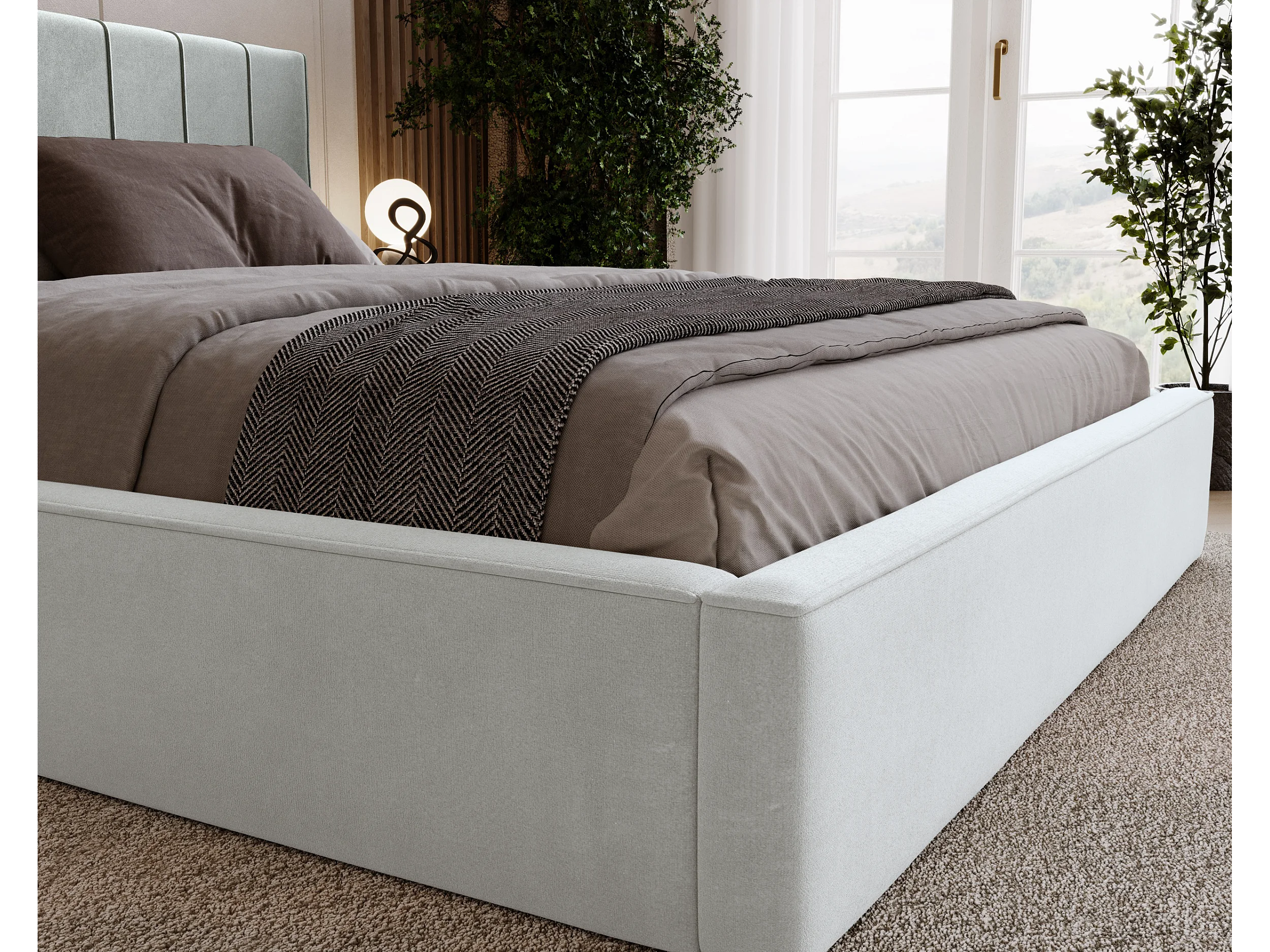 BESILIO Łóżko tapicerowane Boucle 160x200 Velora - stelaż listwowy, wezgłowie, pojemnik, łóżko slim - Jasnoszary