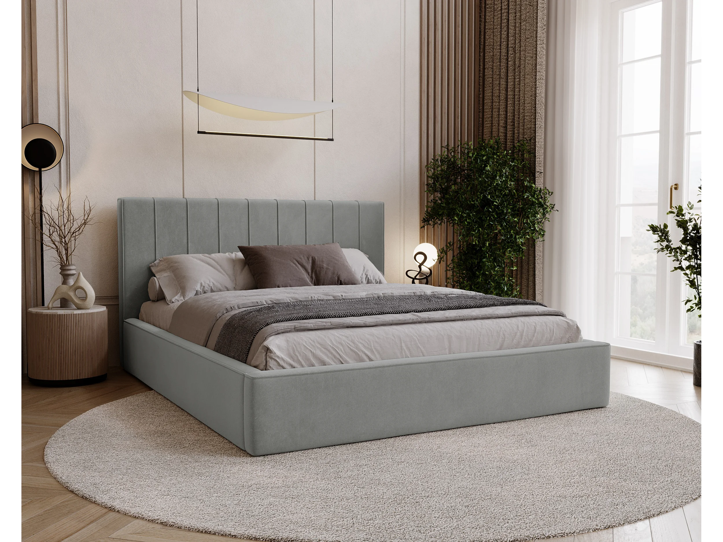 BESILIO Podwójne łóżko 180x200 Tina - Łóżko slim do sypialni ze stelażem i pojemnikiem na pościel- Tkanina welurowa- Jasnoszary