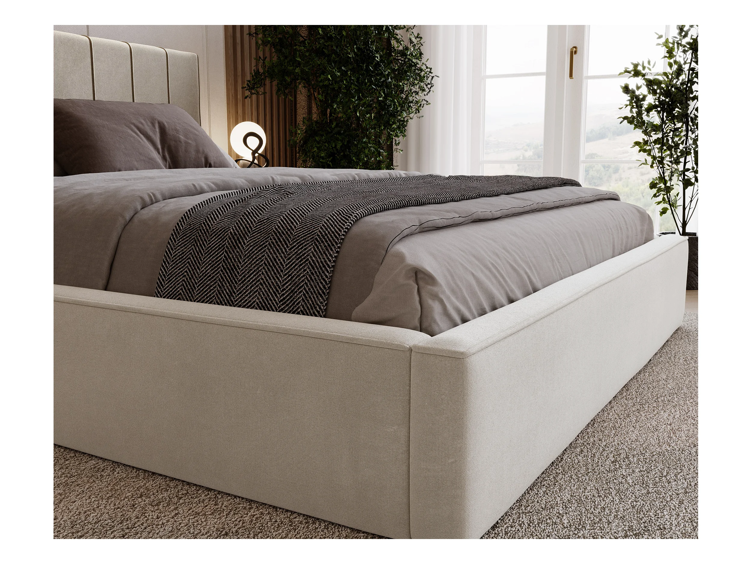 BESILIO Stylowe łóżko tapicerowane 200x200 Persea - stelaż metalowy, pojemnik na pościel, ozdobna lamówka - Beżowy