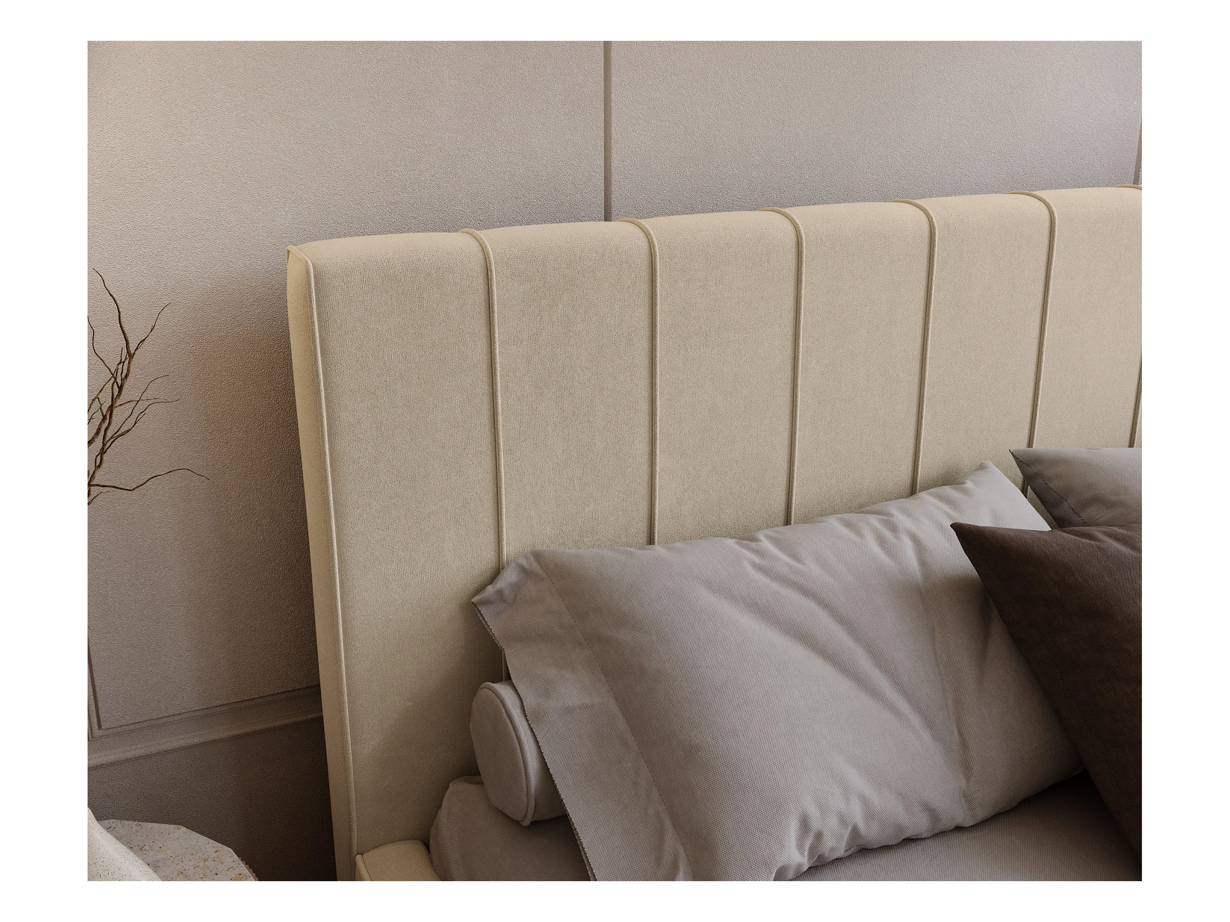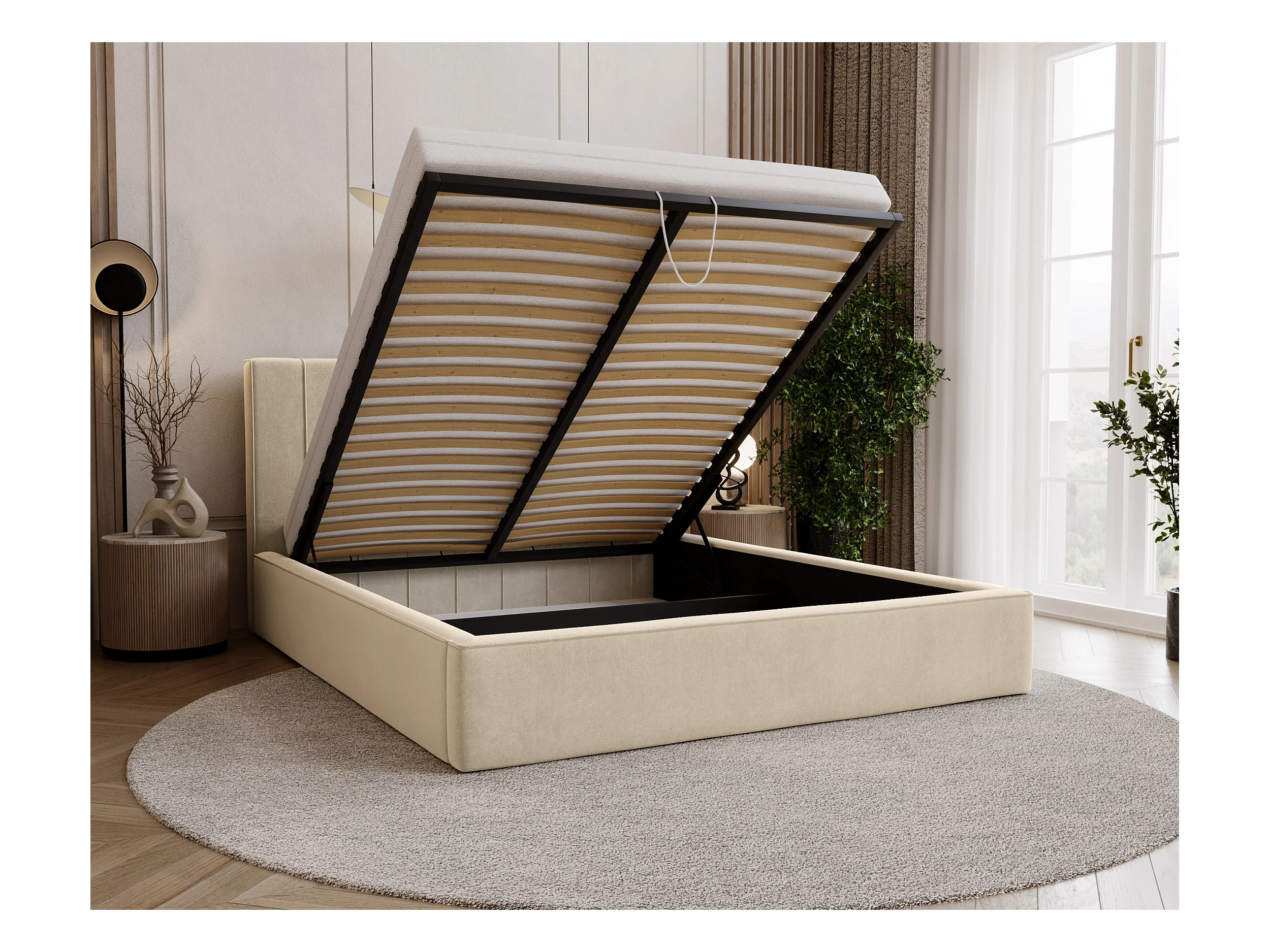 BESILIO Stylowe łóżko tapicerowane 200x200 Persea - stelaż metalowy, pojemnik na pościel, ozdobna lamówka - Kremowy