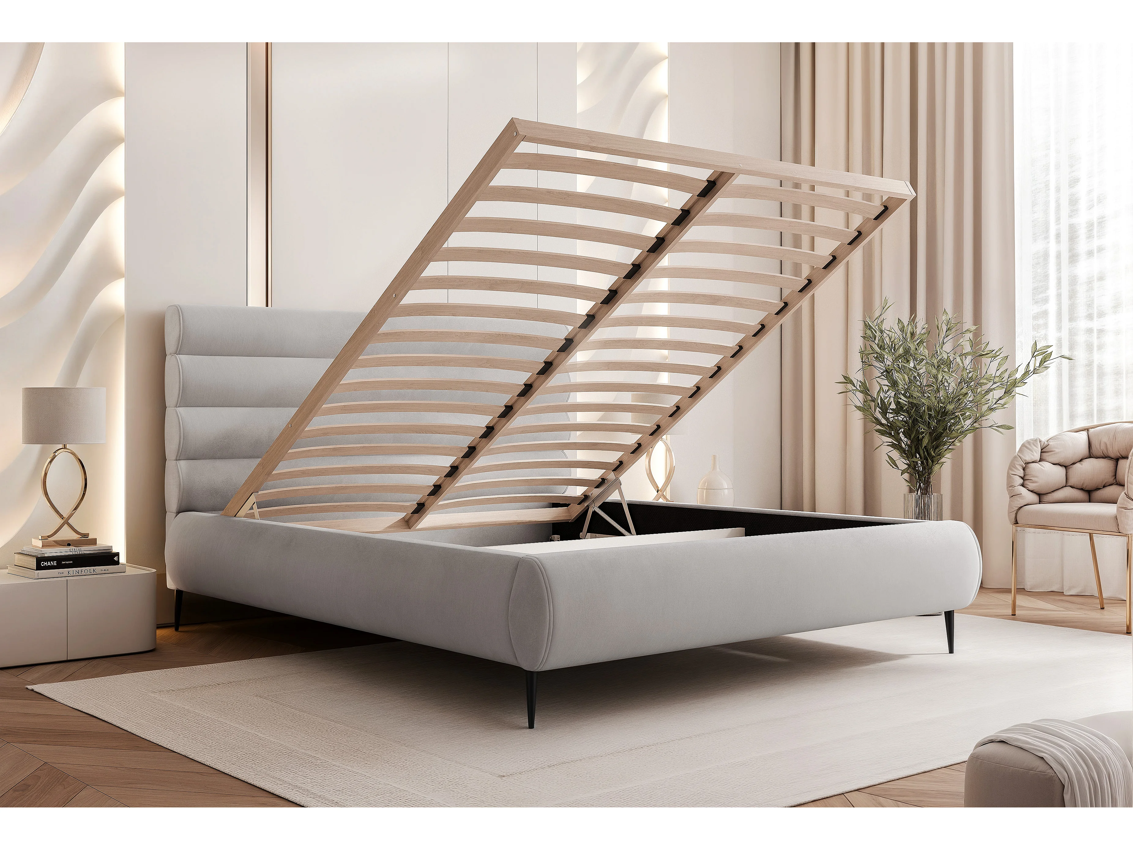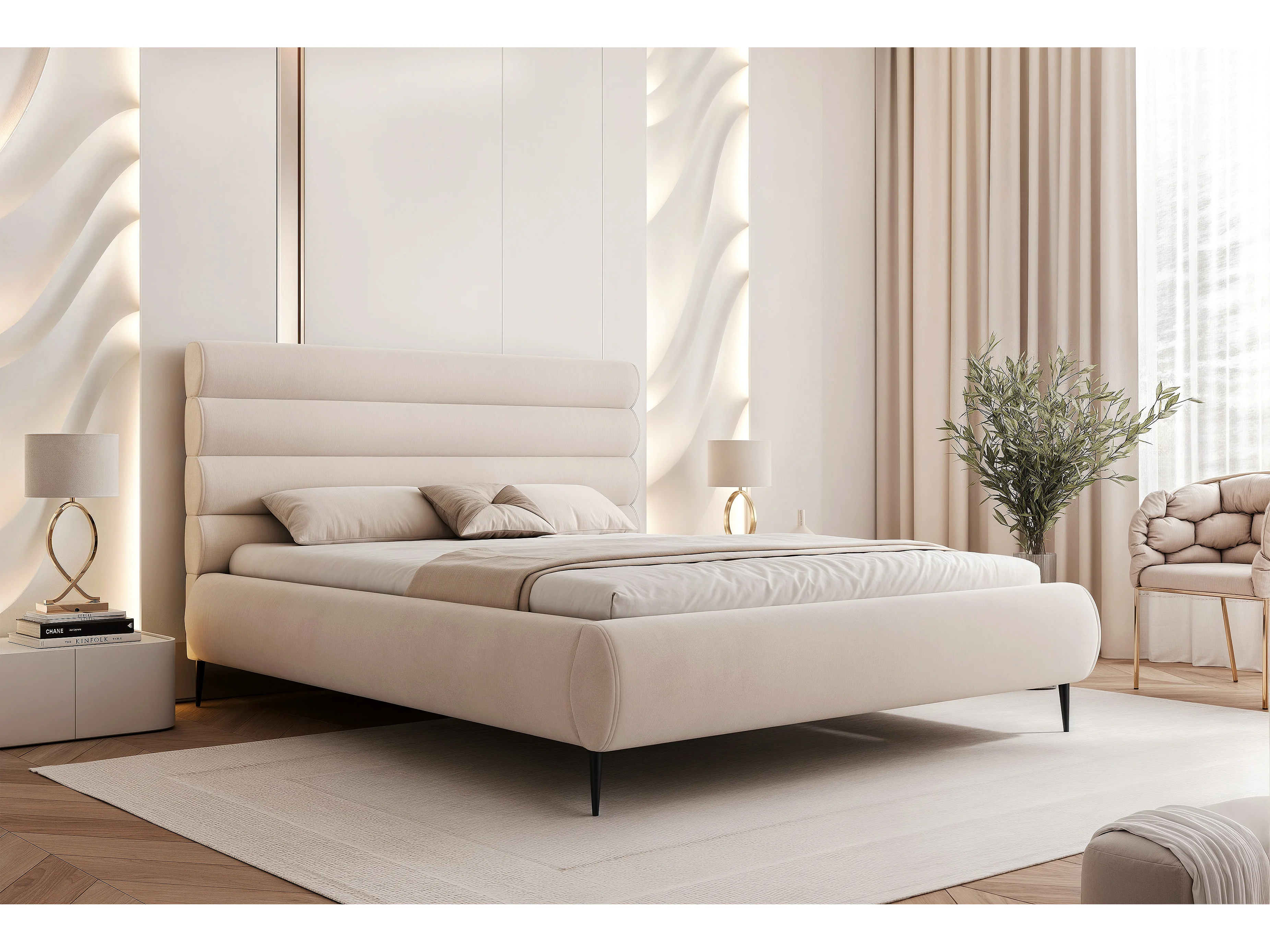 BESILIO Stylowe łóżko z pojemnikiem 180x200 Marbella II- łóżko tapicerowane na wysokich nogach, stelaż drewniany - Kremowe