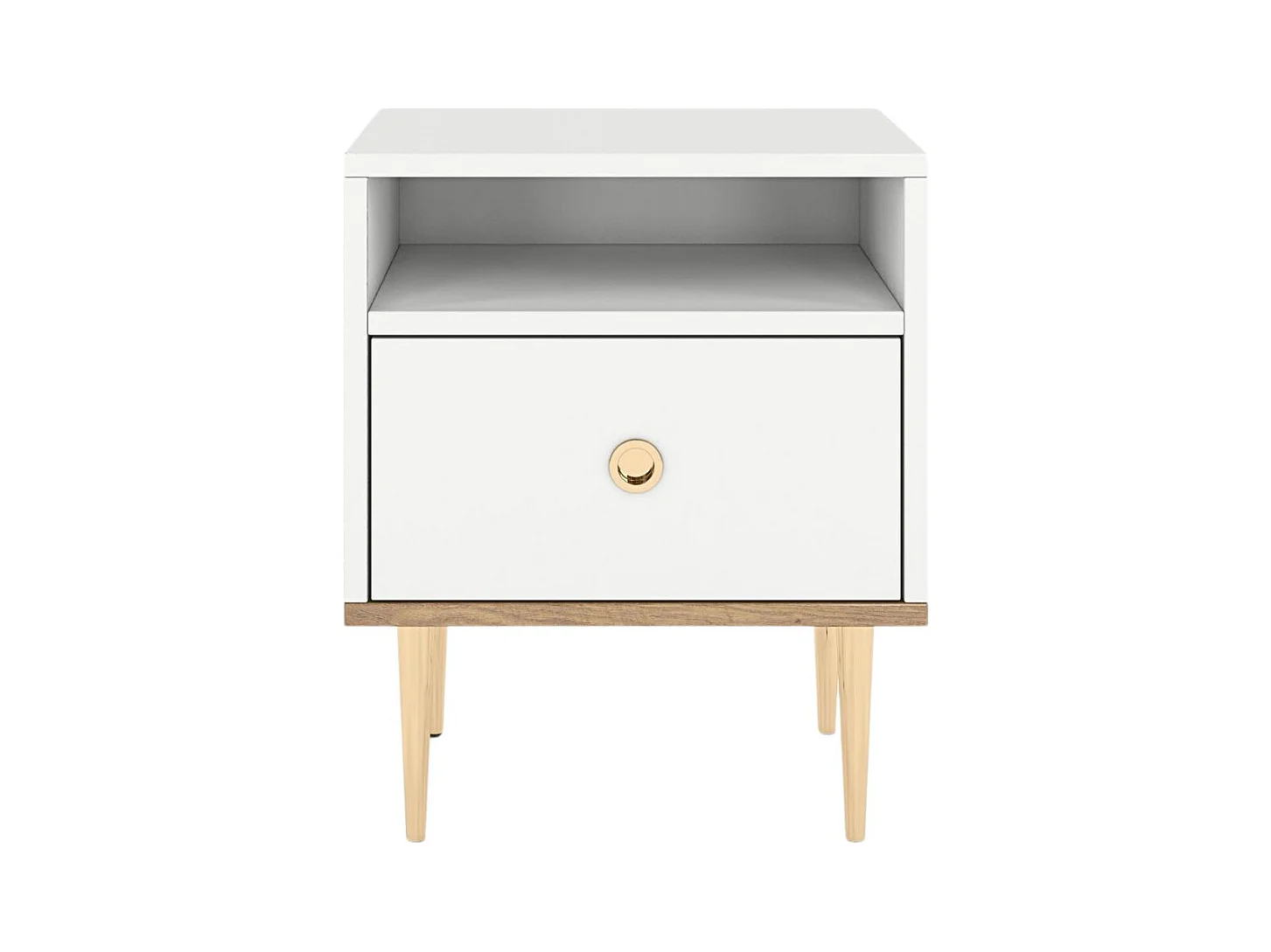 Stolik Nocny Elegancki Nova – Design z złotym uchwytem, fasada Geriffelt, praktyczny i nowoczesny, 54x56x39 cm, matowa biel, czarne metalowe nogi