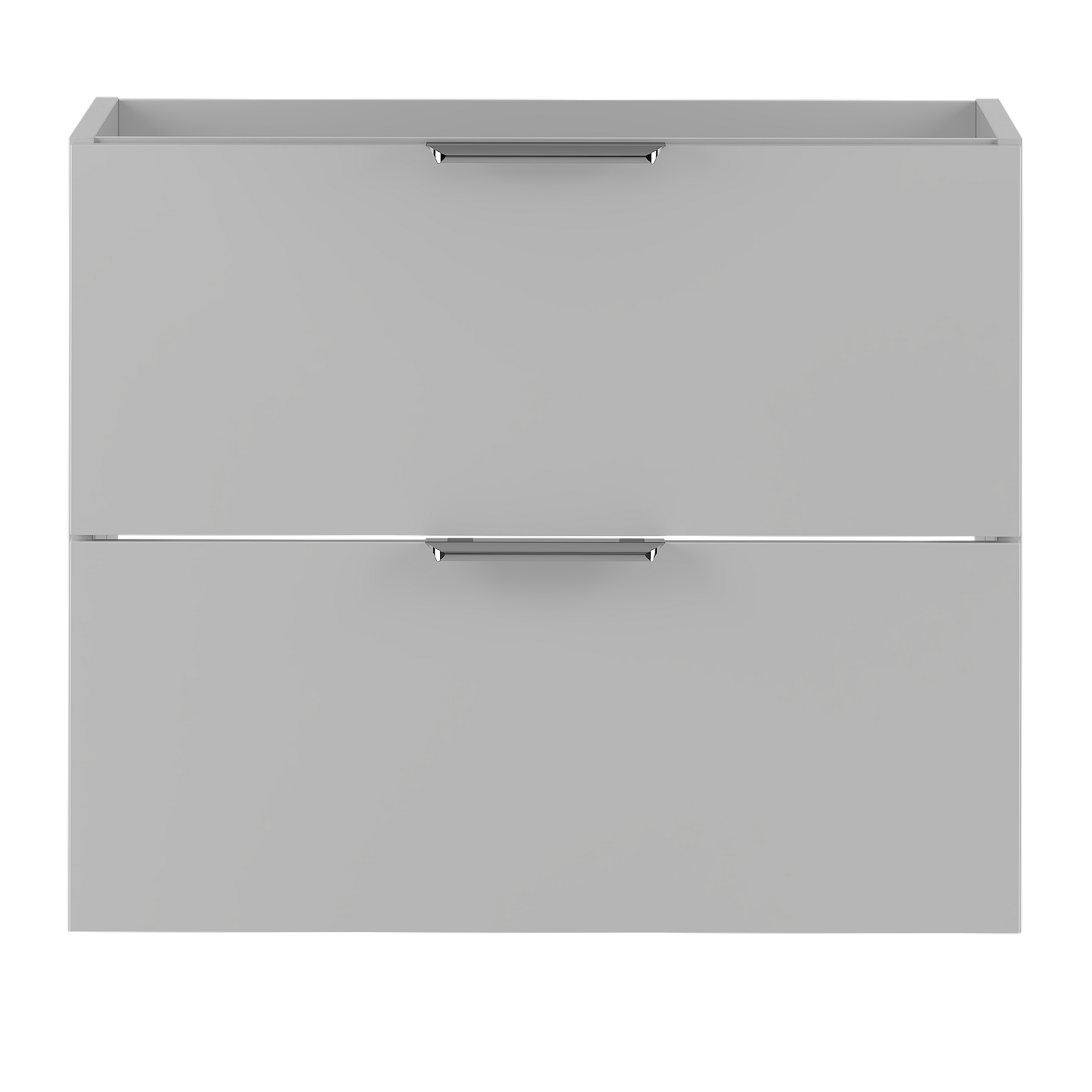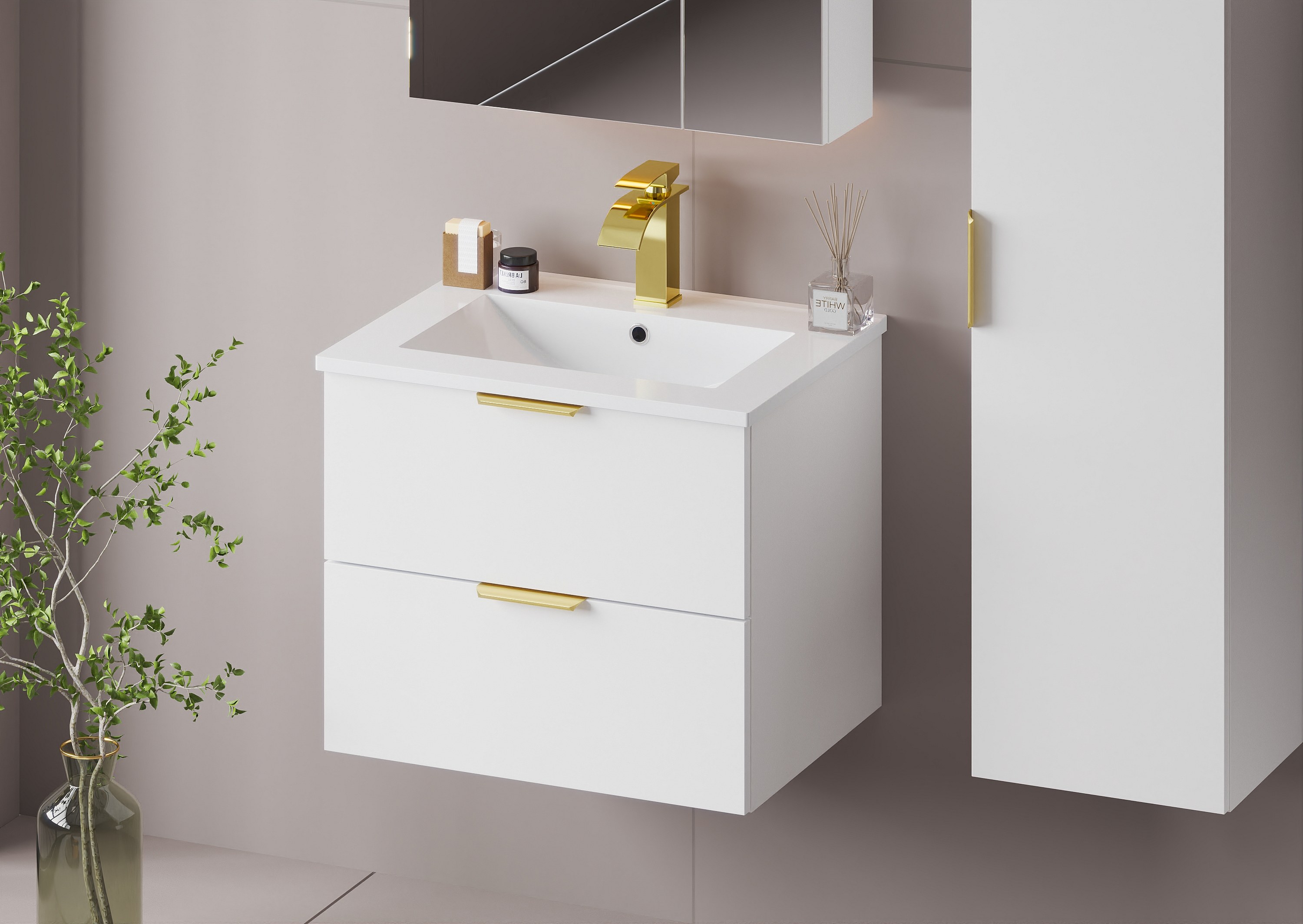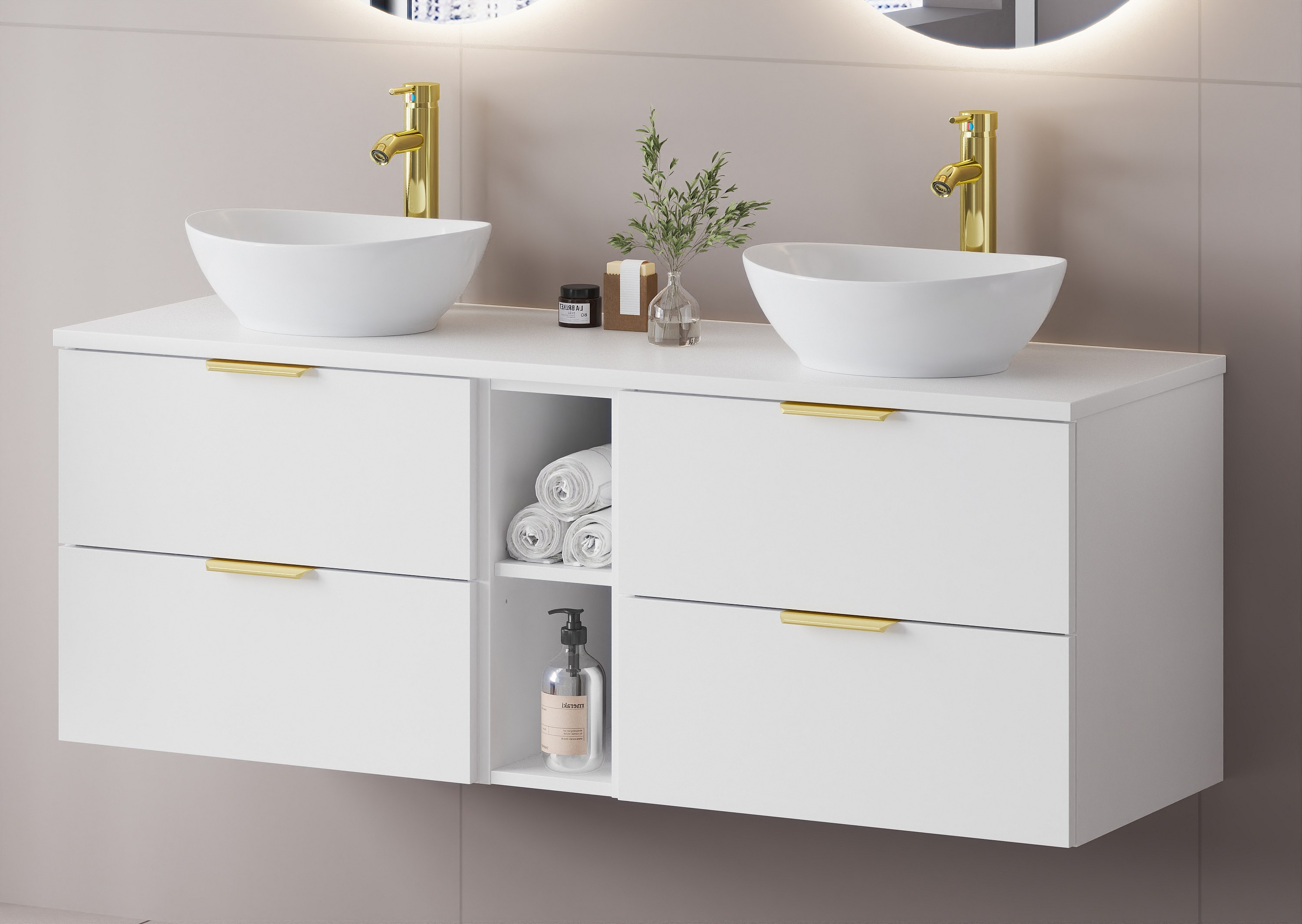 Uwagę przykuwają minimalistyczne, gładkie fronty oraz wyjątkowy akcent w postaci uchwytów – do każdej szafki dołączony jest komplet aż trzech ich wariantów kolorystycznych: czarny, złoty oraz chrom. To rozwiązanie daje pełną swobodę w dopasowaniu mebli do wybranej armatury i stylu wnętrza. Wszystkie elementy kolekcji są wiszące i wyposażone w system cichego domyku, co zwiększa komfort codziennego użytkowania.