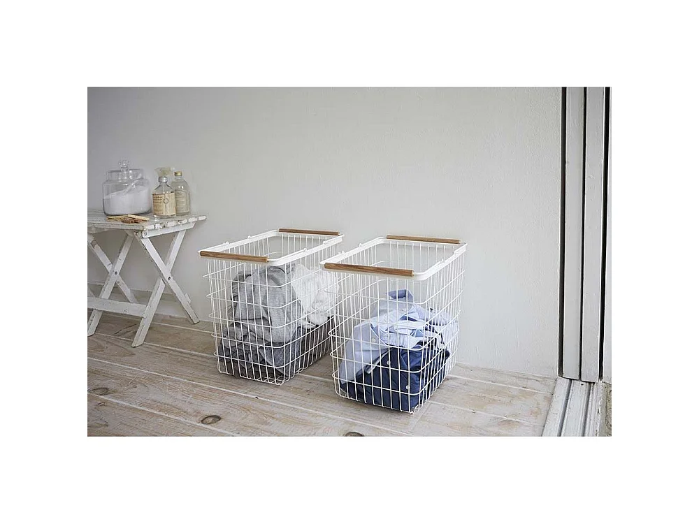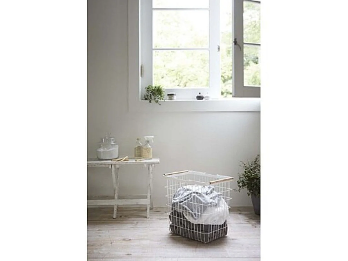 Biały metalowy kosz na pranie z drewnianymi uchwytami H38.5cm