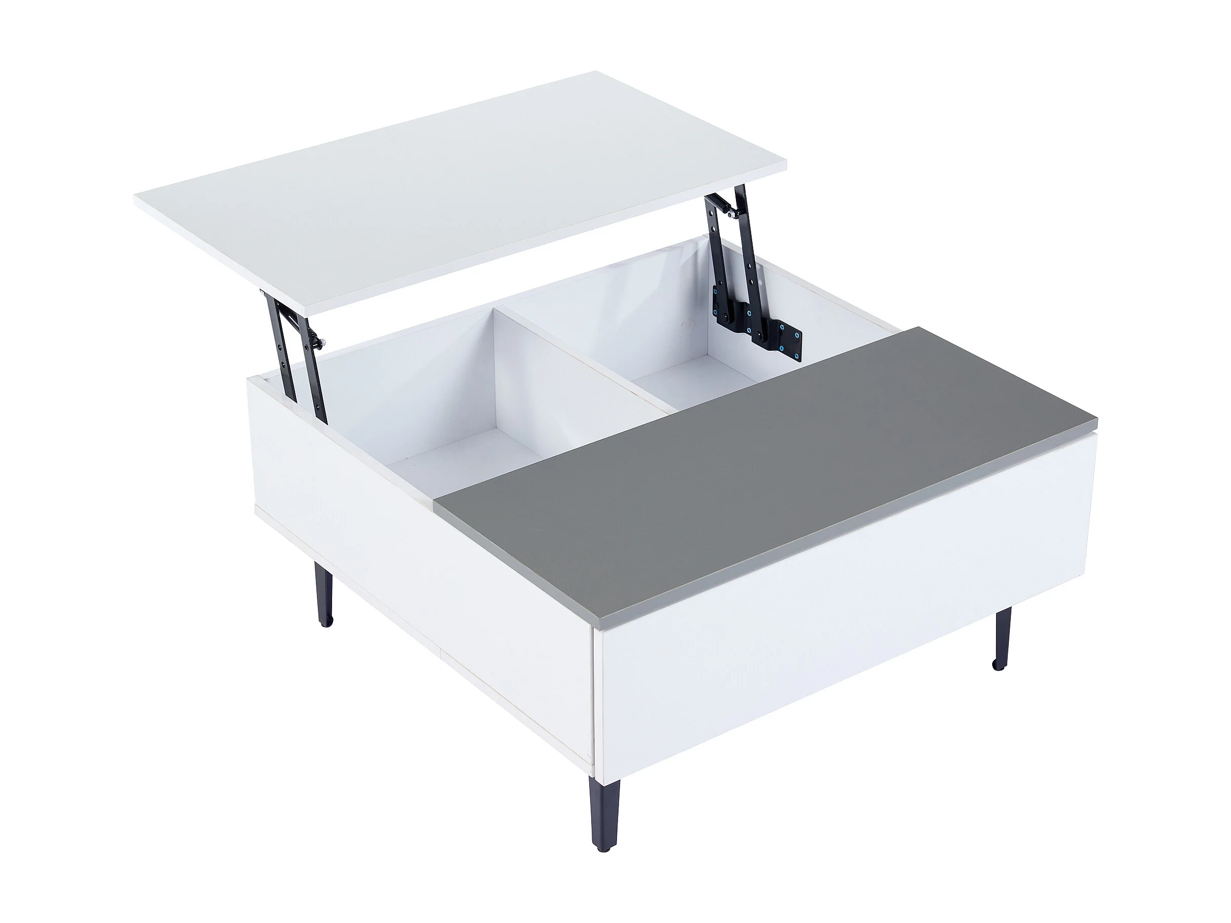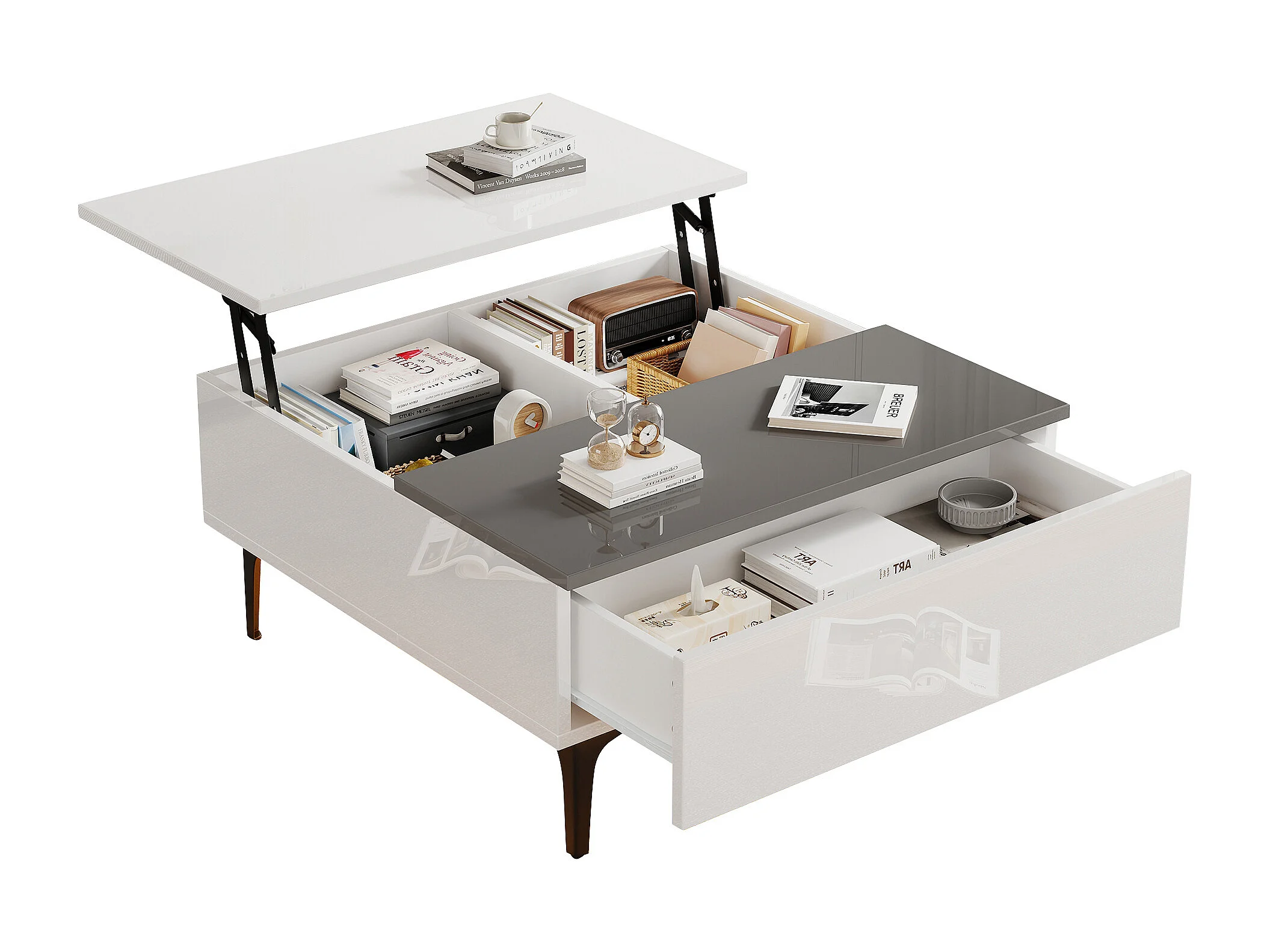 Stolik kawowy podnoszony 70x70x45cm - Obrotowy blat 360° - z 1 szufladą - Ukryta skrytka - Błyszczące wykończenie - Biały