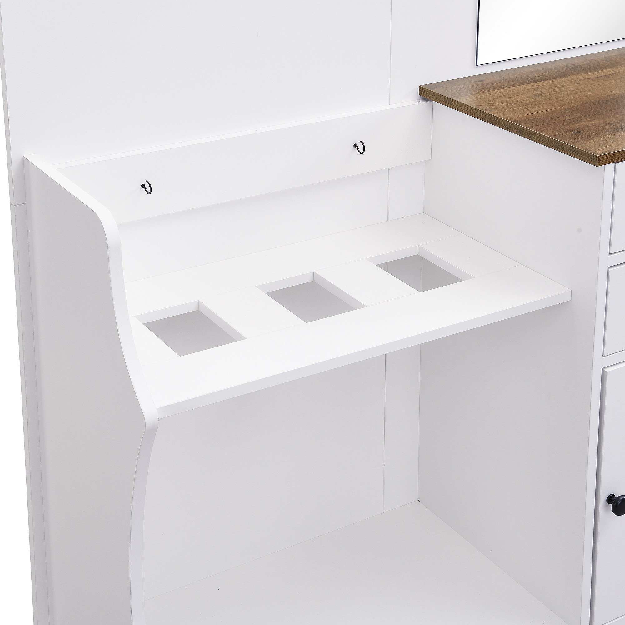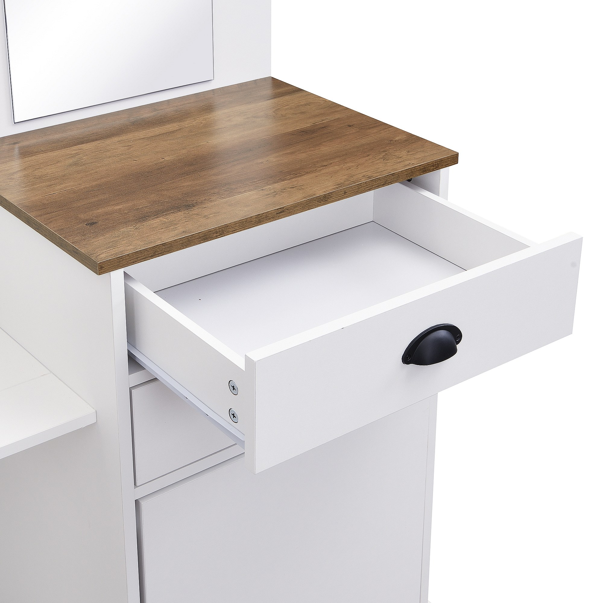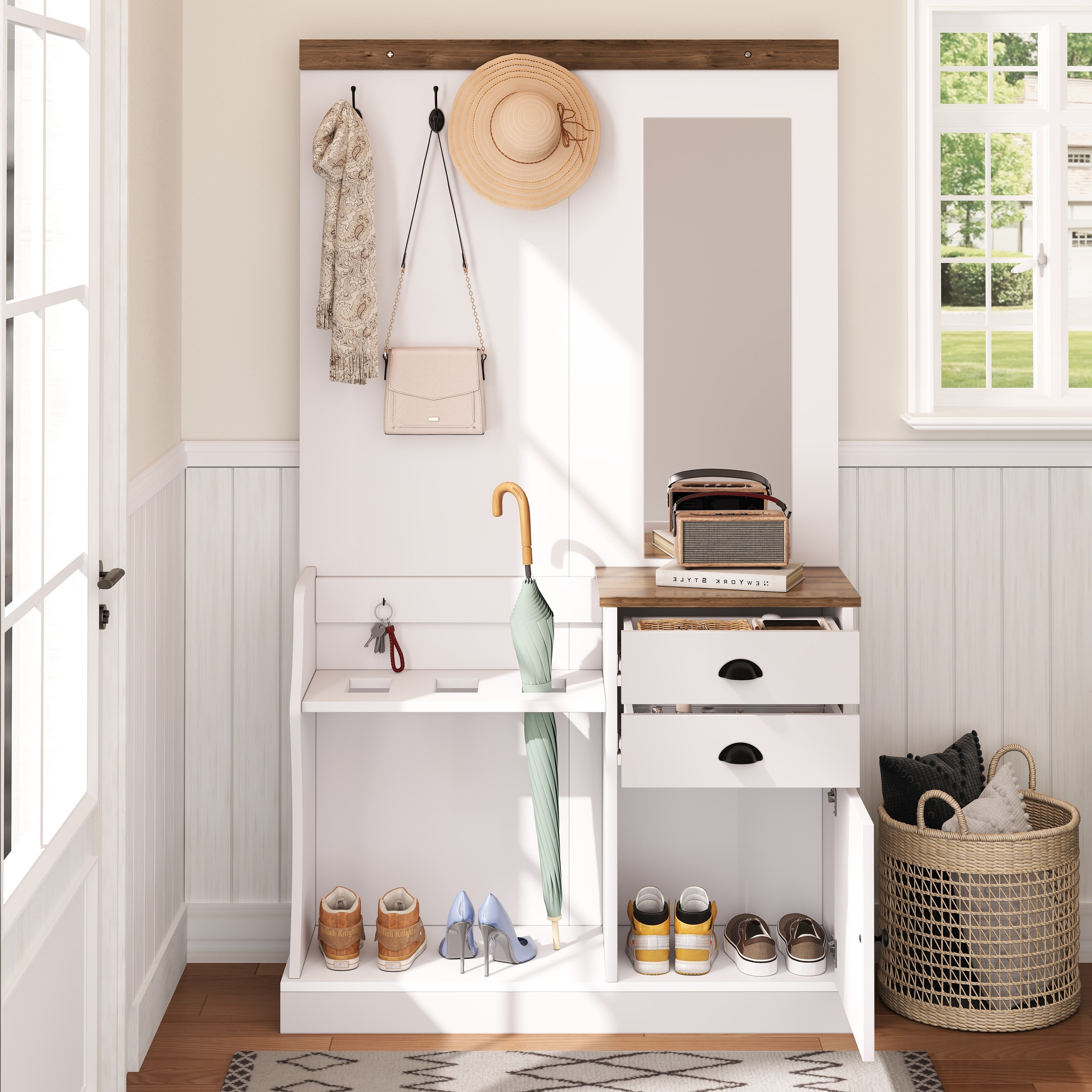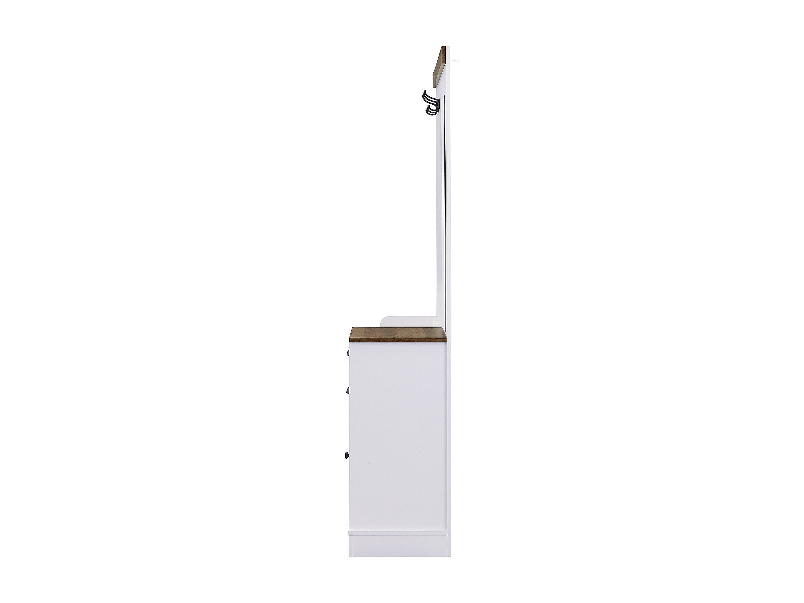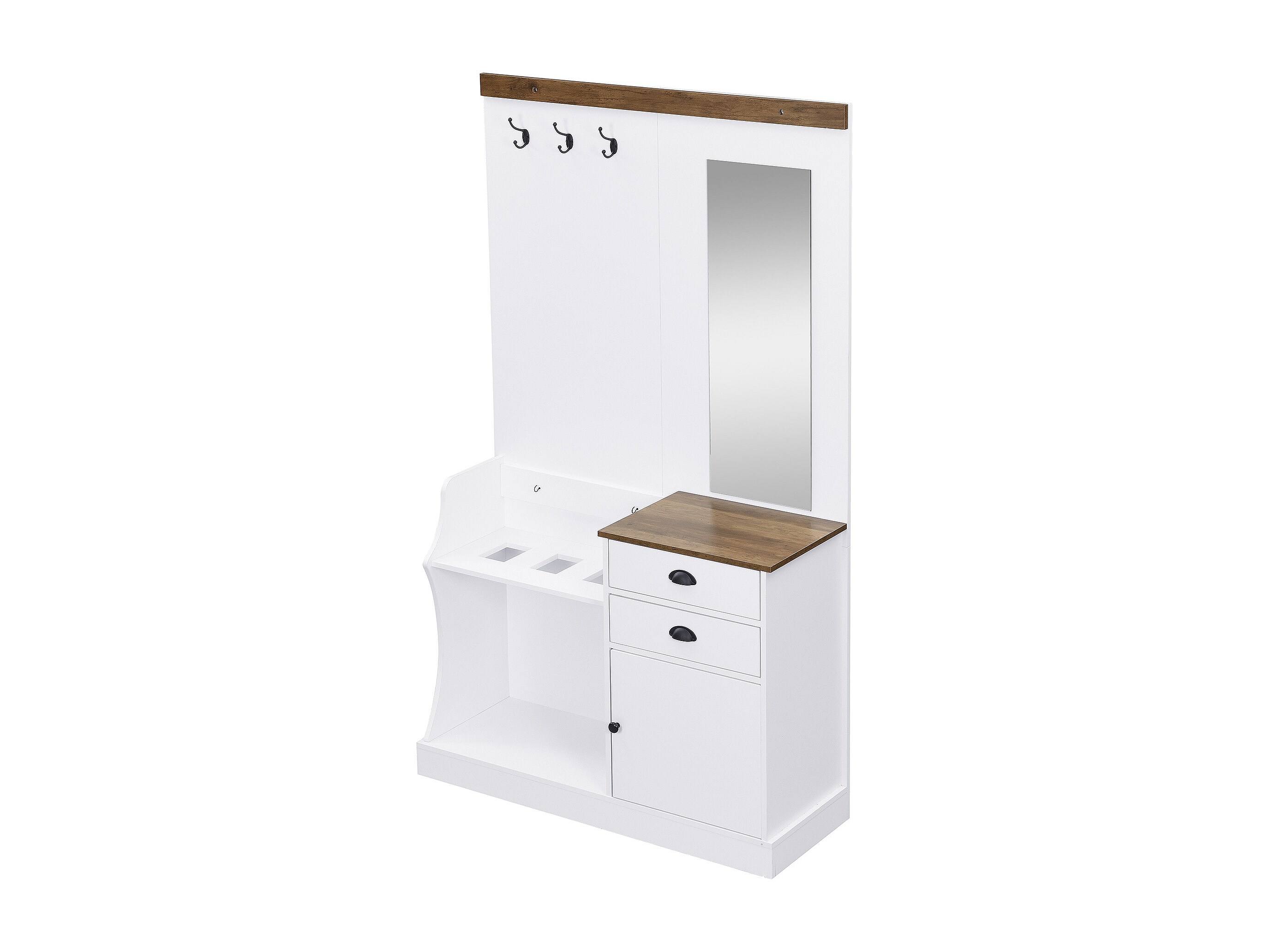 Biały wieszak na ubrania z 2 szufladami do przechowywania, lustrem, haczykami i stojakiem na parasole