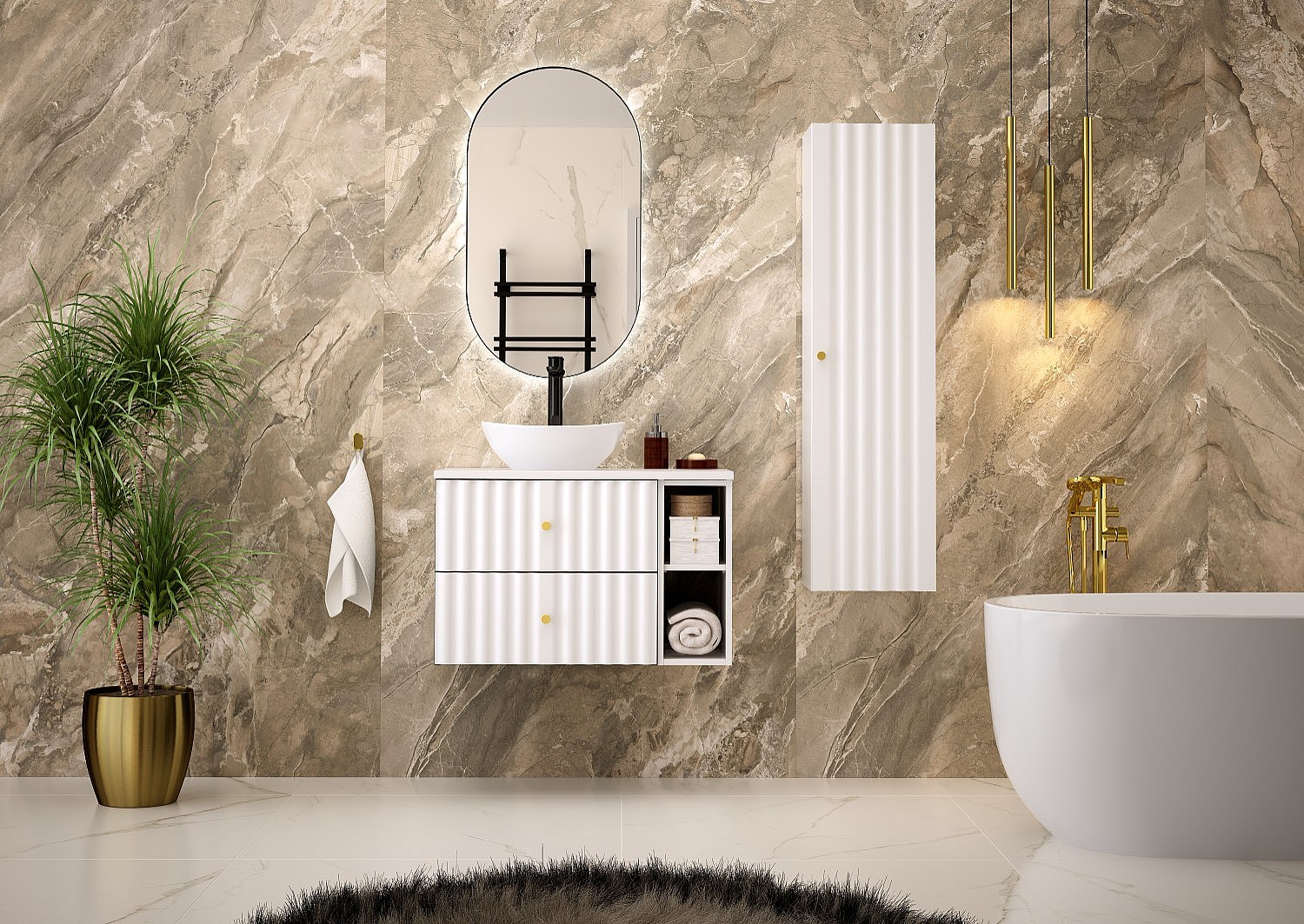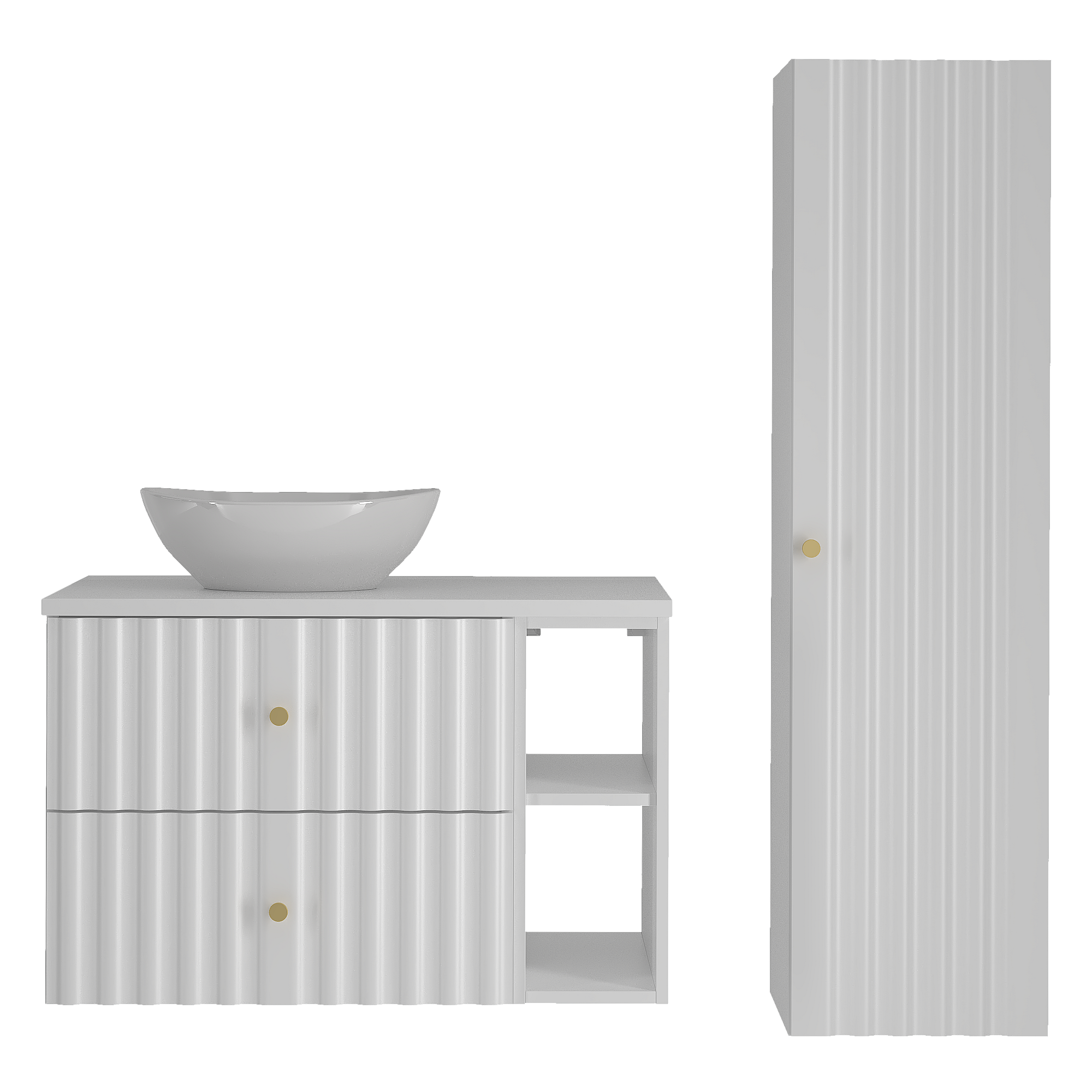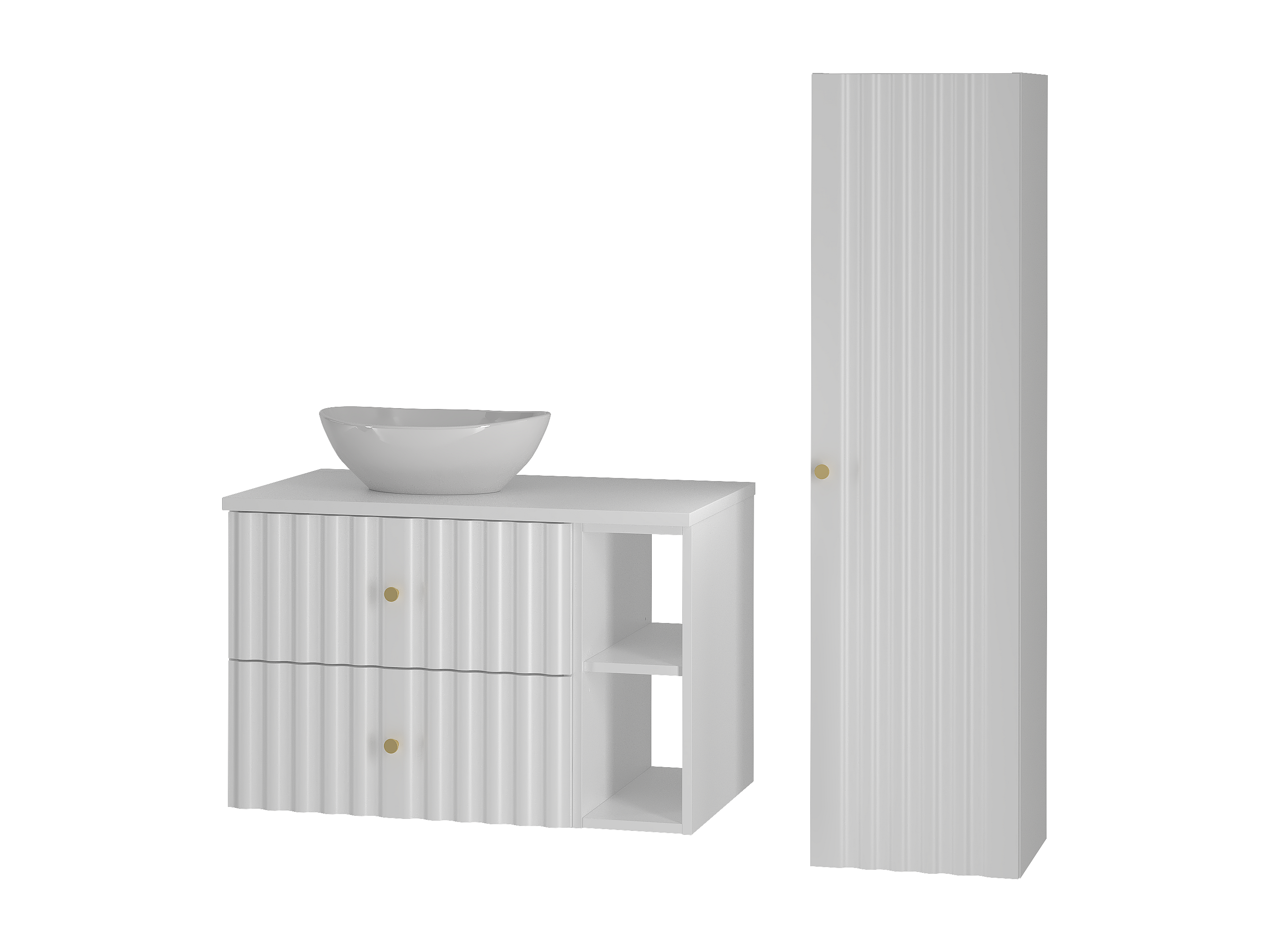 Biały Zestaw Łazienkowy 80cm Szafka z Blatem Umywalka Regał Słupek Ryflowane Fronty Aqua