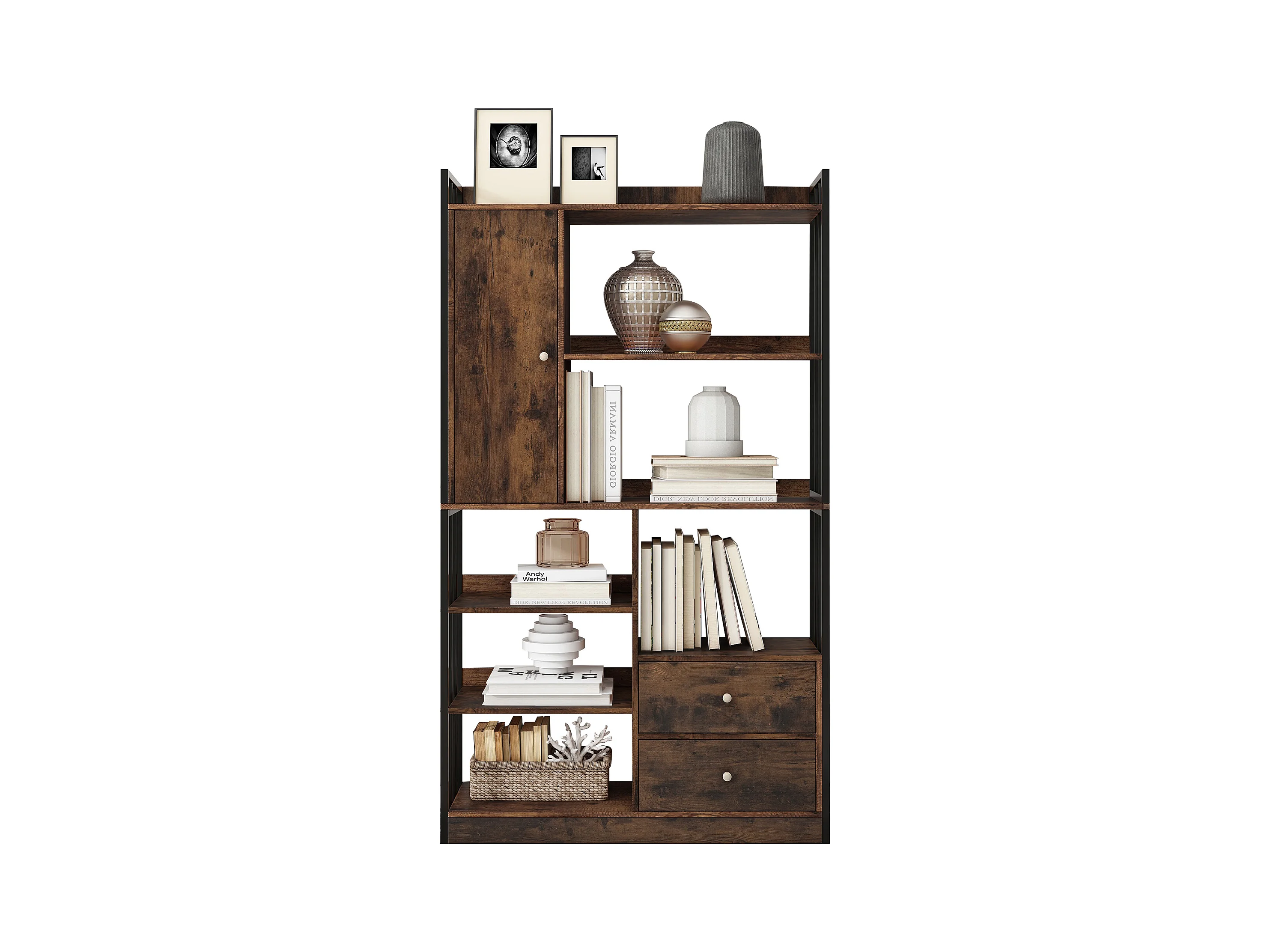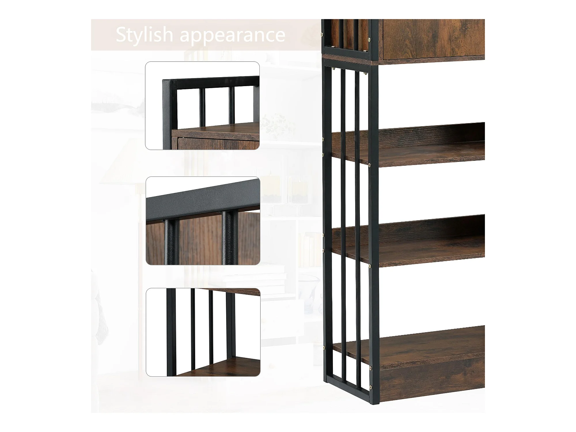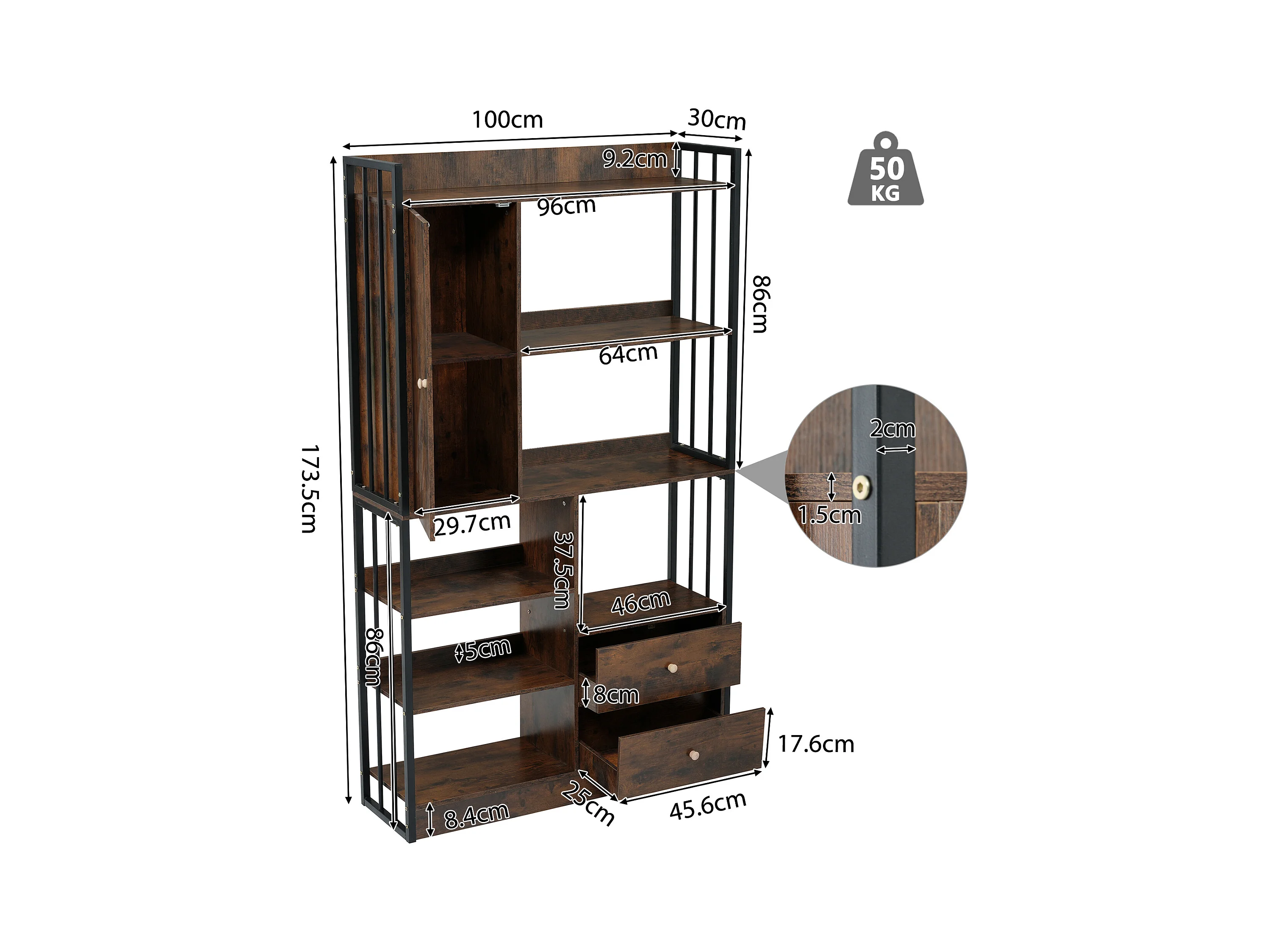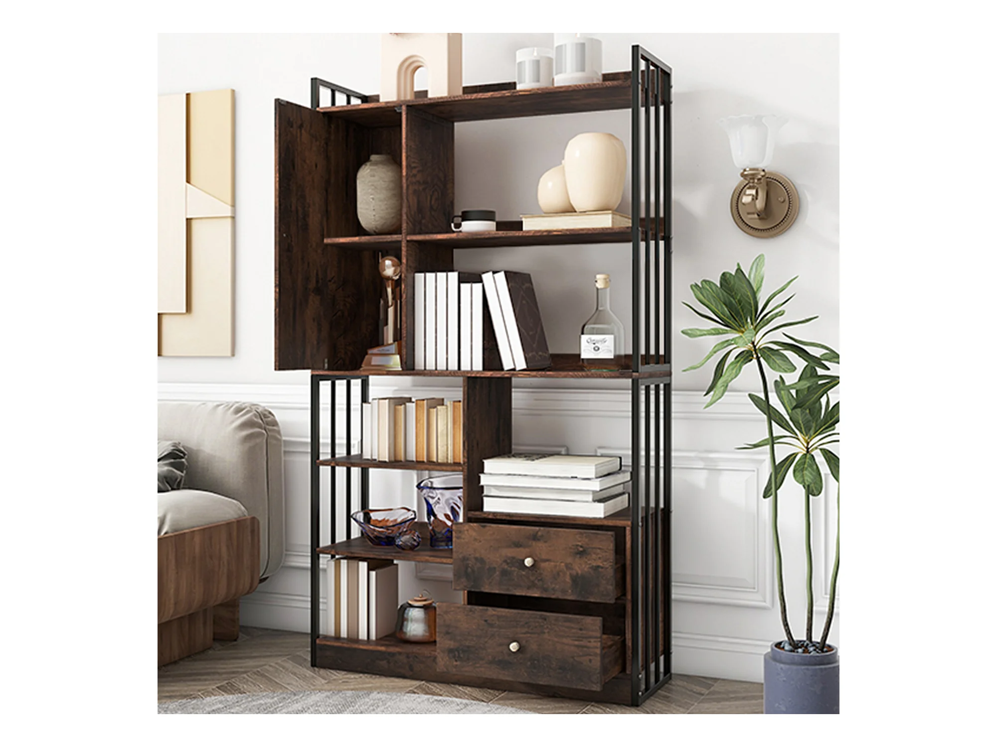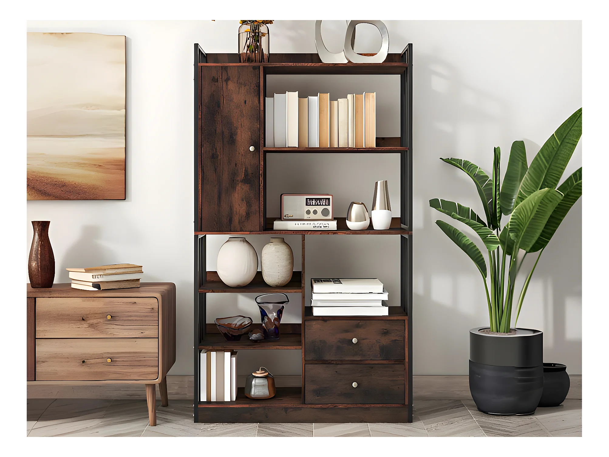 Biblioteka z 5 półkami, 1 drzwiami i 2 szufladami - styl industrialny - Brązowa i Czarna