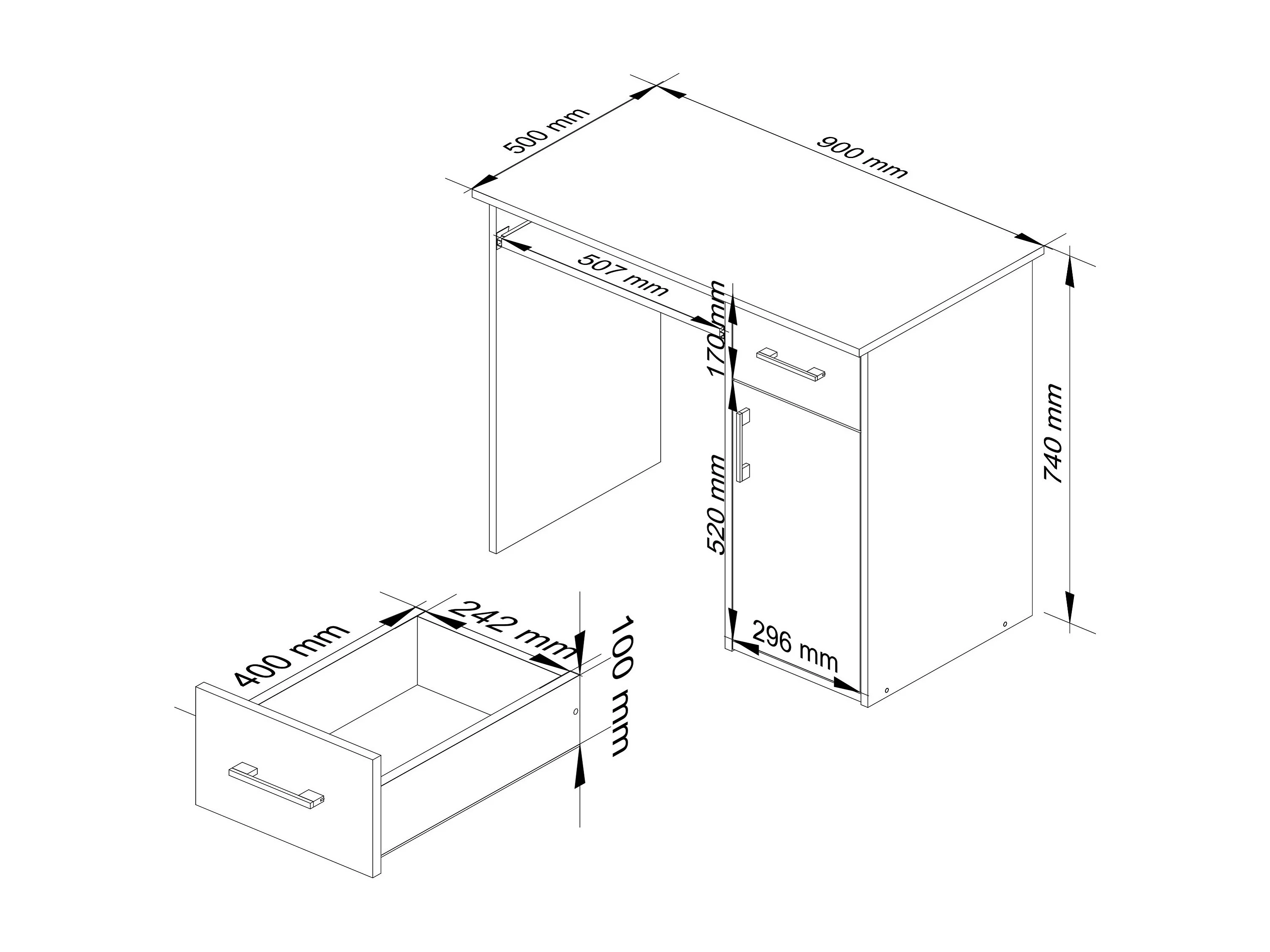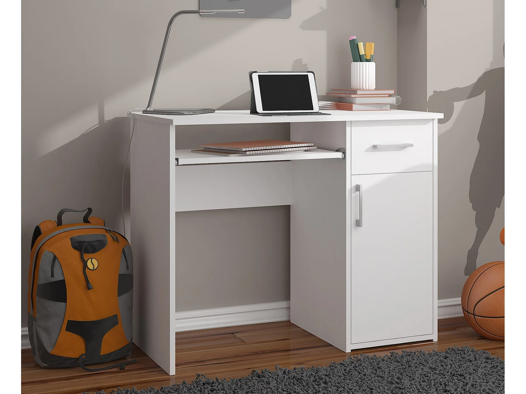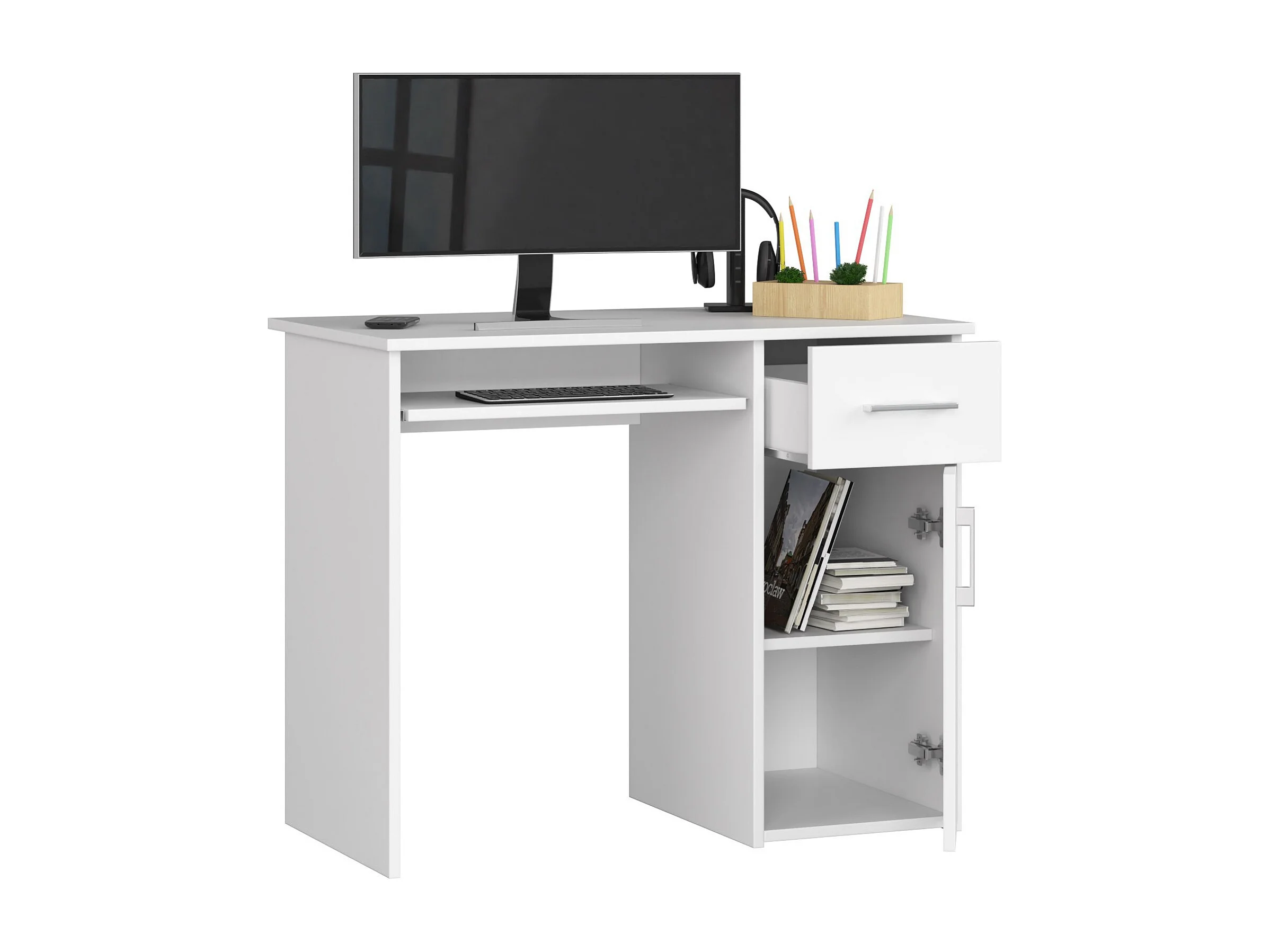 Biurko AKORD PIN Białe 90 cm biurko komputerowe 1 drzwi 1 szuflada kolor Biały mat 3 półki 90x50x74 cm