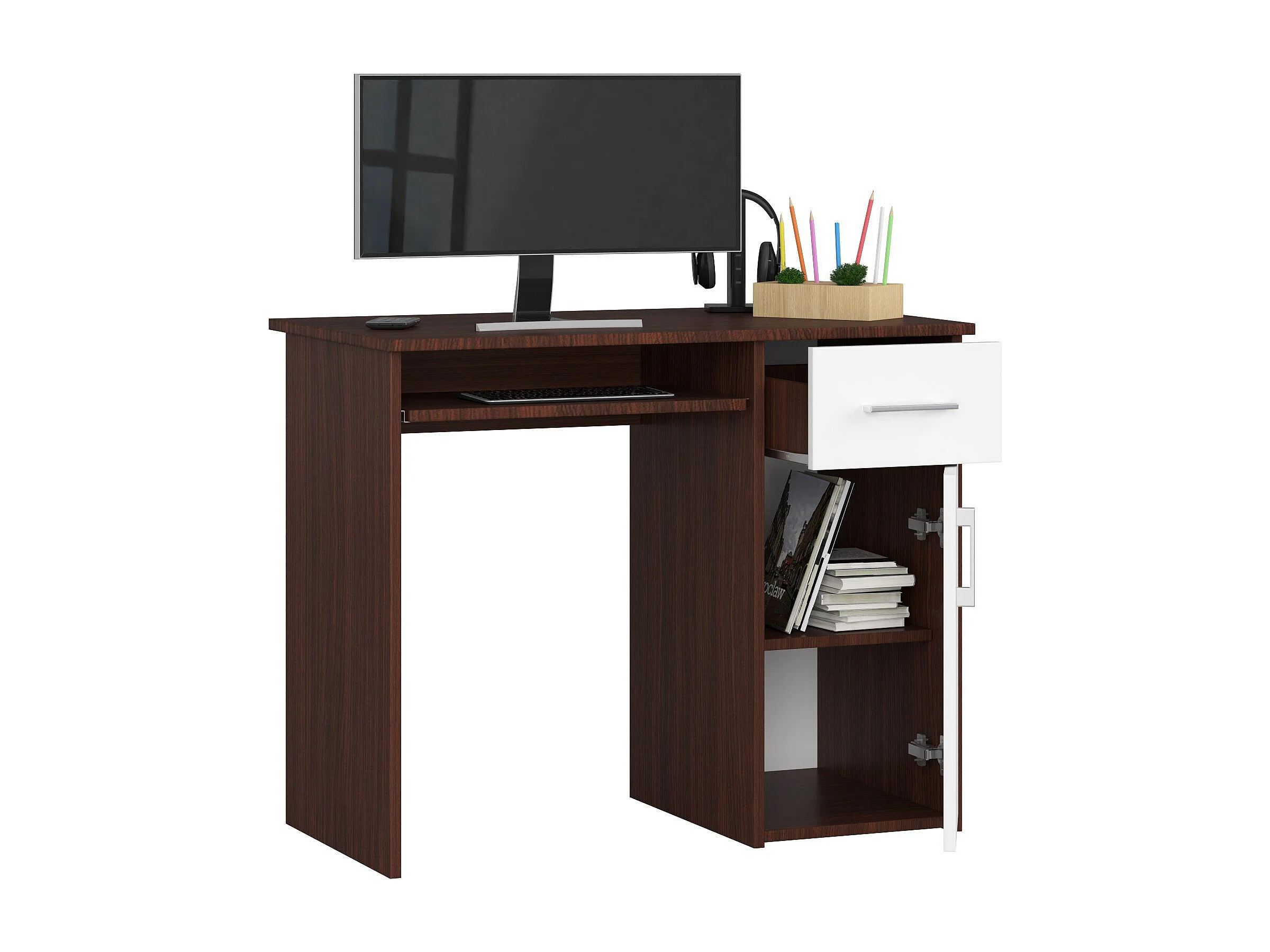 Biurko AKORD PIN Wenge 90 cm biurko komputerowe 1 drzwi 1 szuflada kolor Biały mat 3 półki 90x50x74 cm