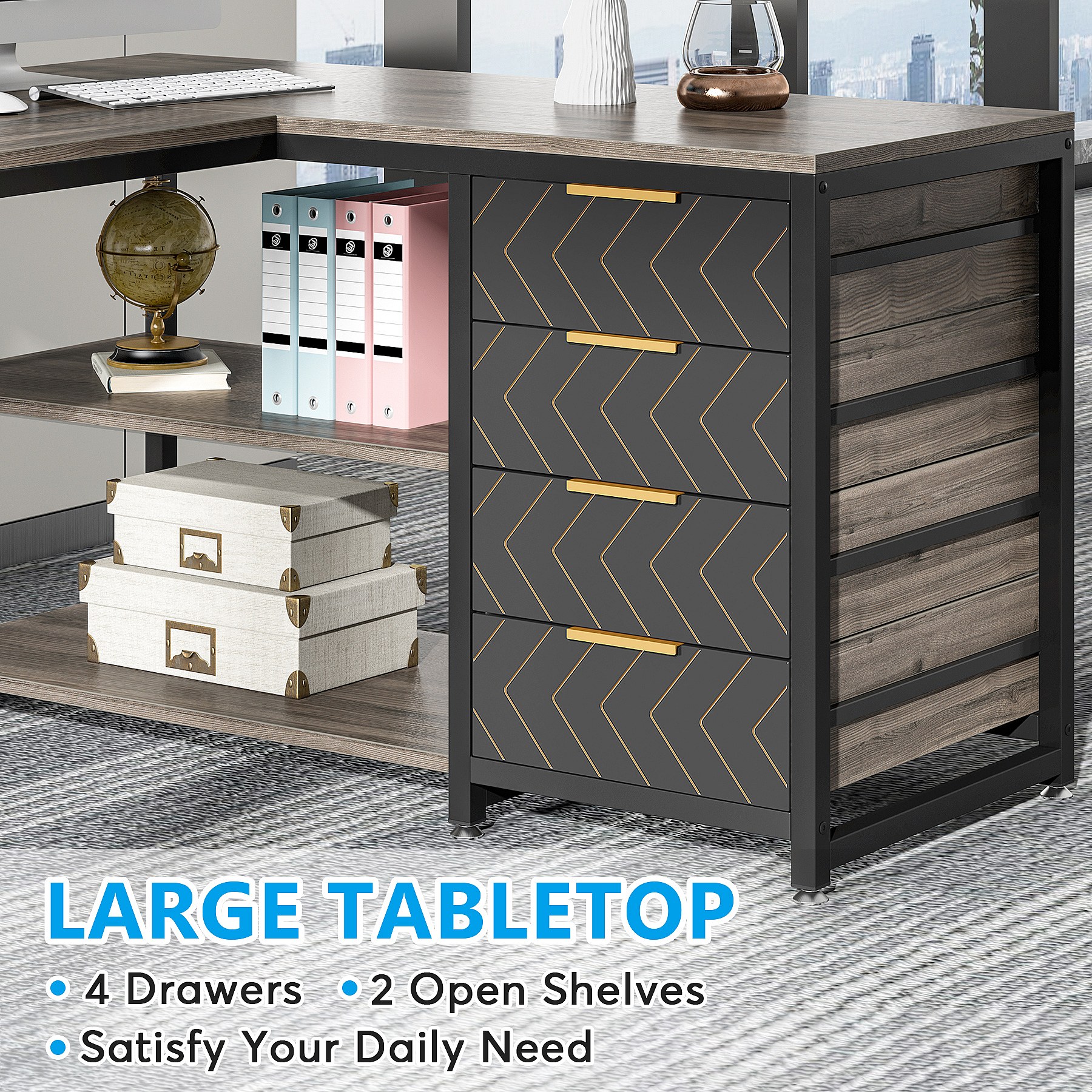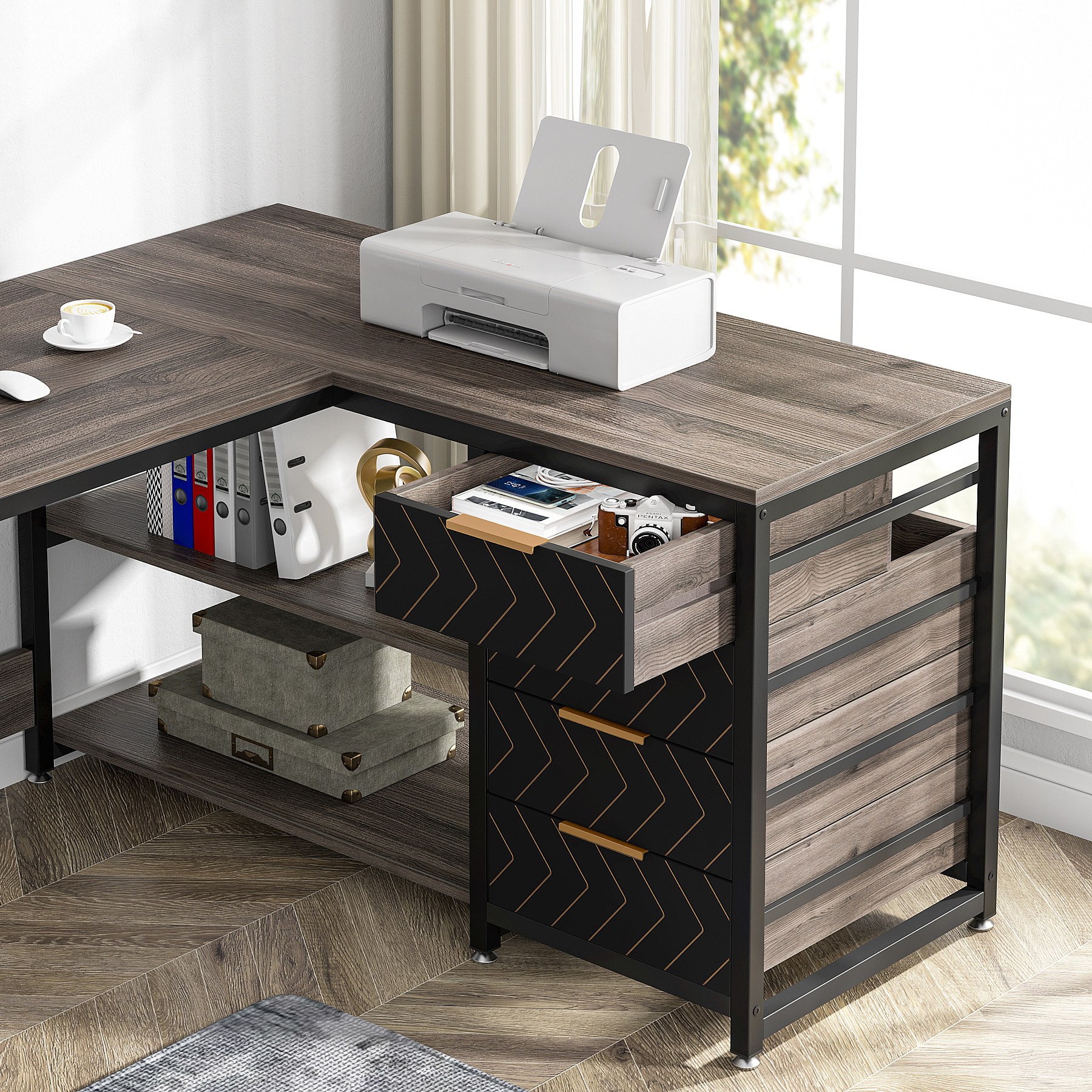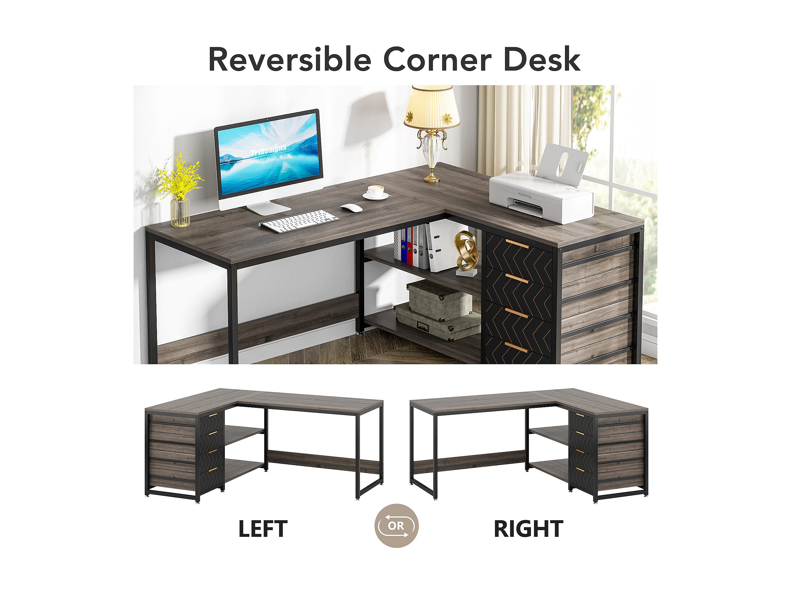 Biurko komputerowe w kształcie litery L z szufladami, biurko narożne z półkami, odwracalne biurko w kształcie litery L