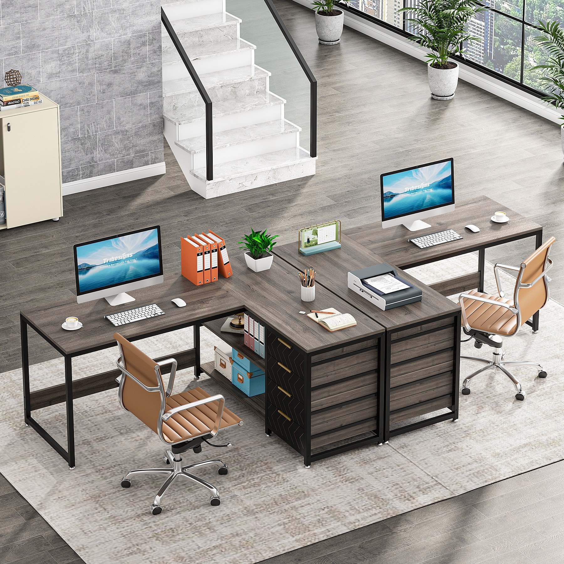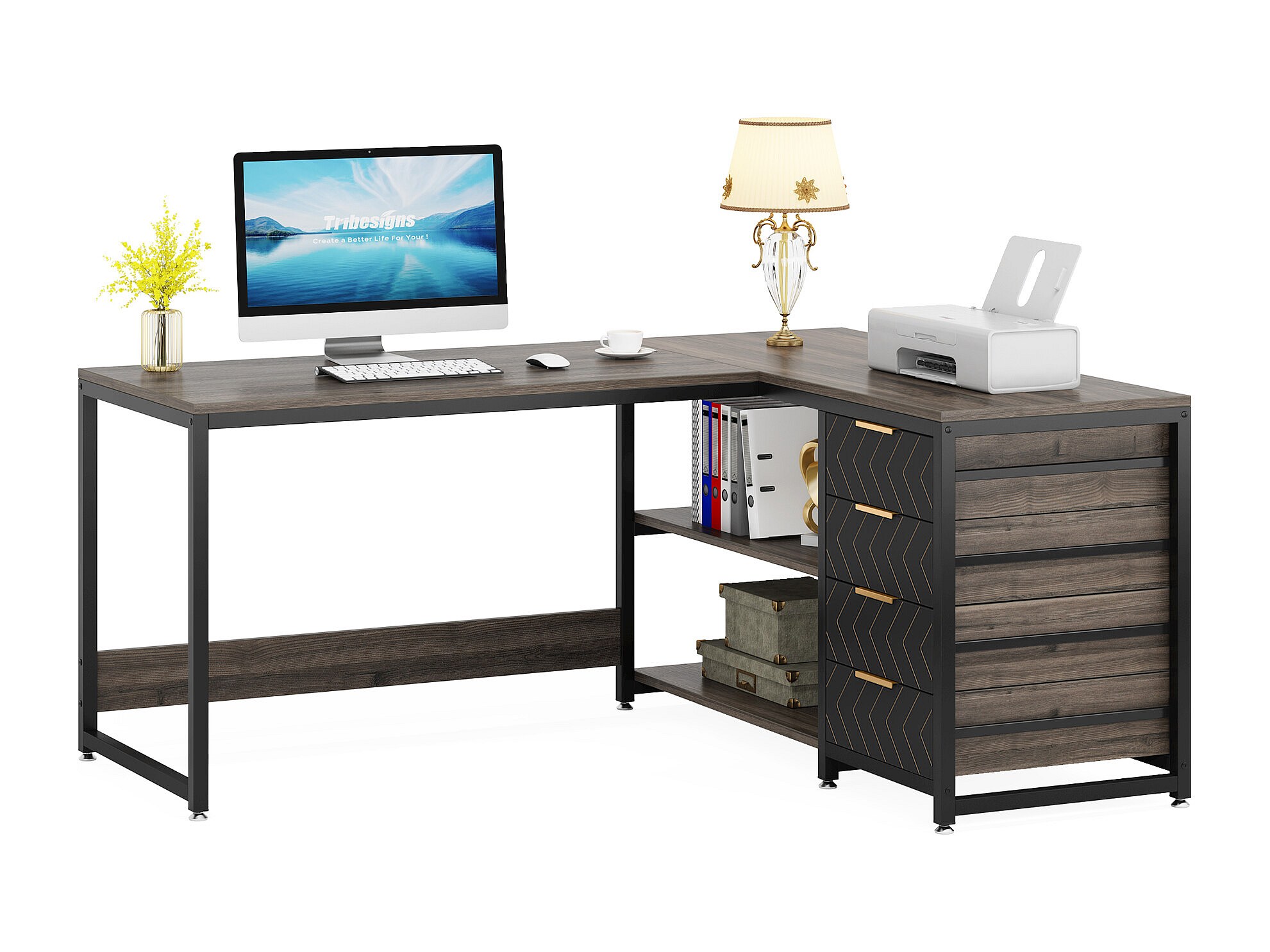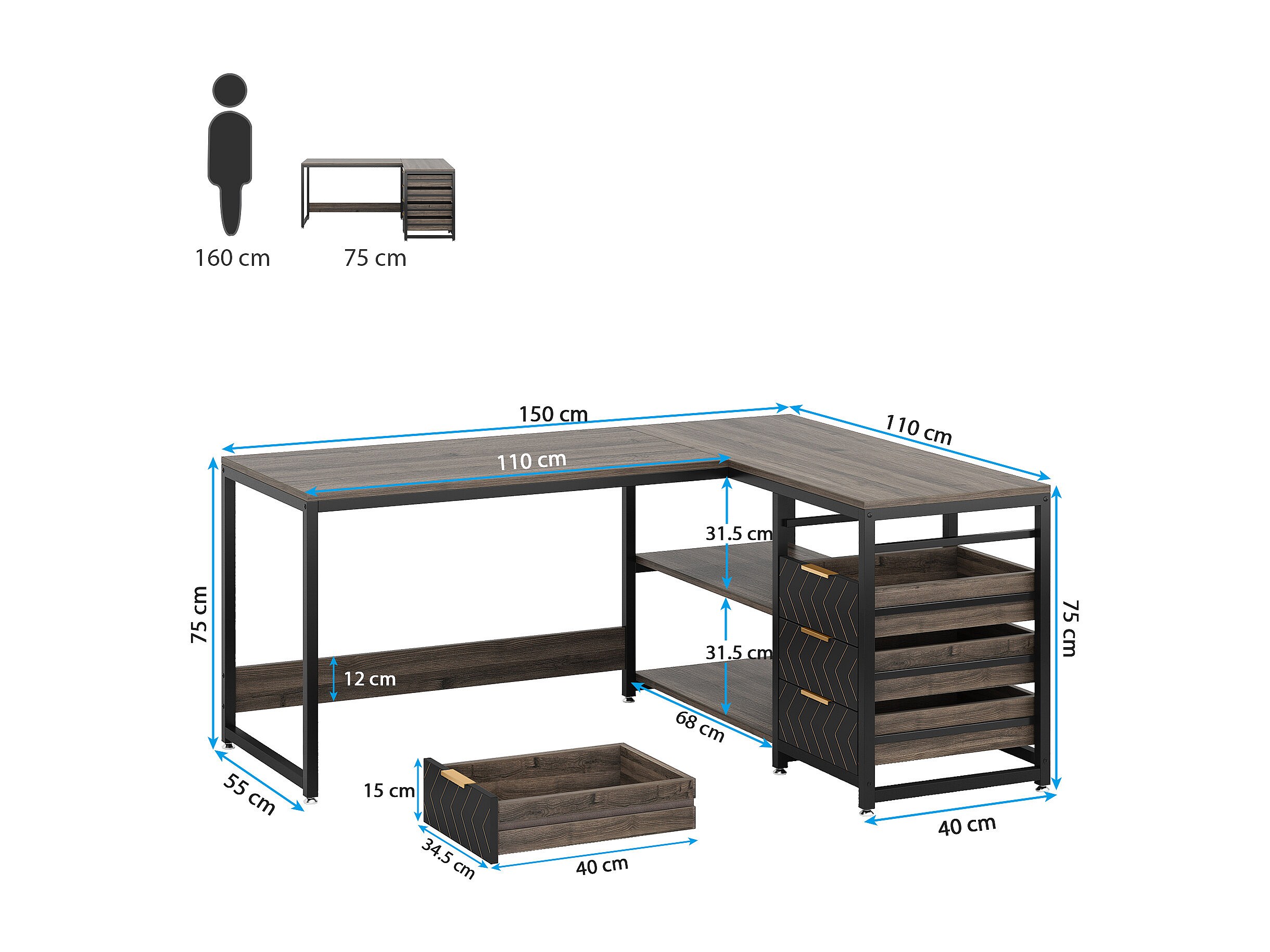 Biurko komputerowe w kształcie litery L z szufladami, biurko narożne z półkami, odwracalne biurko w kształcie litery L