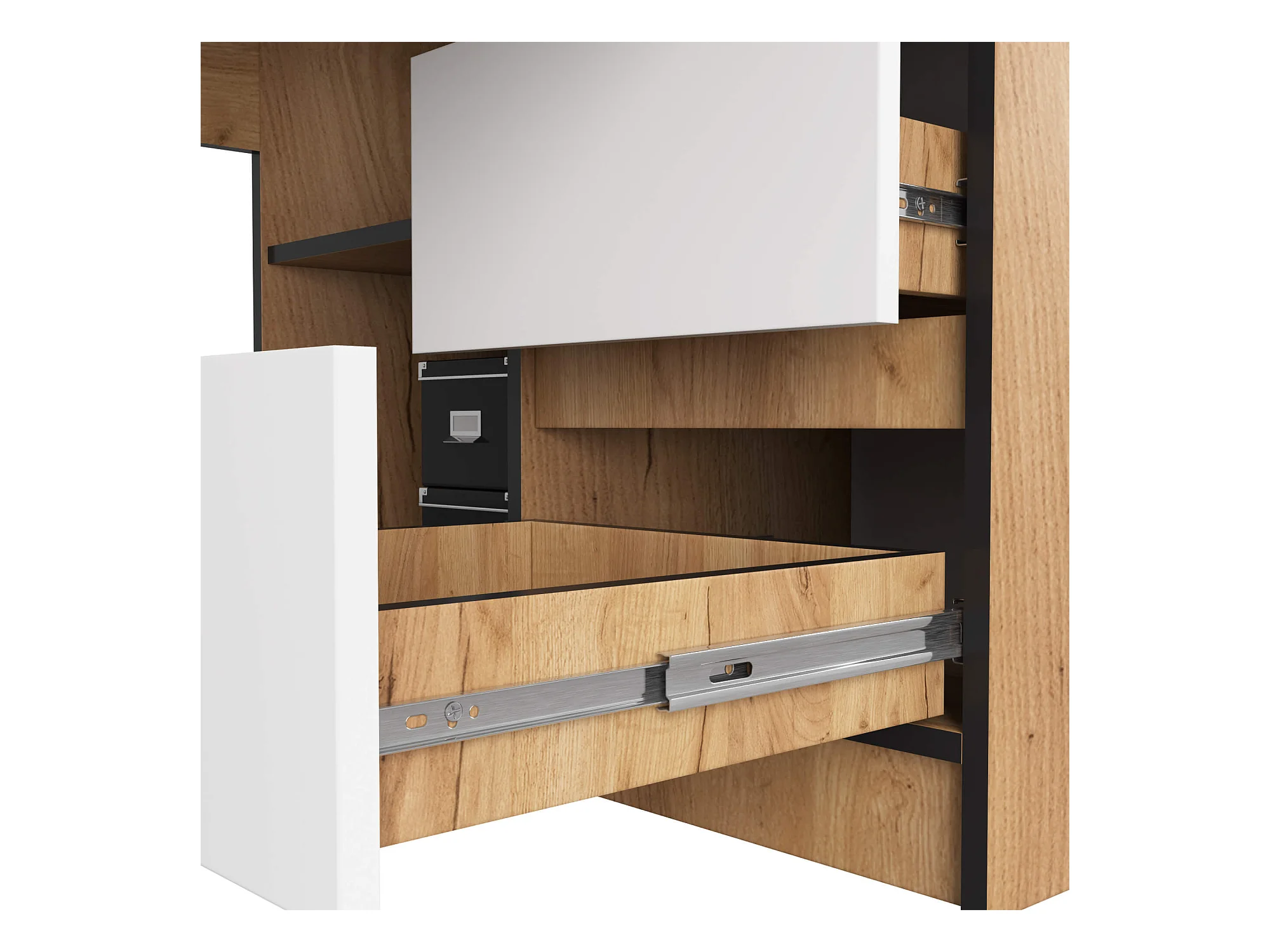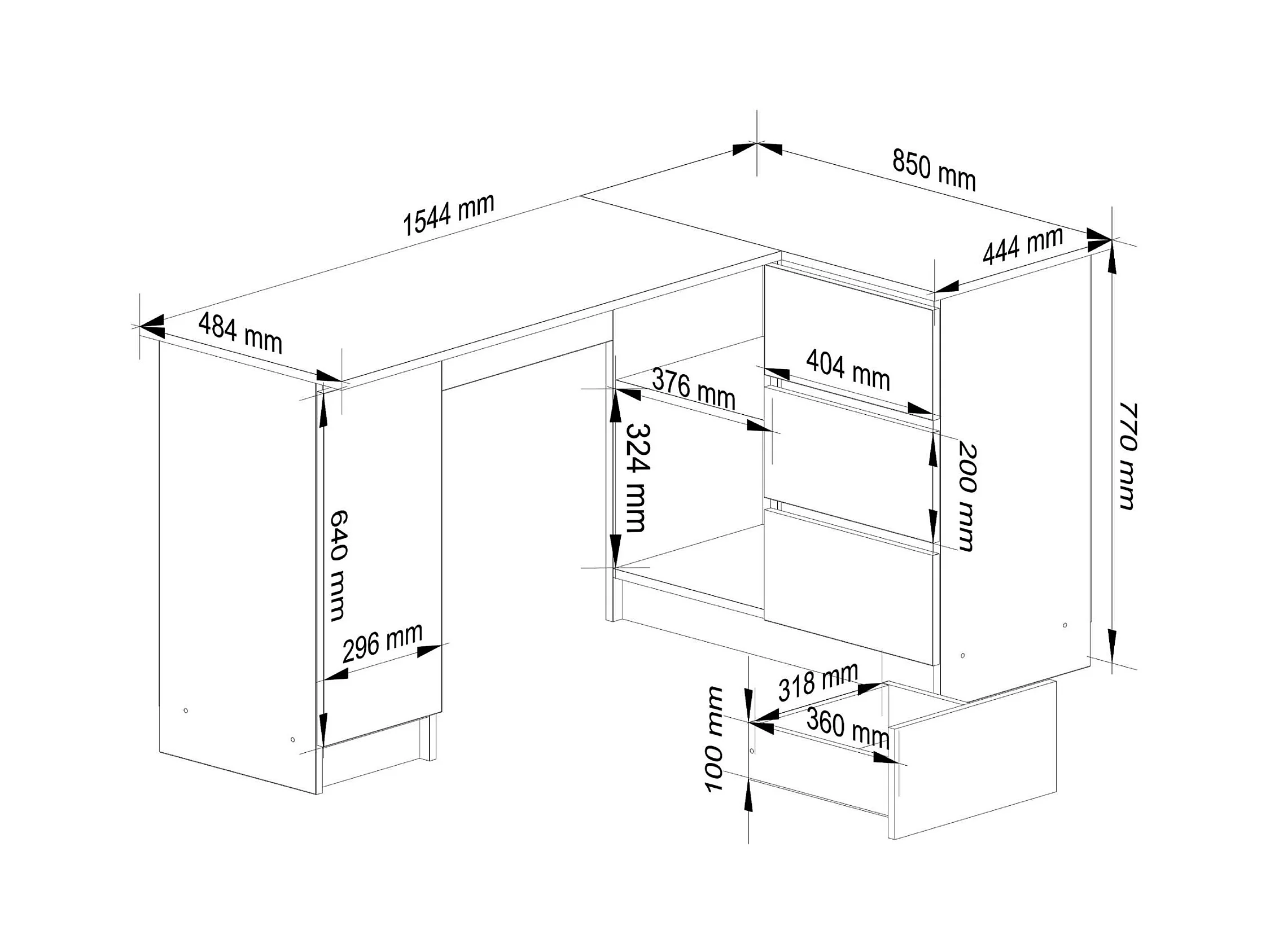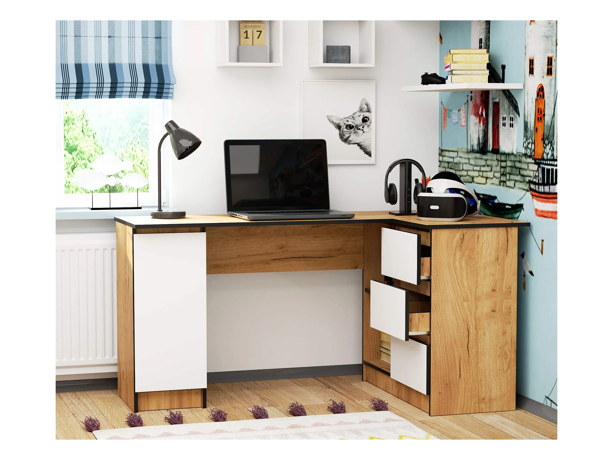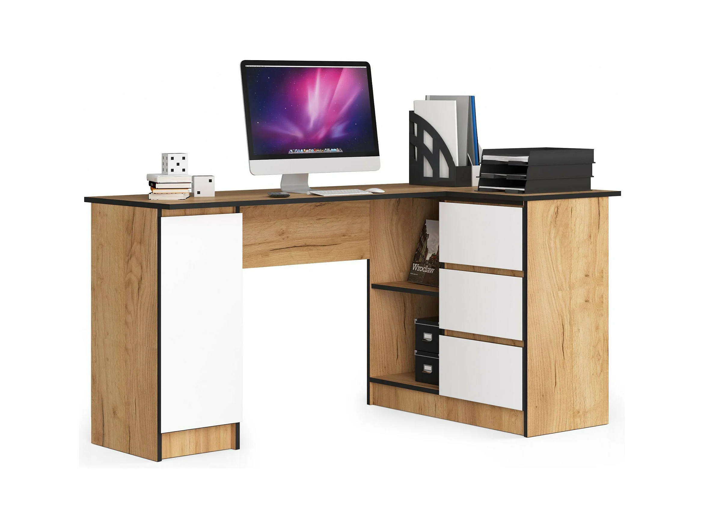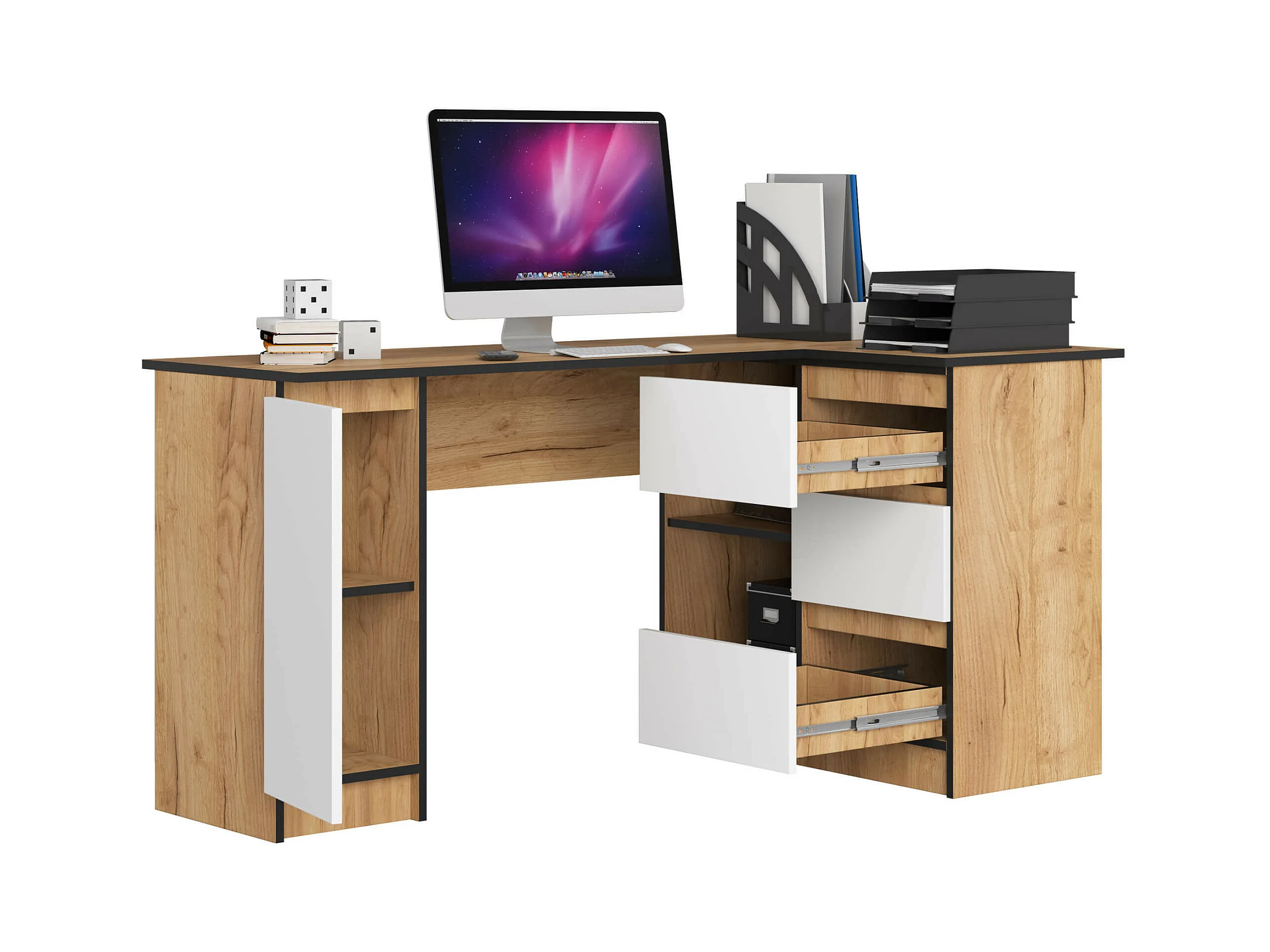 Biurko narożne AKORD B20 Dąb Craft 155 cm prawe 1 drzwi 3 szuflady kolor Biały mat 4 półki 155x85x77 cm