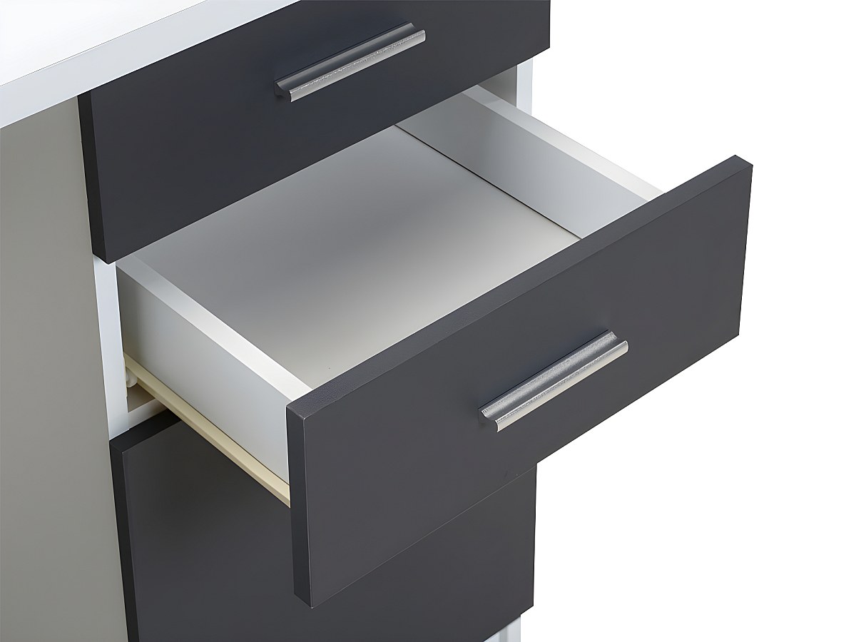 Biurko narożne NORWY pomoże wykorzystać każdy zakątek pomieszczenia. Narożna konstrukcja pozwala na optymalne wykorzystanie wnętrza poprzez ustawienie mebla w rogu pokoju. Dzięki szufladom i półkom z łatwością można zorganizować przestrzeń i poprawić warunki pracy. Zestawienie białej i szarej kolorystyki jest jednocześnie proste i nowoczesne, więc nie może się nie podobać.