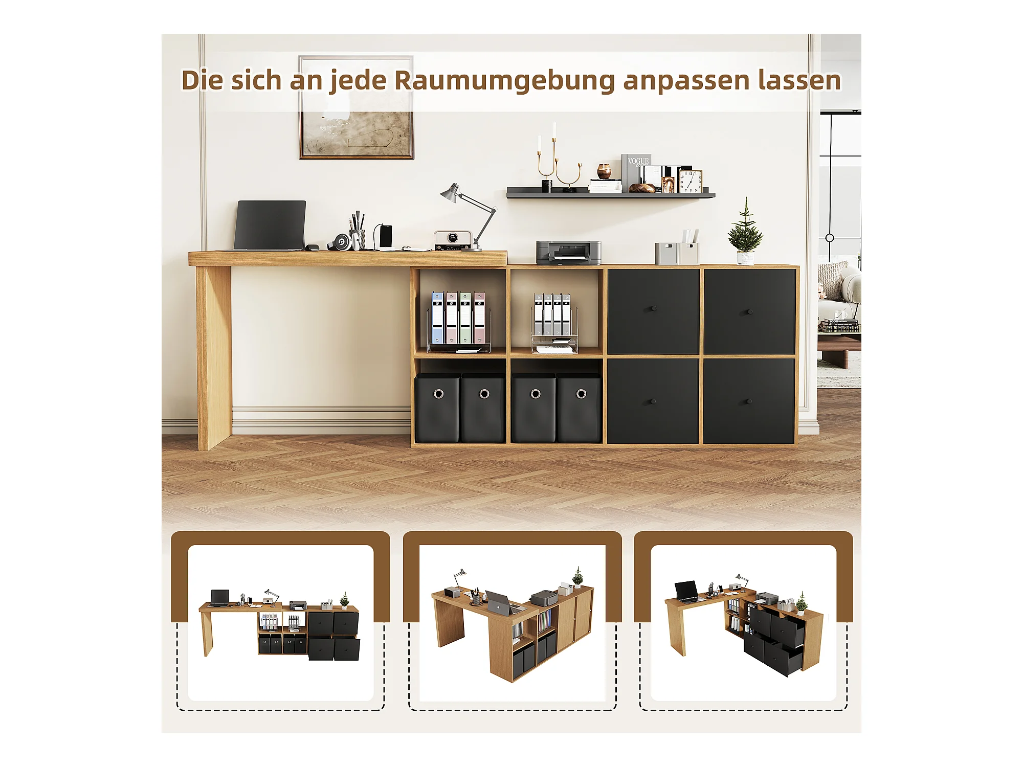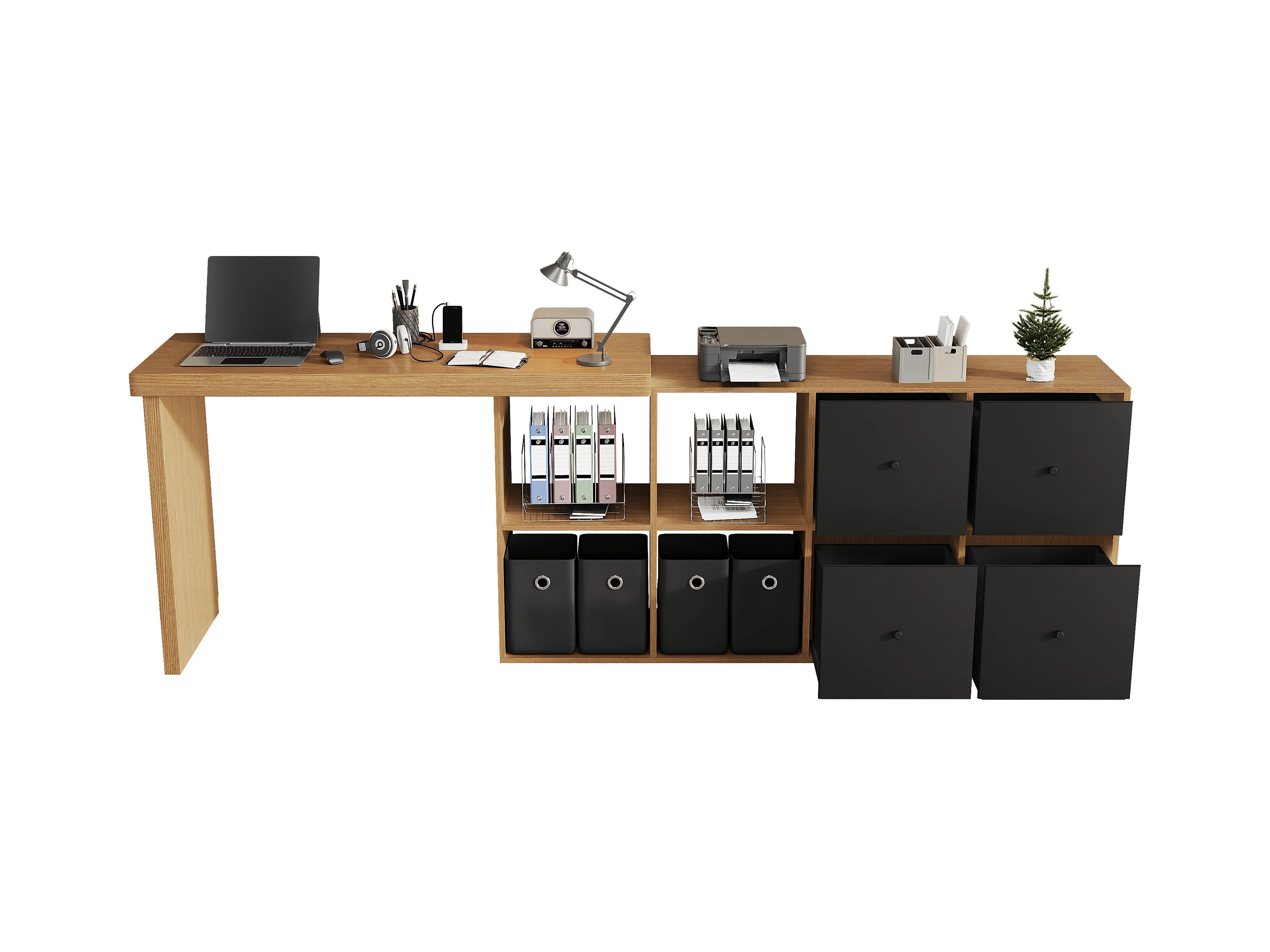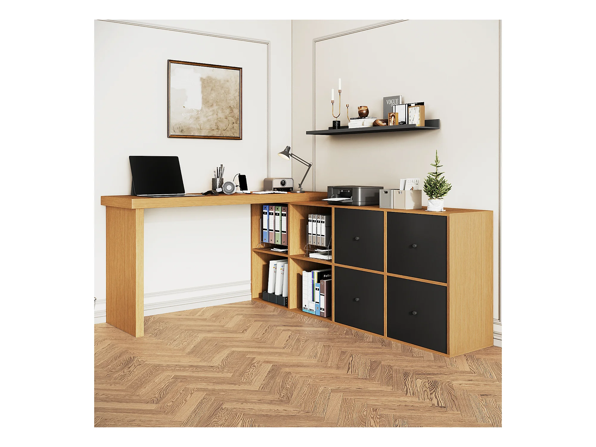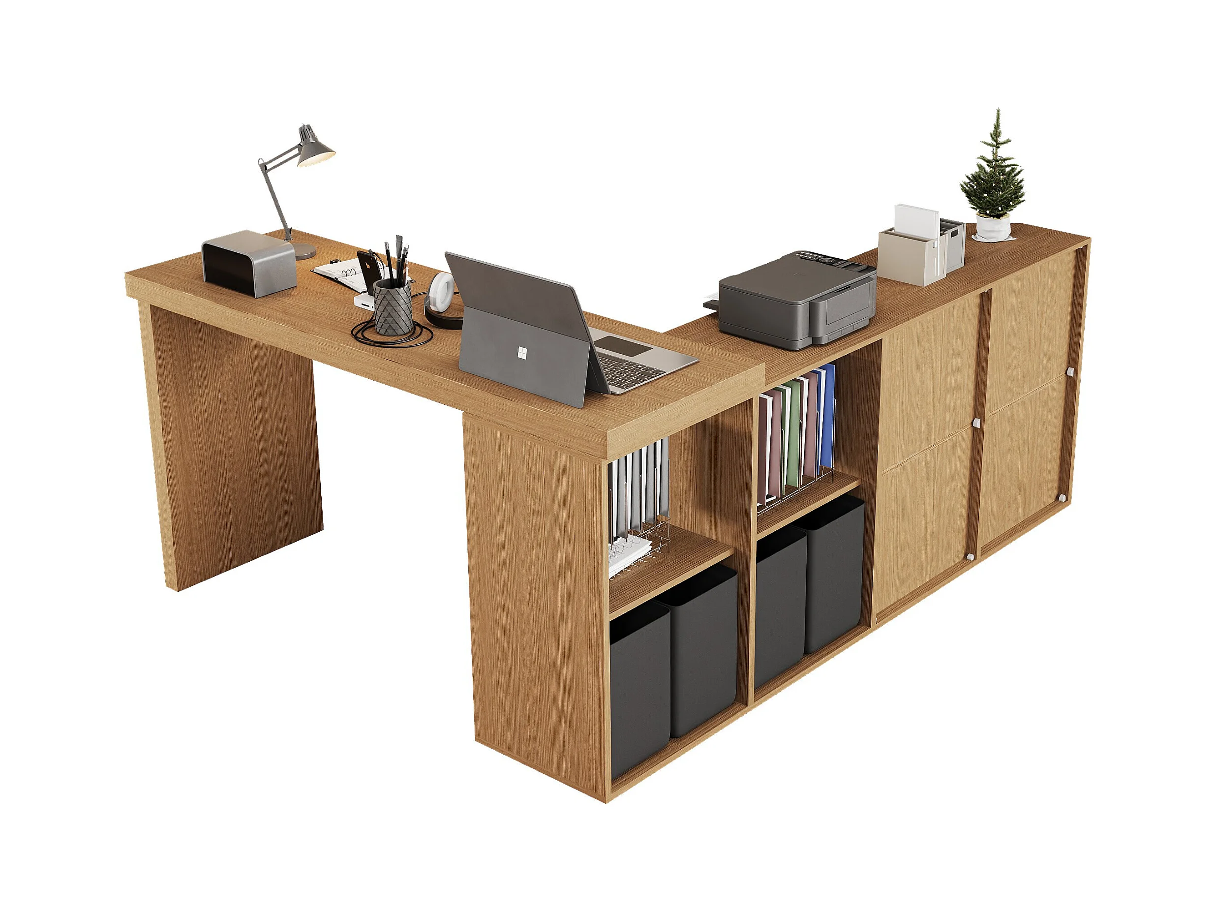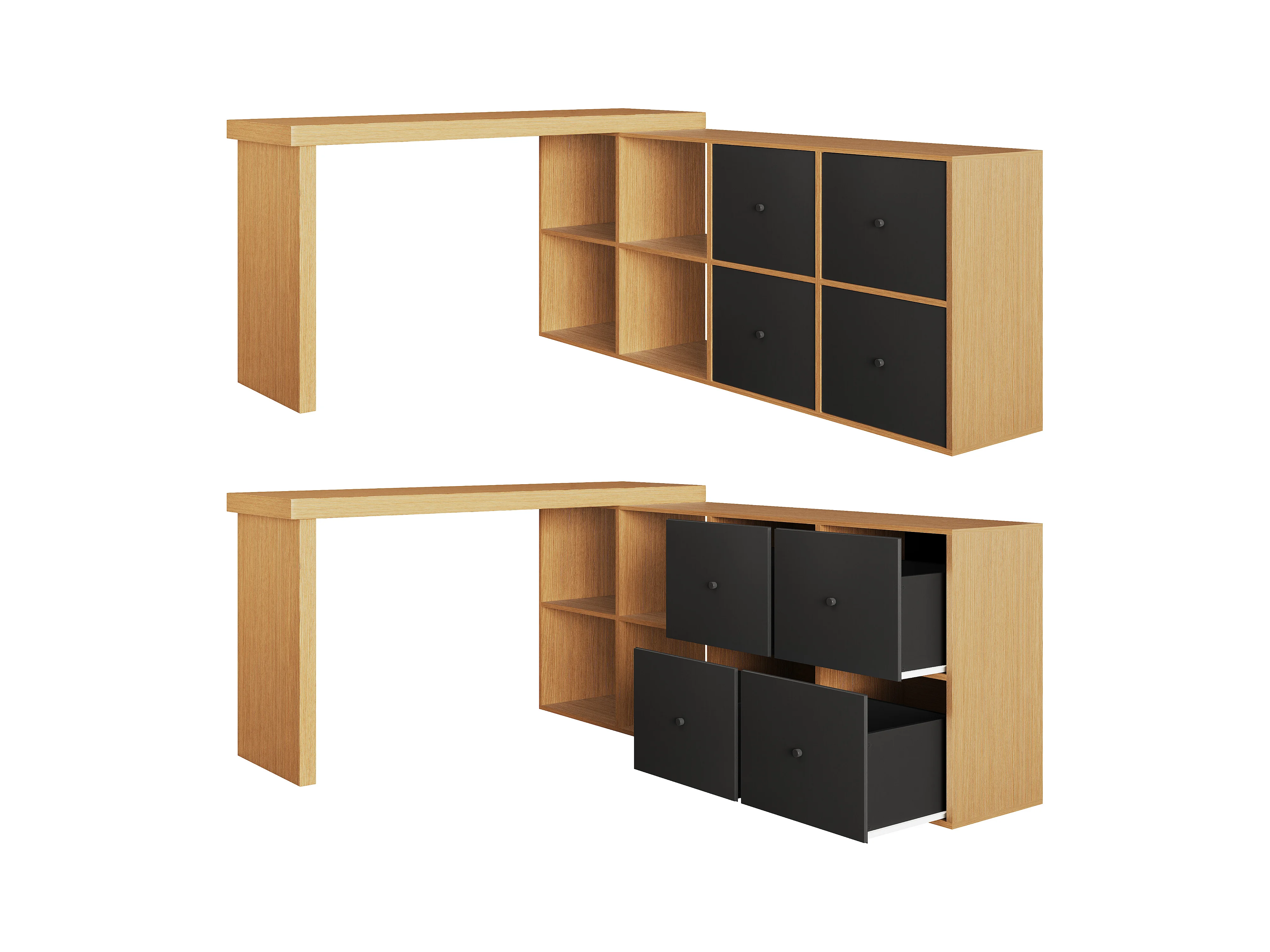 Biurko obrotowe - 140 x 120 x 78 cm - w kształcie litery L lub proste - z 4 półkami + 4 szufladami - płyta MDF - naturalny