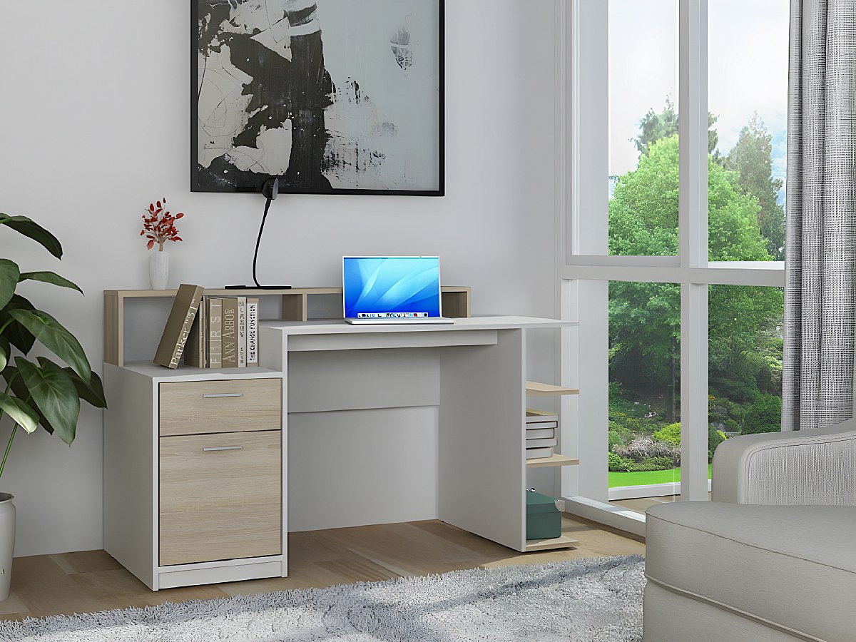 Biurko z półkami ZACHARIE - Kolor: biały i dębowy