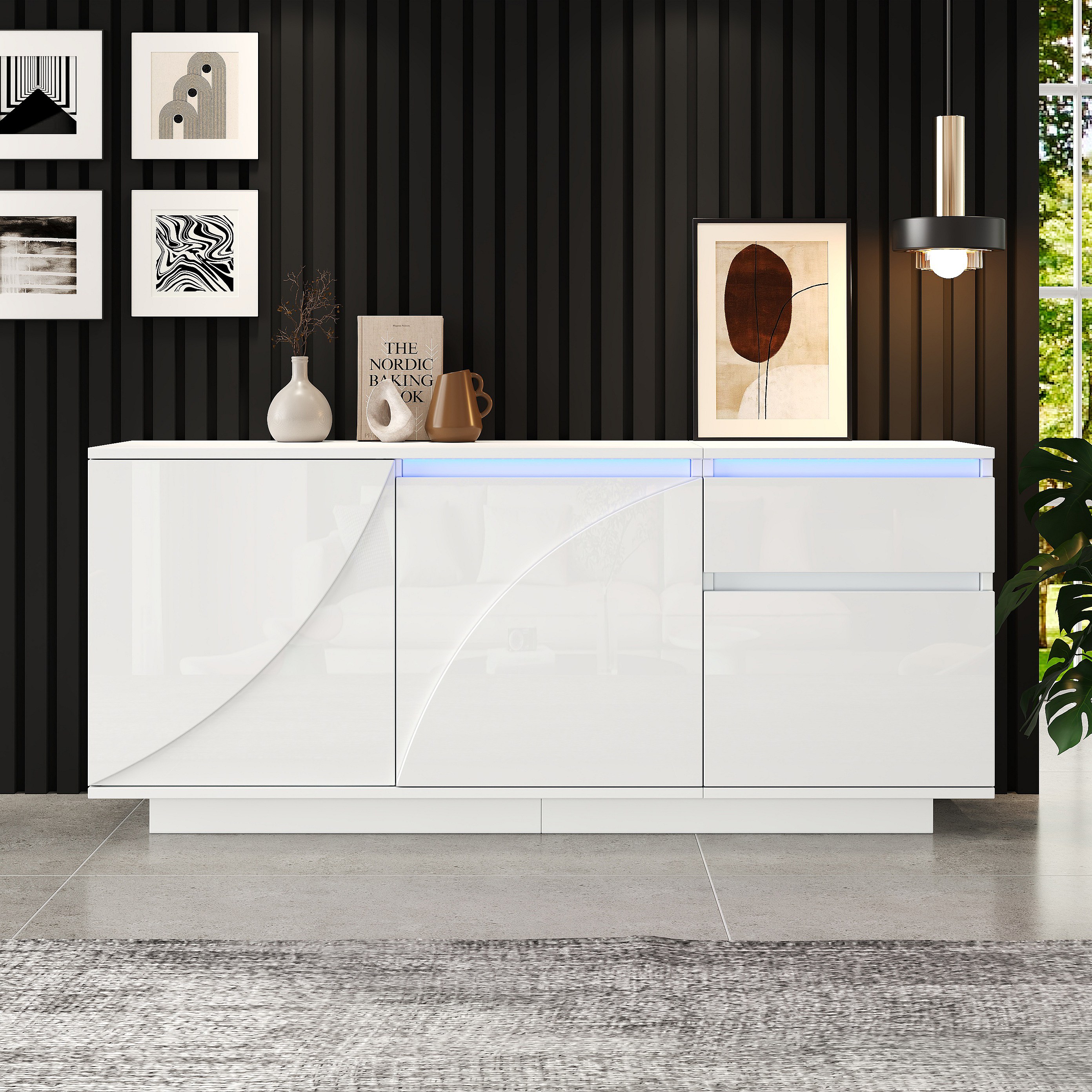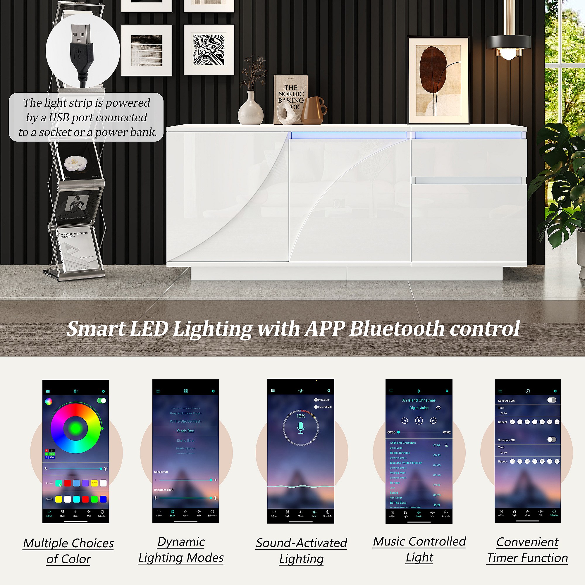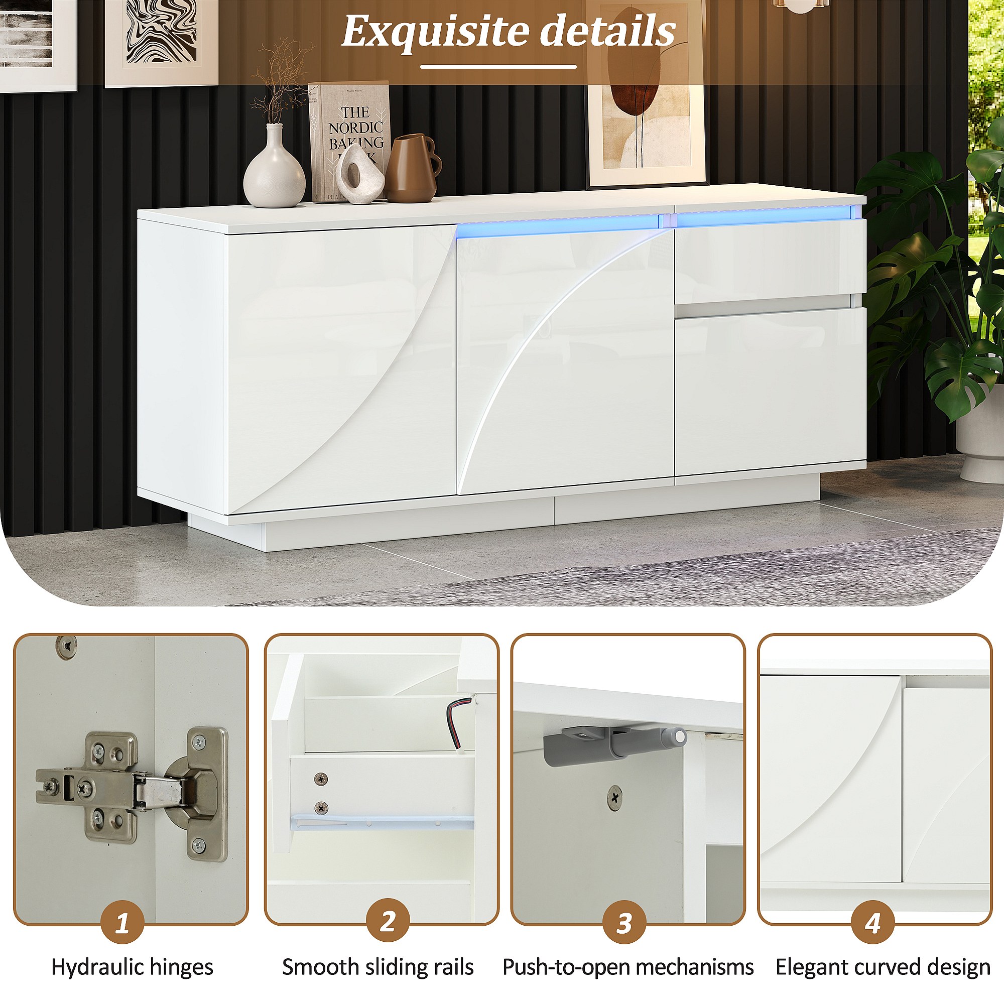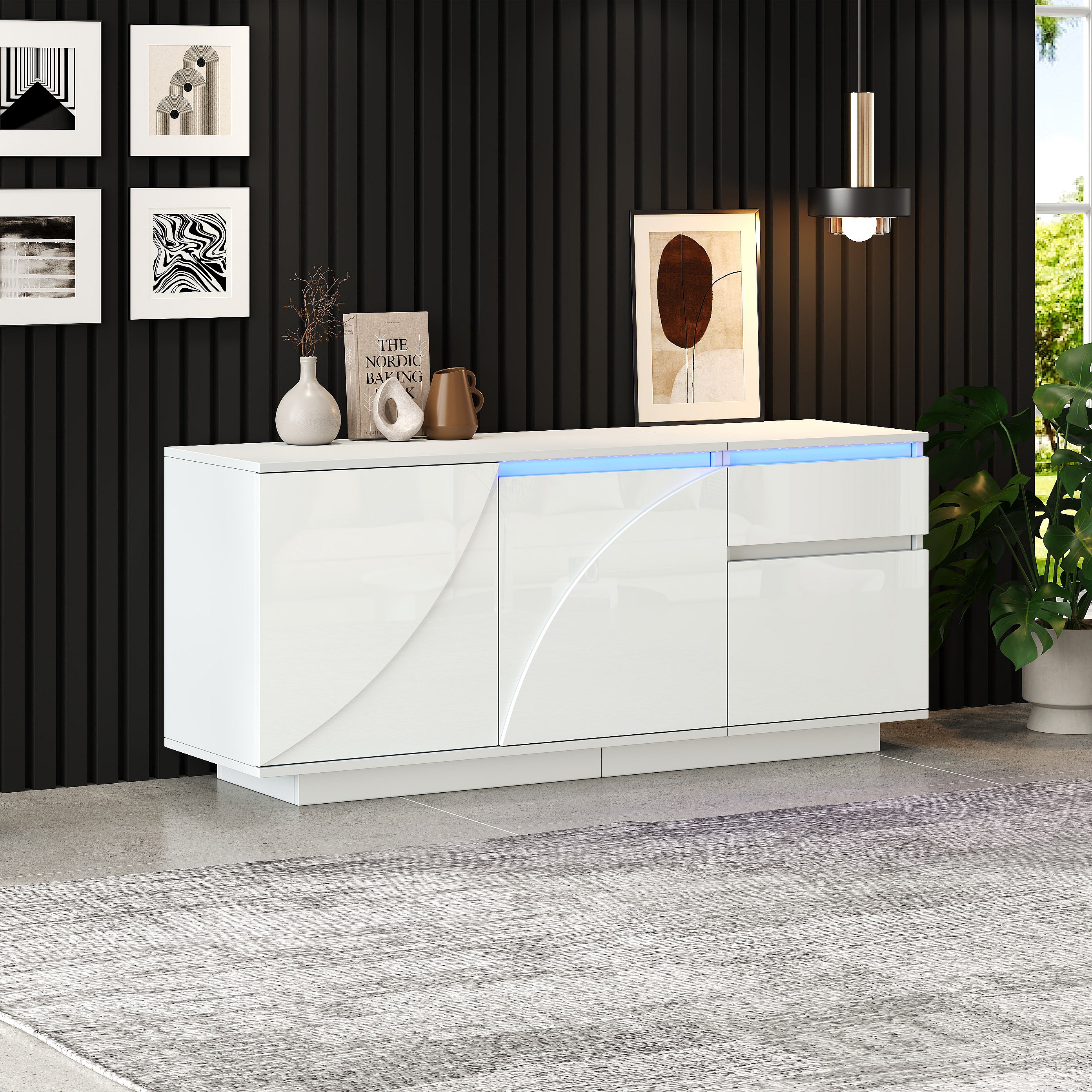 Buffet 140x40x65 cm - 3 szuflady i 2 drzwi - z oświetleniem LED - Błyszczące wykończenie - Biały