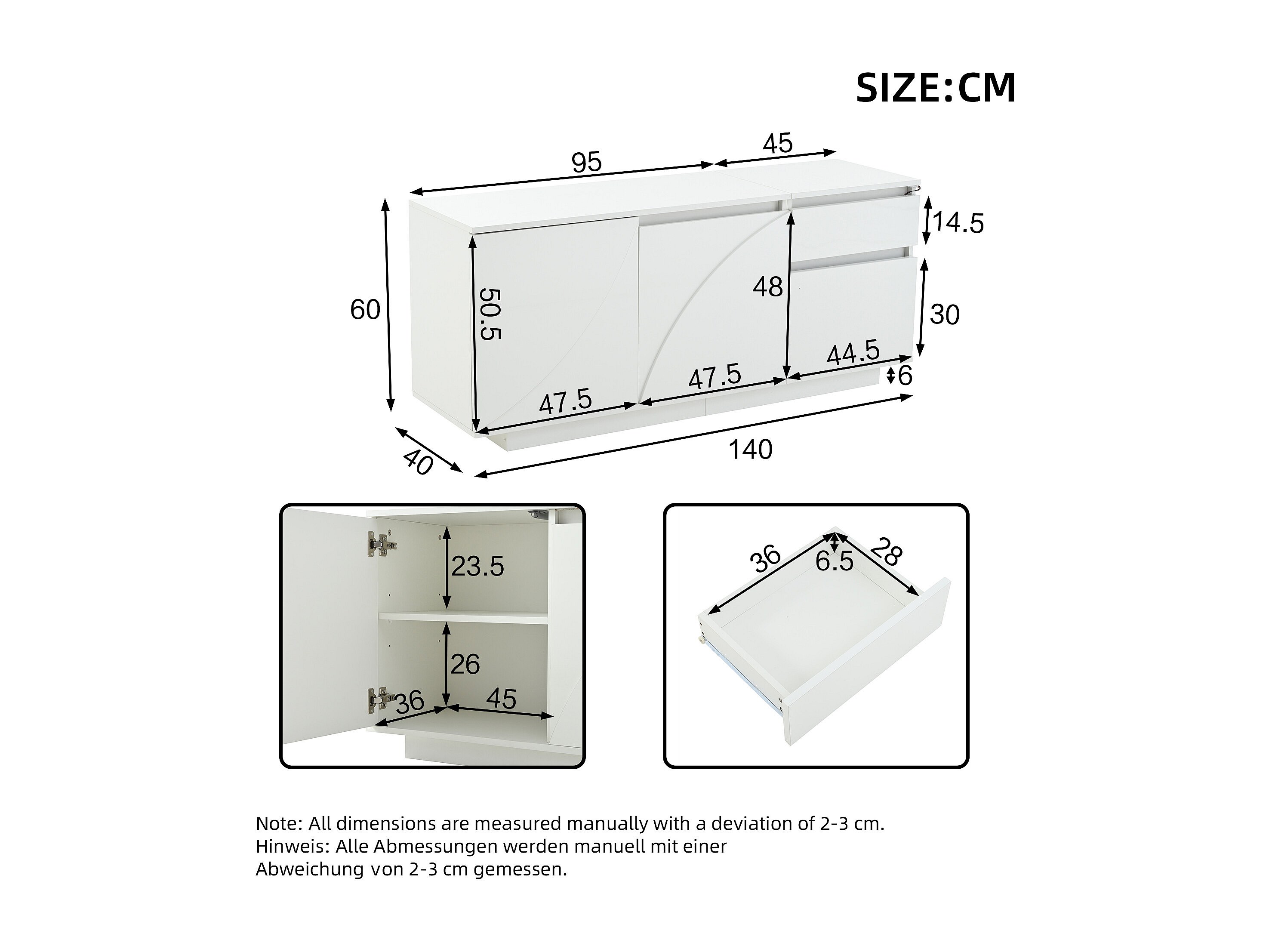 Błyszczący bufet 140×35×72 cm - 2 drzwi i 3 szuflady - z oświetleniem LED - z regulowanymi półkami - biały