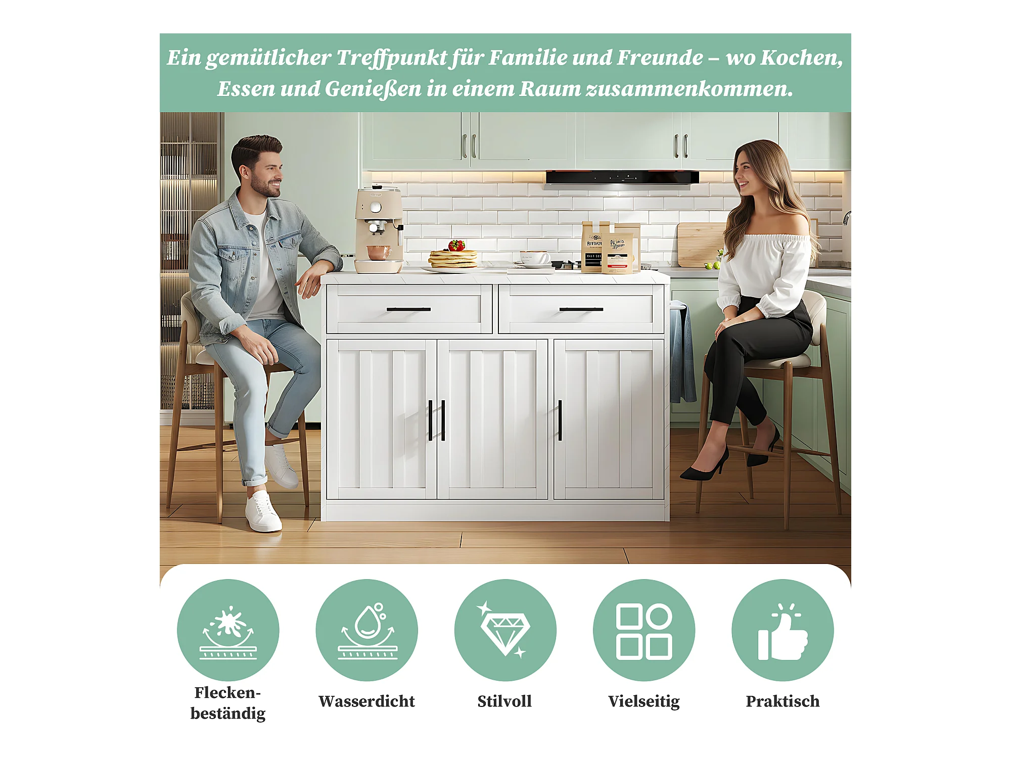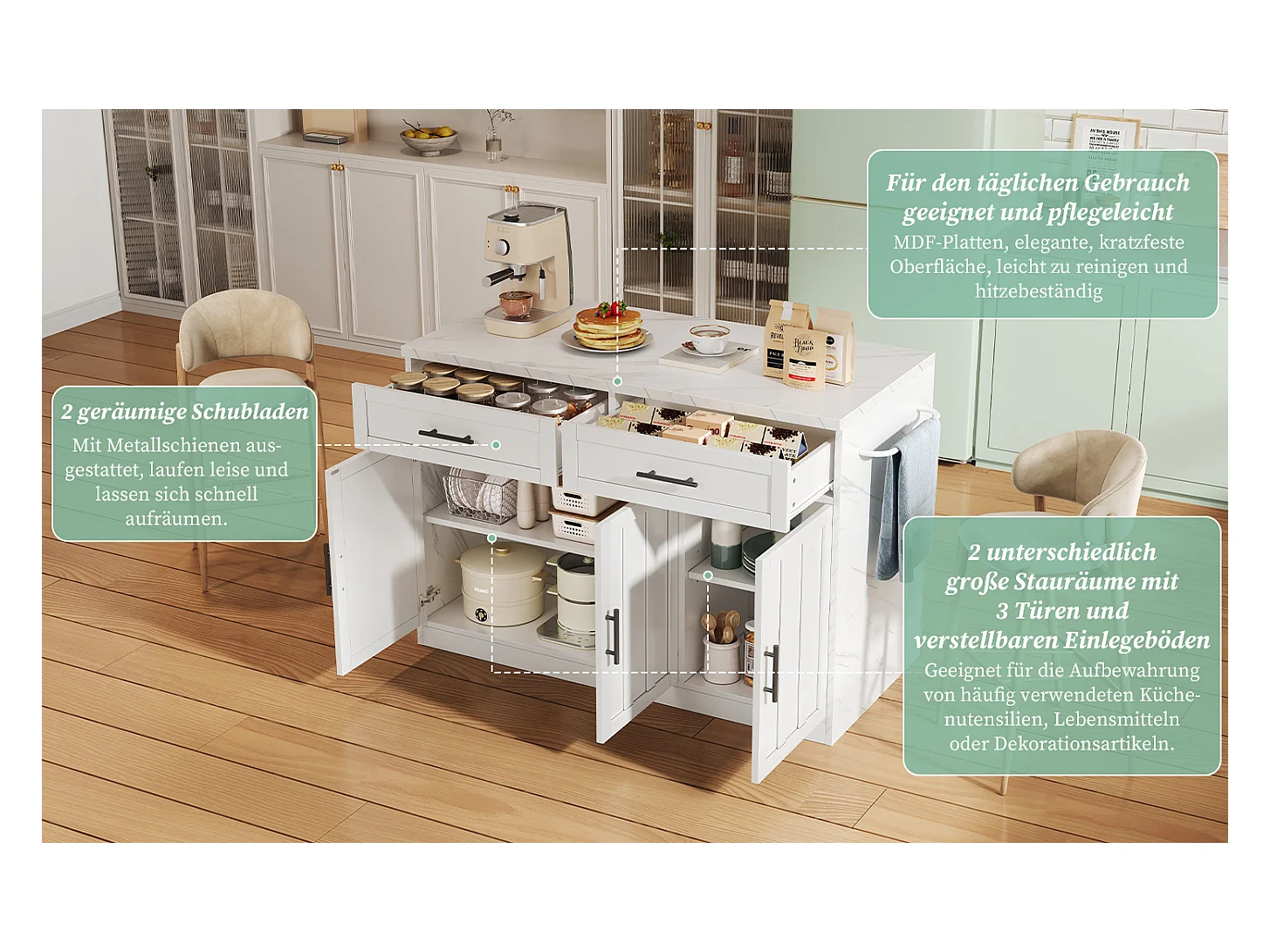 Mobilna wyspa centralna z wysuwanym blatem + 2 szuflady + 4 drzwi - 136 x 45/70 x 92 cm - MDF - biała