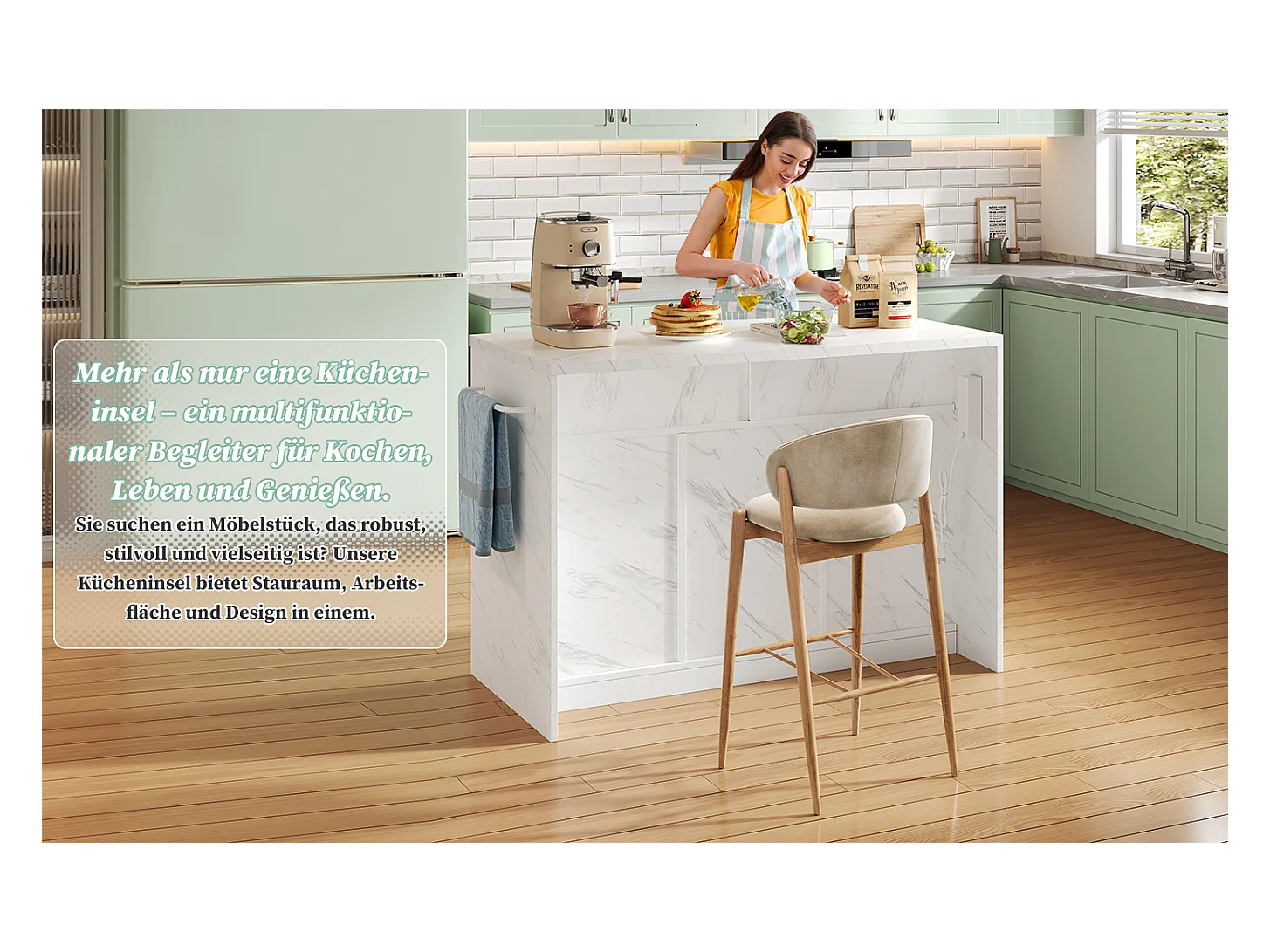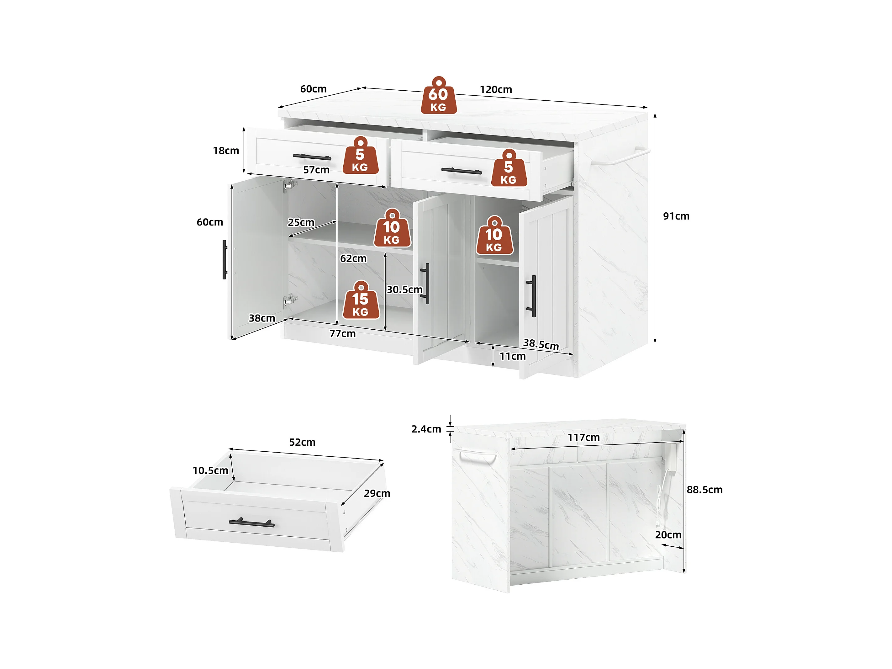 Centralna wyspa kuchenna z 3 drzwiami + 2 szufladami - 120 x 60 x 91 cm - z gniazdkami + USB - MDF - biała